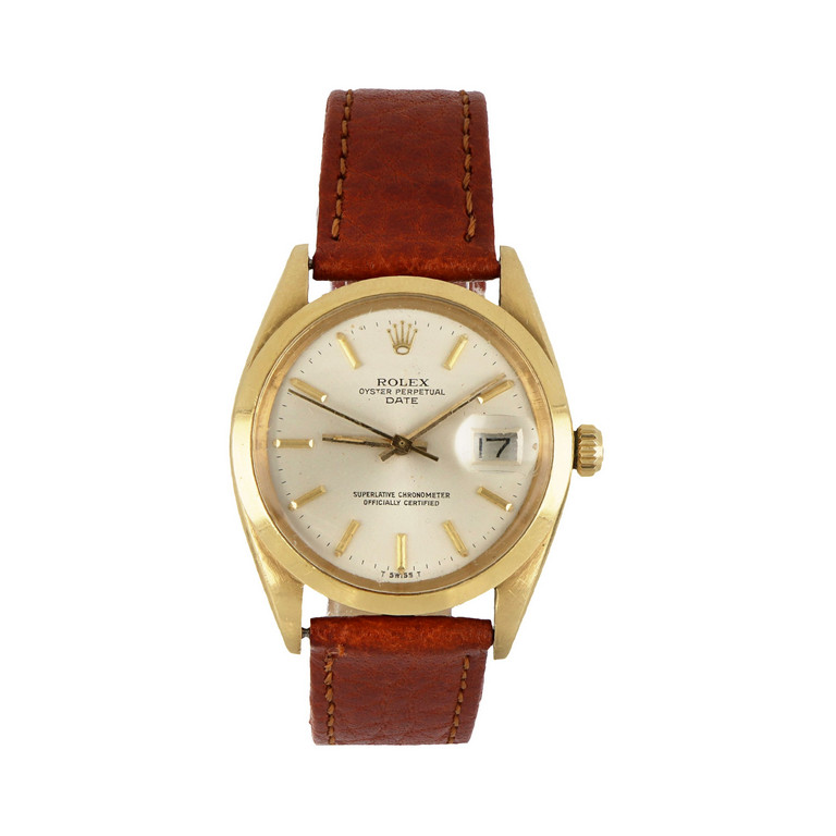 Rolex orologio da unisex in oro giallo modello Date referenza 1500 lunetta liscia quadrante argetè indici a barretta sfere a bastone vetro plastica.