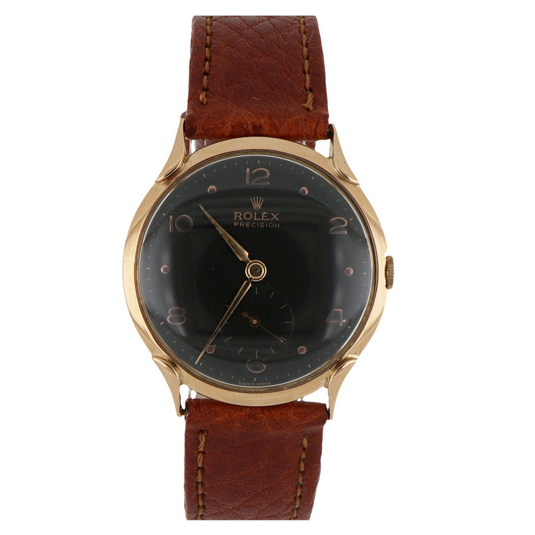 Rolex orologio da uomo in oro rosa fascinoso quadrante nero opaco con indici alternati a numeri arabi e dots animato da movimento meccanico a carica manuale.