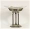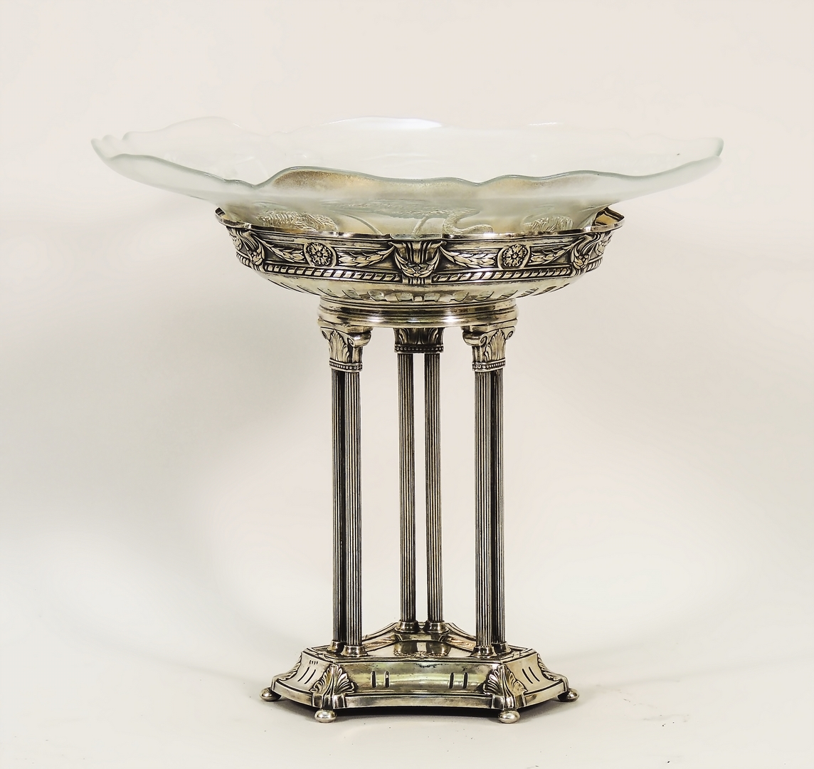 ALZATA IN ARGENTO - SILVER AND GLASS PEDESTAL BOWL periodo Liberty - Art Nouveau corpo traforato e sbalzato con festoni e ghirlande, fusto a colonne con capitelli, su base sagomata e sbalzata con foglie d'acanto, coppa in vetro non pertinente gr 660