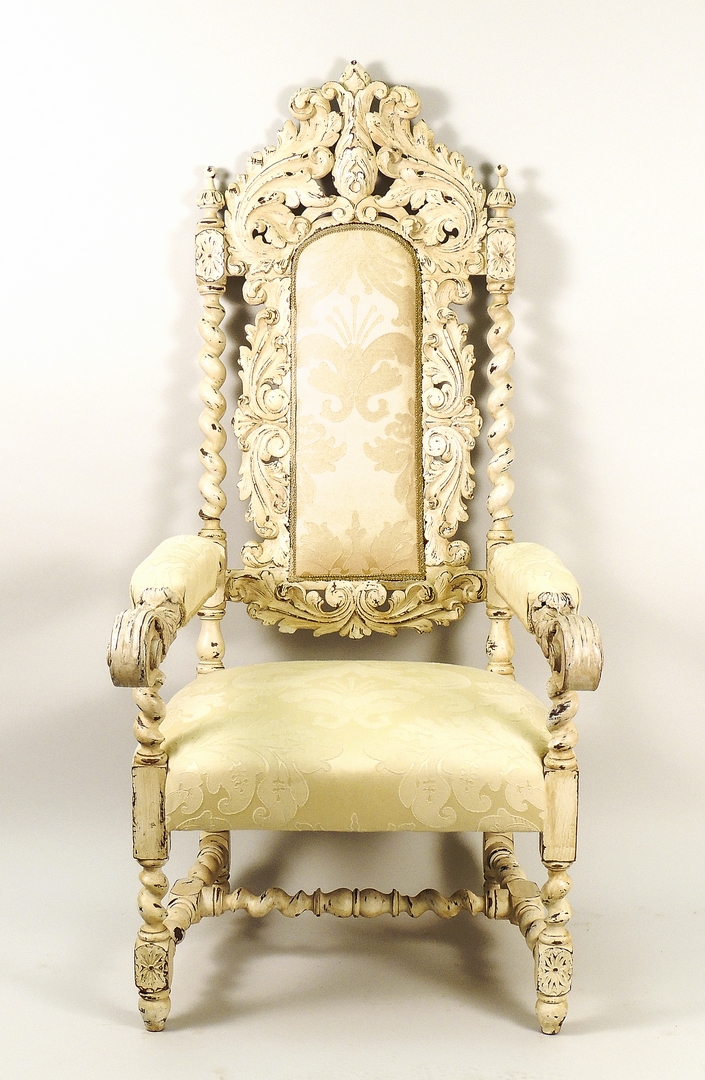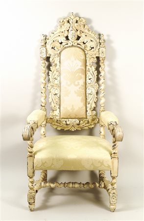 GRANDE SEGGIOLONE IN LEGNO LACCATO BIANCO - HIGH WHITE LACQUERED WOODEN ARMCHAIR schienale sorretto da due montanti a torciglione riccamente intagliato con volute e girali, braccioli con finale a ricciolo, gambe a rocchetto riunite da traverse, seduta imbottita e rivestita in damasco color crema