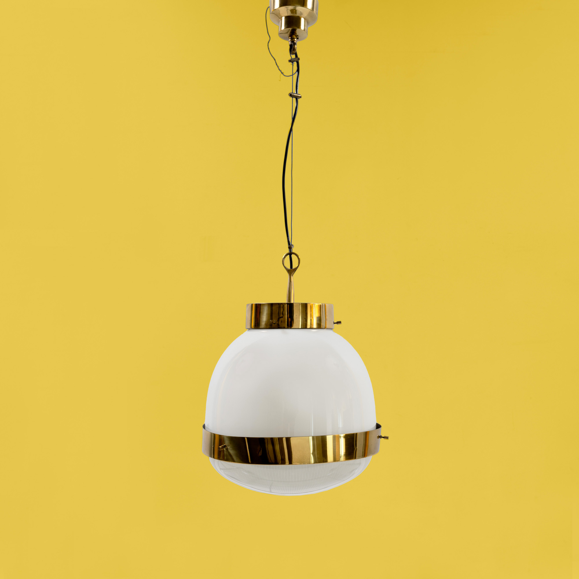 Lampada a sospensione modello "Delta" grande, con elementi in ottone e diffusore in vetro opalino.