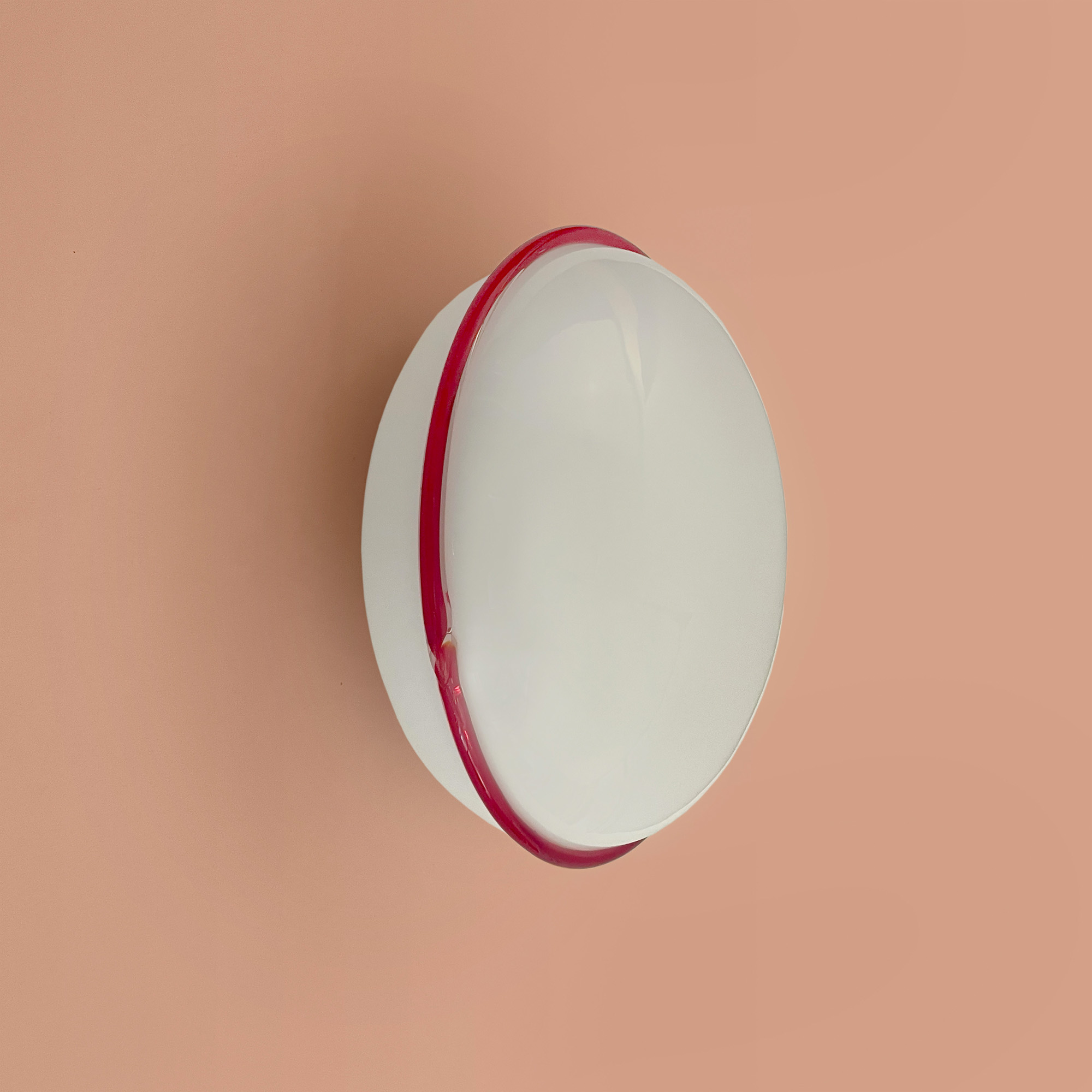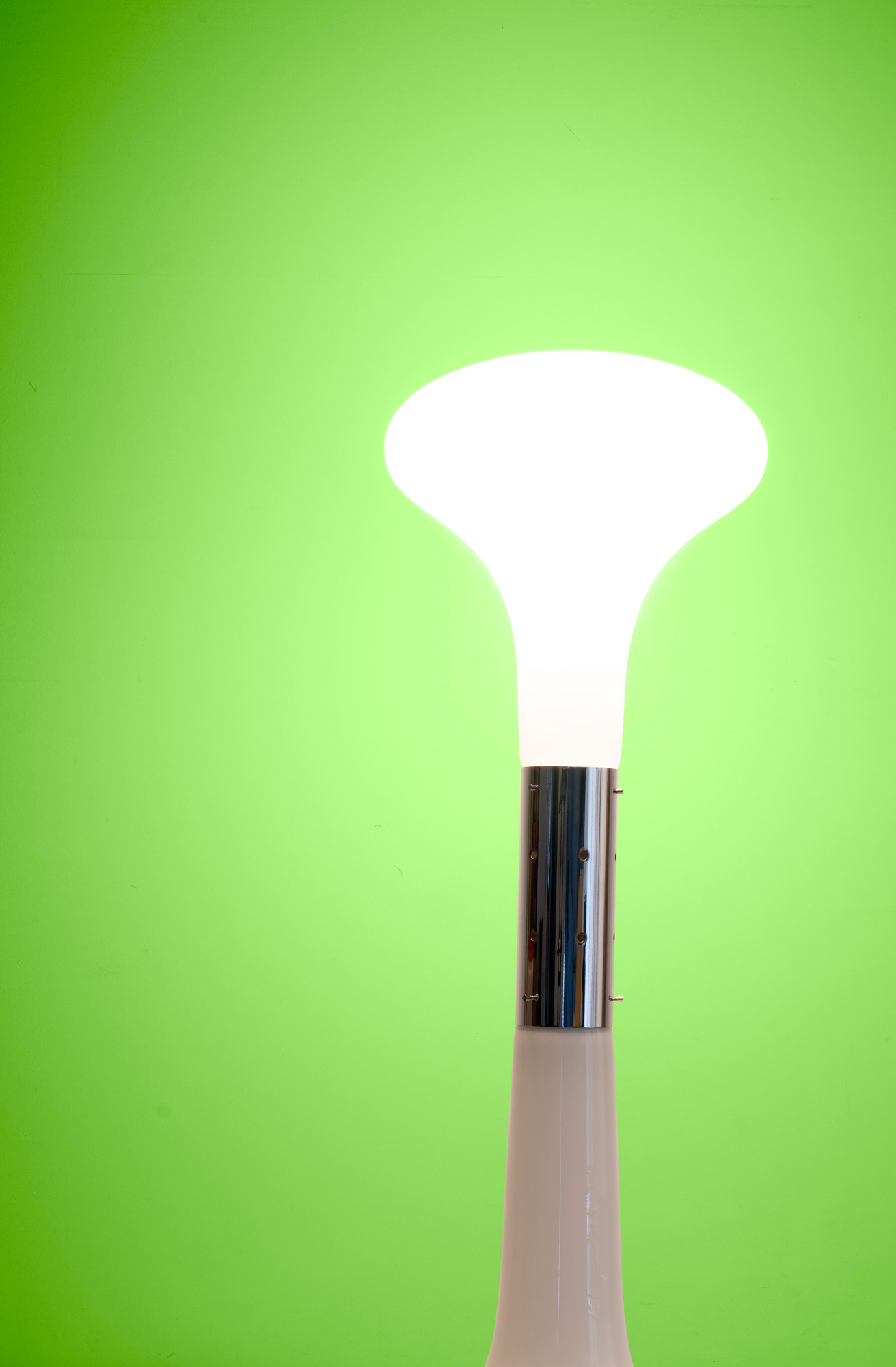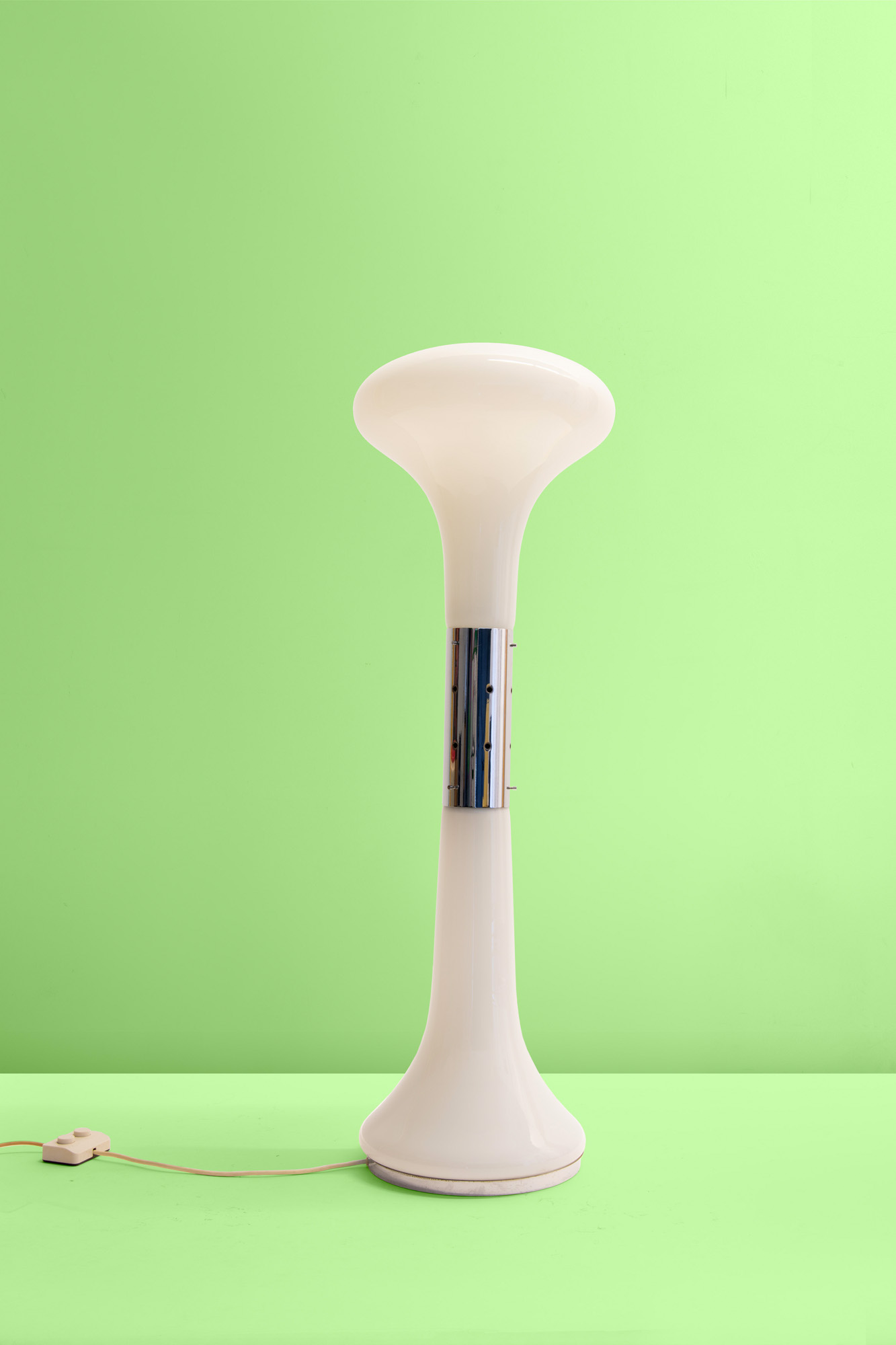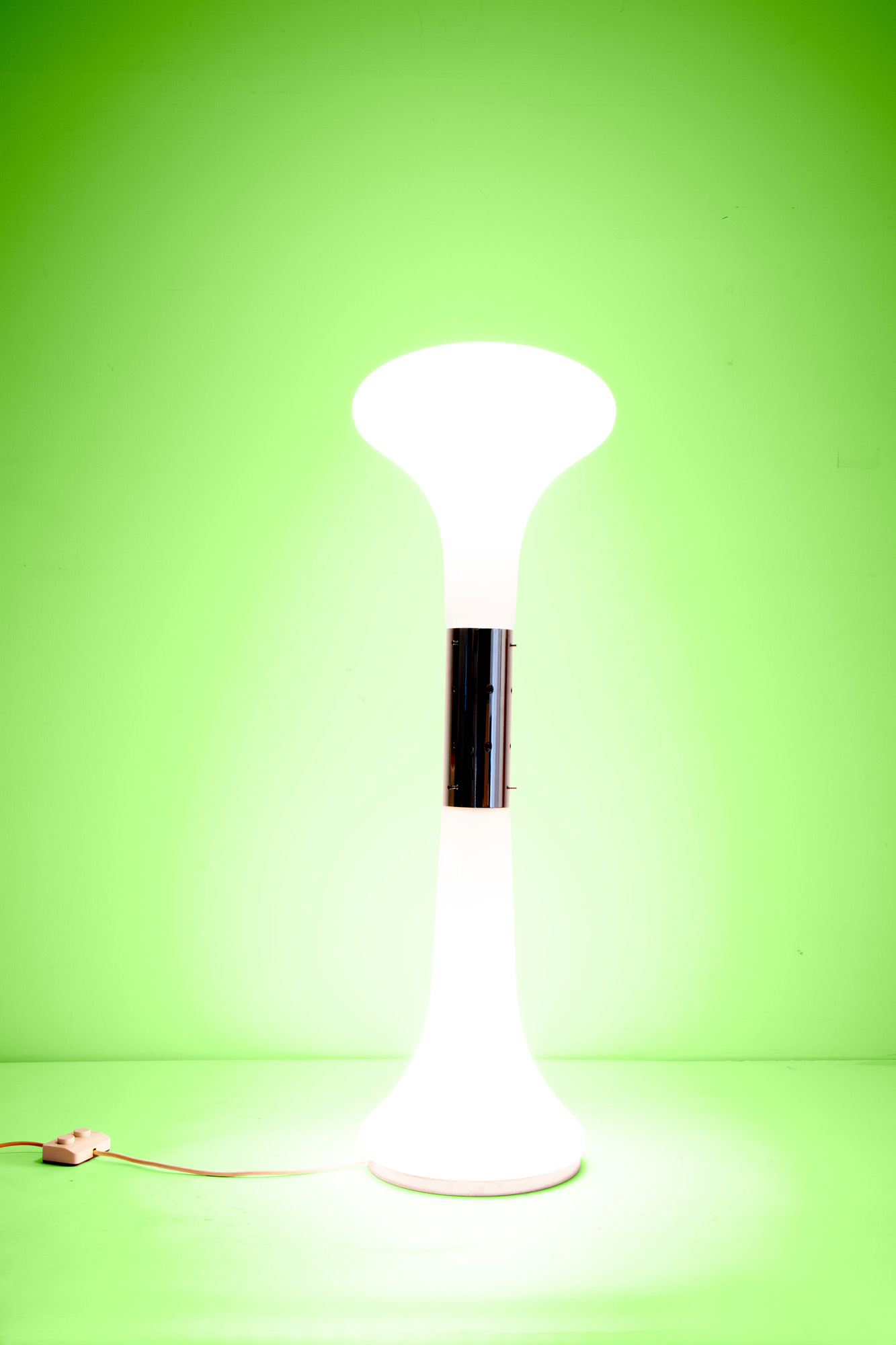 Lampada da terra in vetro di Murano con corpo centrale cromato.