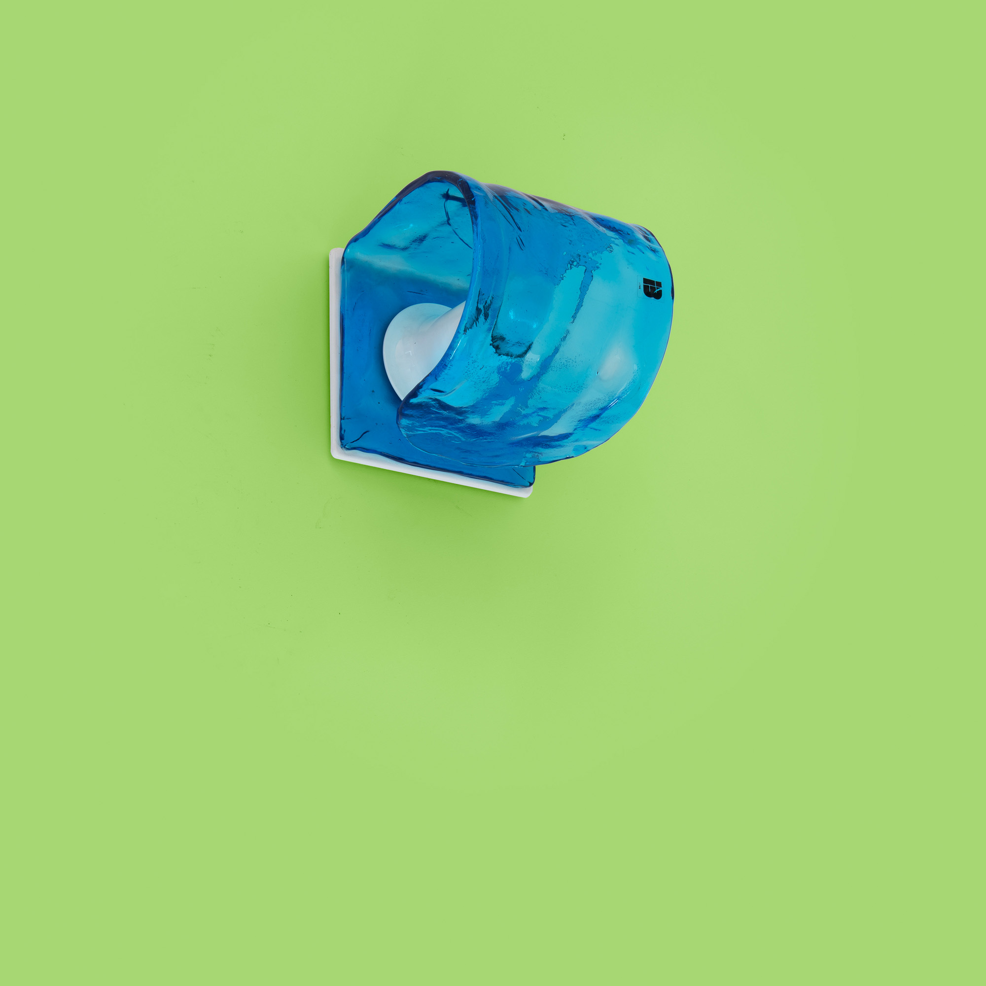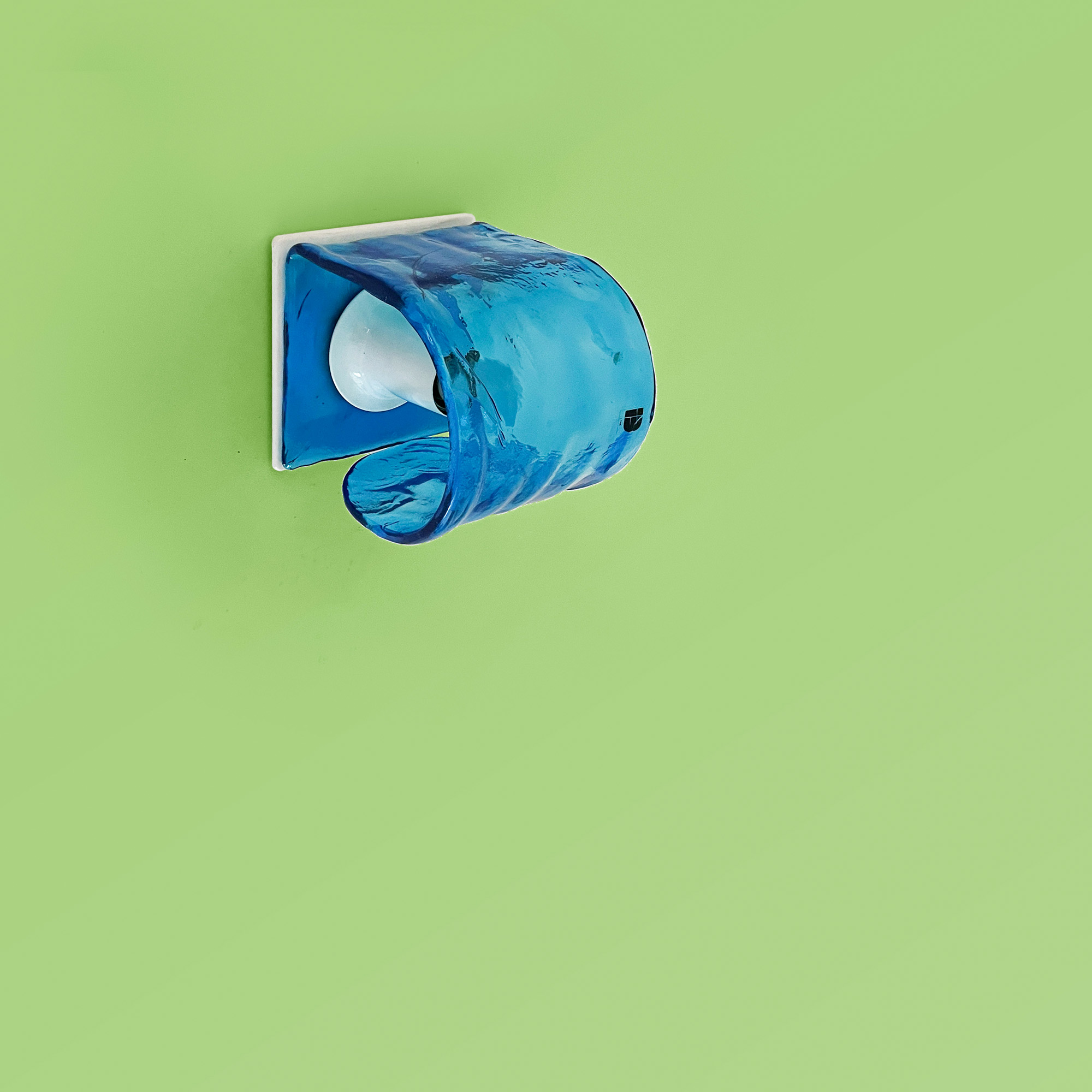 Lampada da parete in vetro di Murano blu, colato e curvato, su base in metallo bianco.