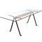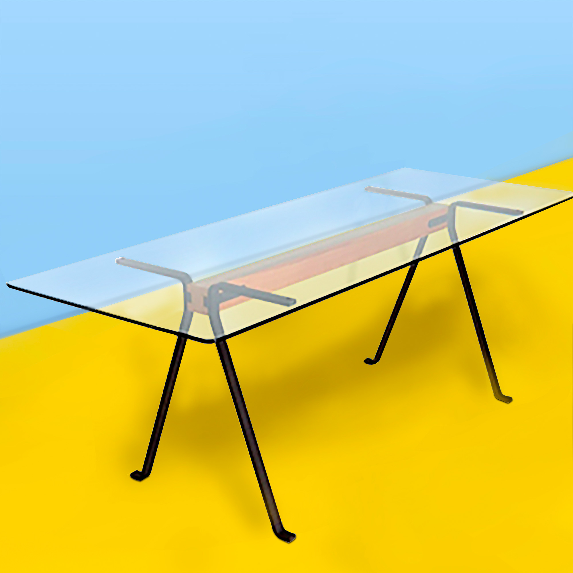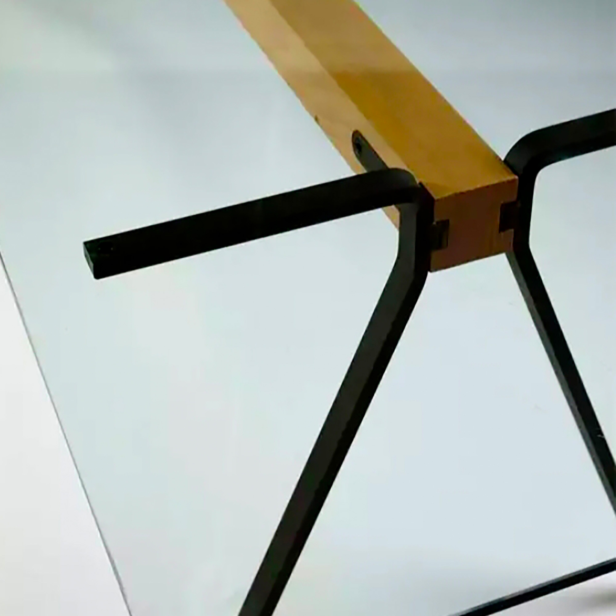Tavolo con struttura in ferro e legno massello di faggio, piano in cristallo trasparente.