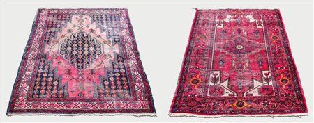 DUE TAPPETI CAUCASICI - TWO CAUCASIAN RUGS uno fondo blu e rosso, campo a motivi geometrici nei toni del rosso e del beige, grande medaglione centrale, difetti; l'altro fondo rosso, campo con disegni geometrici con toni del beige, blu e giallo, difetti cm 194x133 e cm 198x127