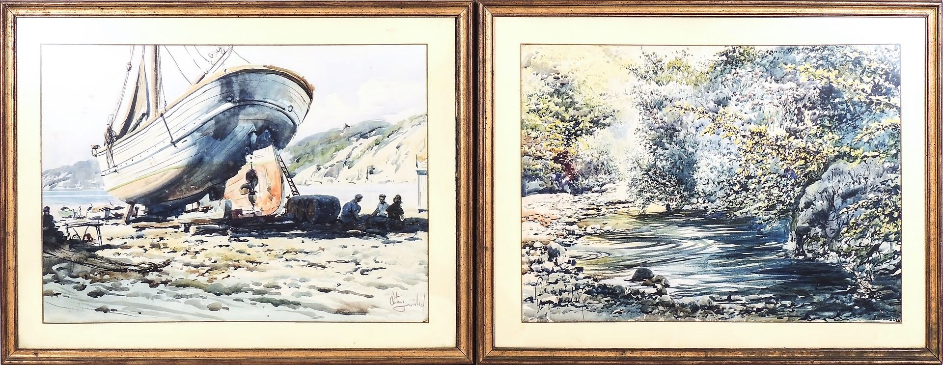 MICHELE ORTINO (1914-1978) Scorcio di laghetto - Landscape with a Pond Veduta di cantiere navale con personaggi - View of a Shipyard with figures coppia di acquerelli su carta - pair of watercolours on paper firmati, in cornice cm 50x67