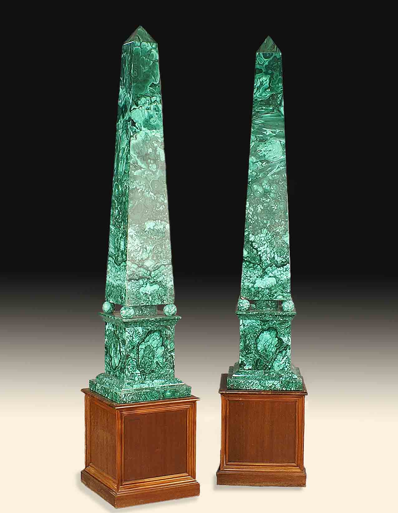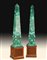 Coppia di obelischi in malachite poggianti su sfere e parallelepipedo, basi...