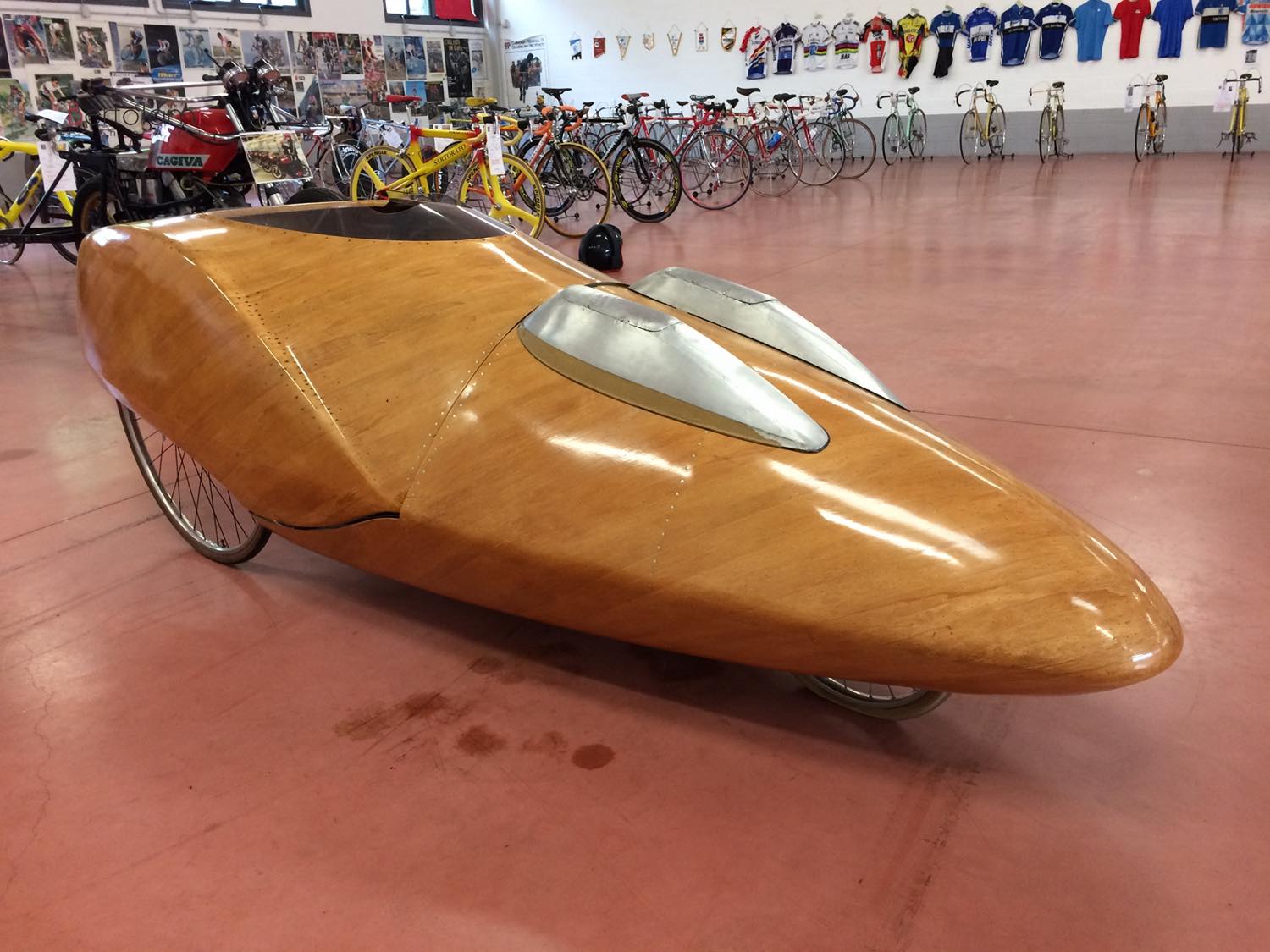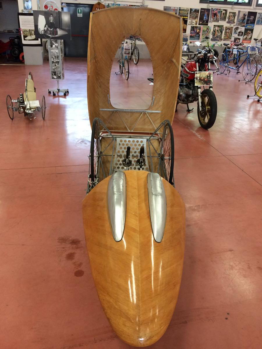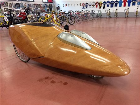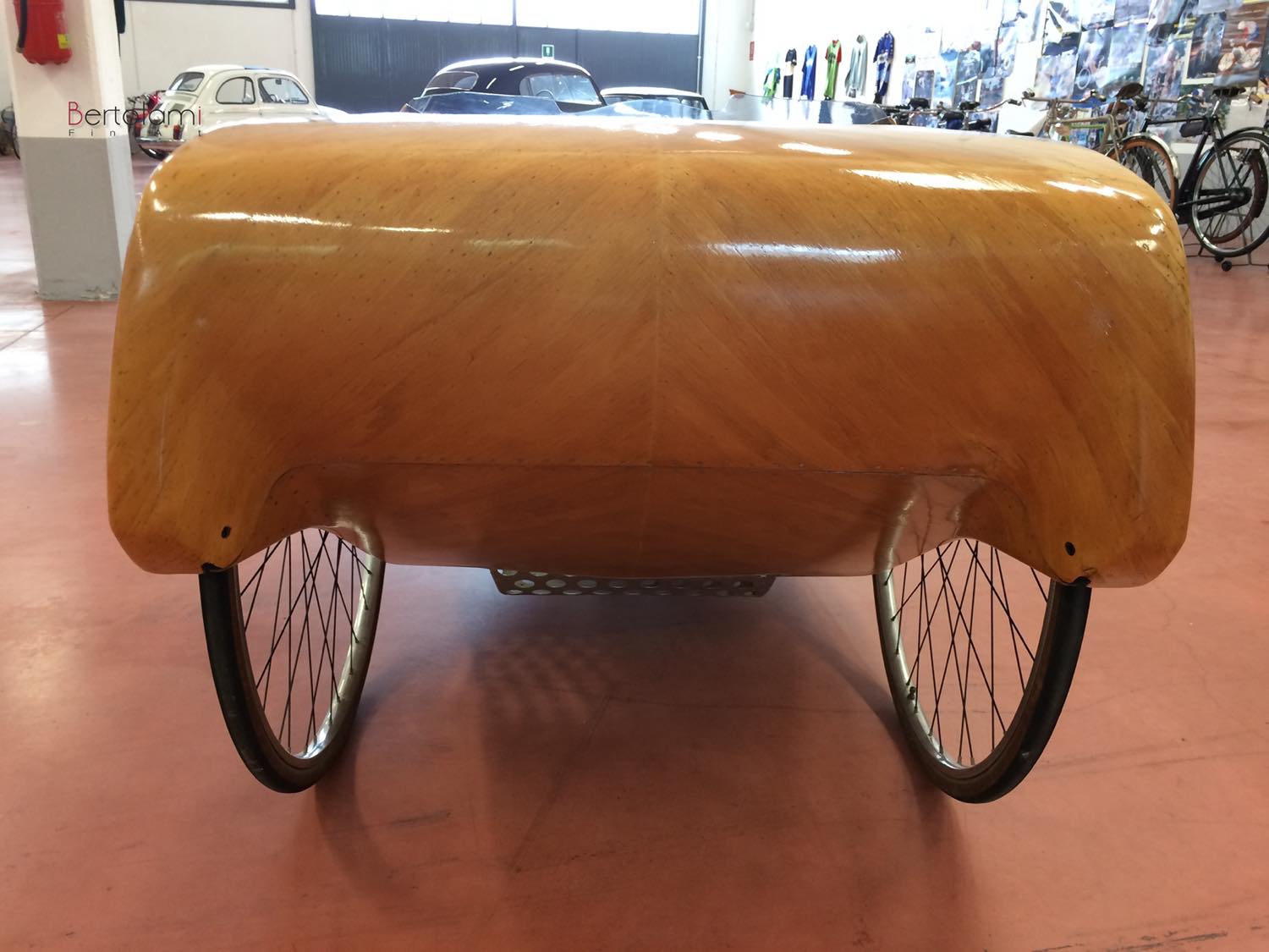 Il prototipo è stato realizzato in un unico esemplare, basti osservare la certosina artigianalità di tutti i componenti meccanici, dell’epoca, e della sovrastruttura organizzata e realizzata con sottilissime fasce di un legno esotico particolarmente flessibile. I componenti ciclistici sono tutti della Campagnolo.