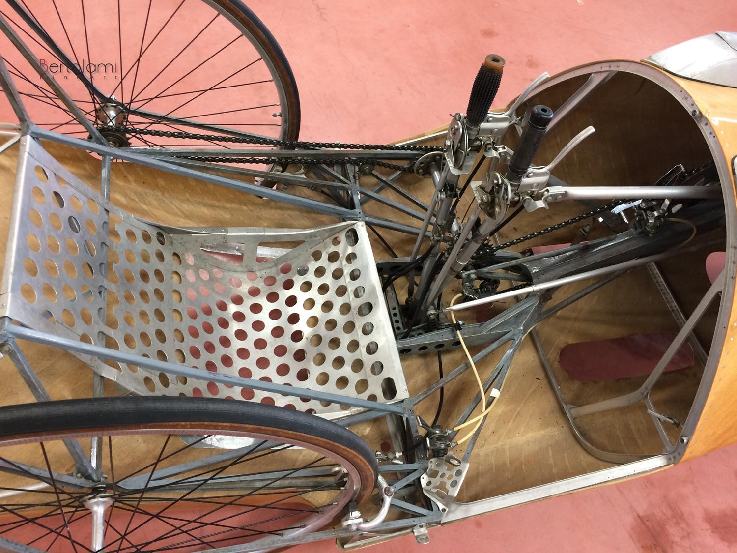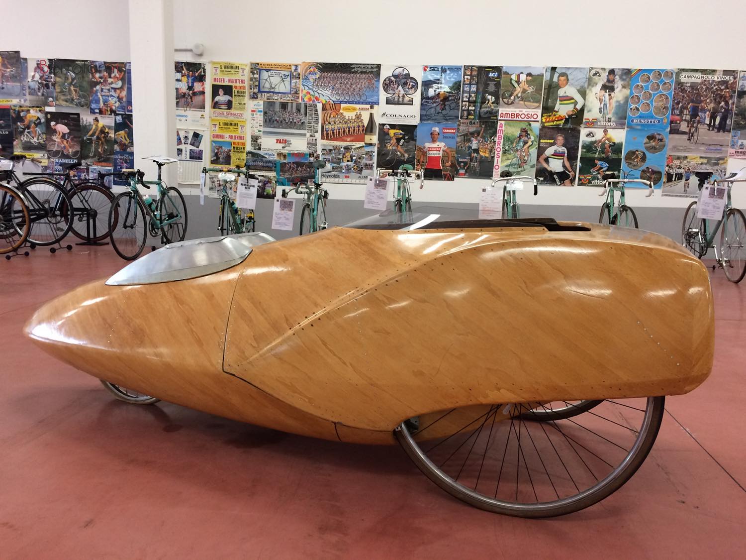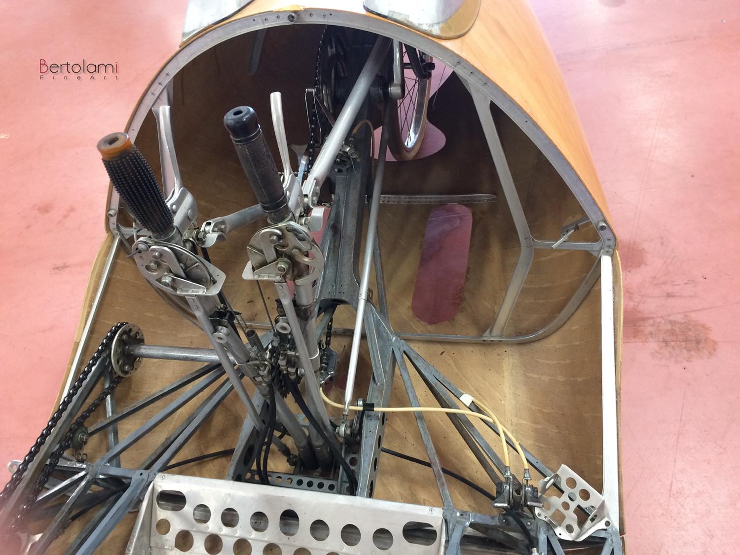 Il prototipo è stato realizzato in un unico esemplare, basti osservare la certosina artigianalità di tutti i componenti meccanici, dell’epoca, e della sovrastruttura organizzata e realizzata con sottilissime fasce di un legno esotico particolarmente flessibile. I componenti ciclistici sono tutti della Campagnolo.