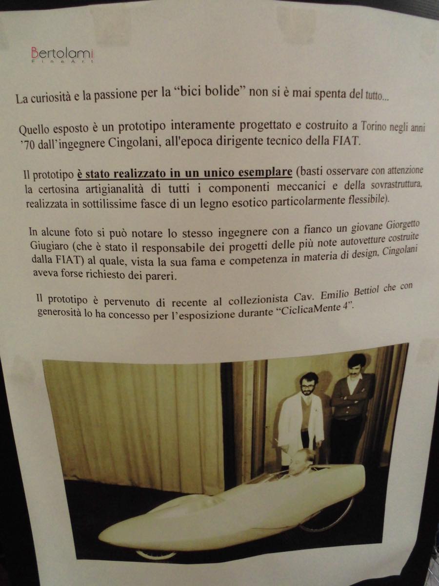 Alberto Fumagalli della Italdesign Giugiaro ha lasciato una lettera all’attuale proprietario, annessa al lotto, dove si evince chiaramente la provenienza della bicicletta come prototipo disegnato, progettato e costruito dall’Ing. Cingolani ma portato da Giorgietto Giugiaro alle prove di aereodinamicità come prototipo alla Galleria del vento appunto del Design Giorgetto Giugiaro.