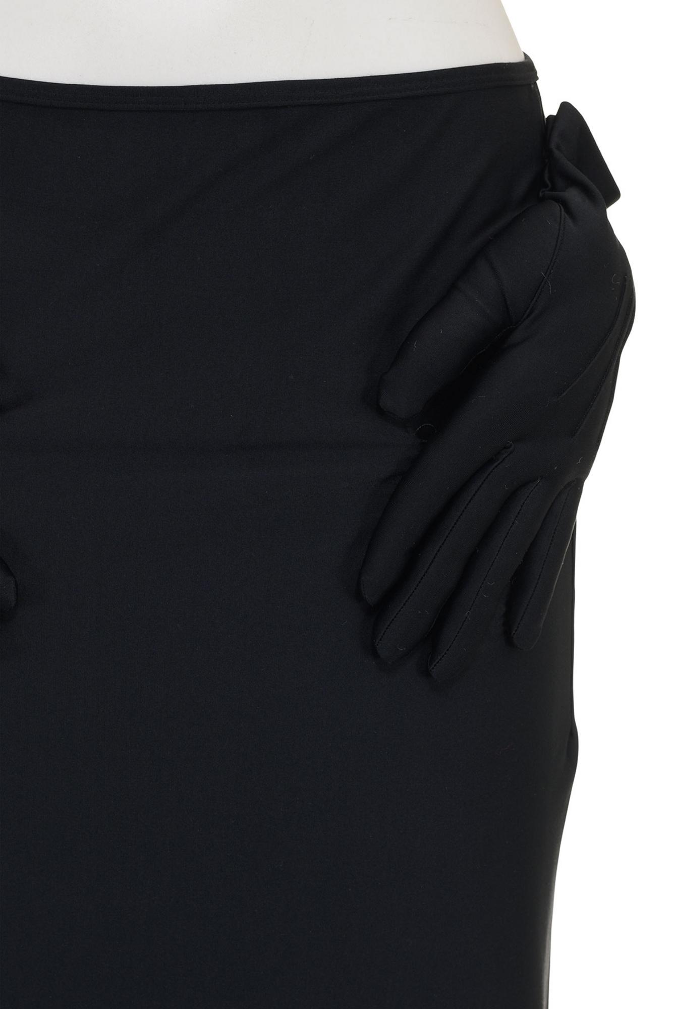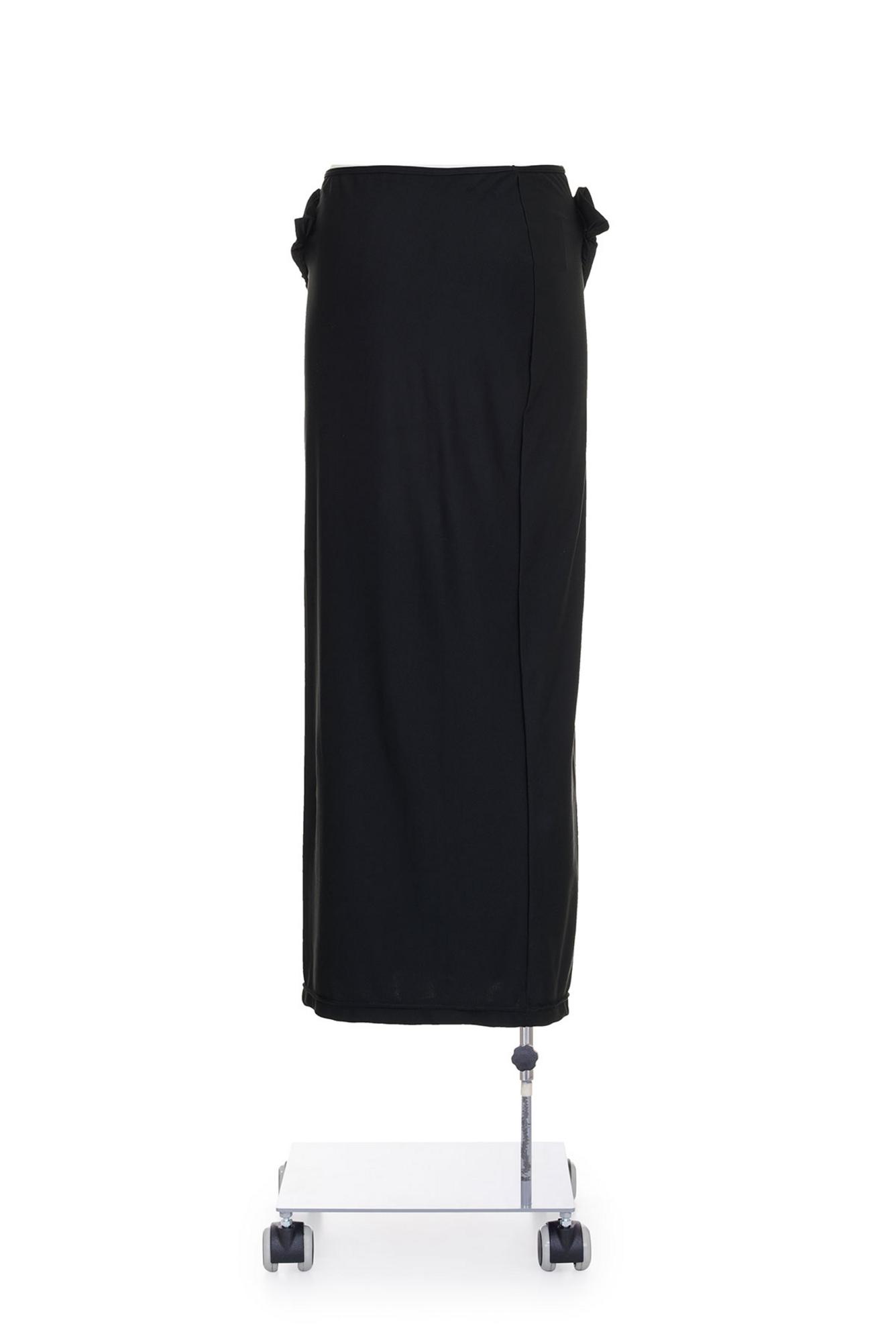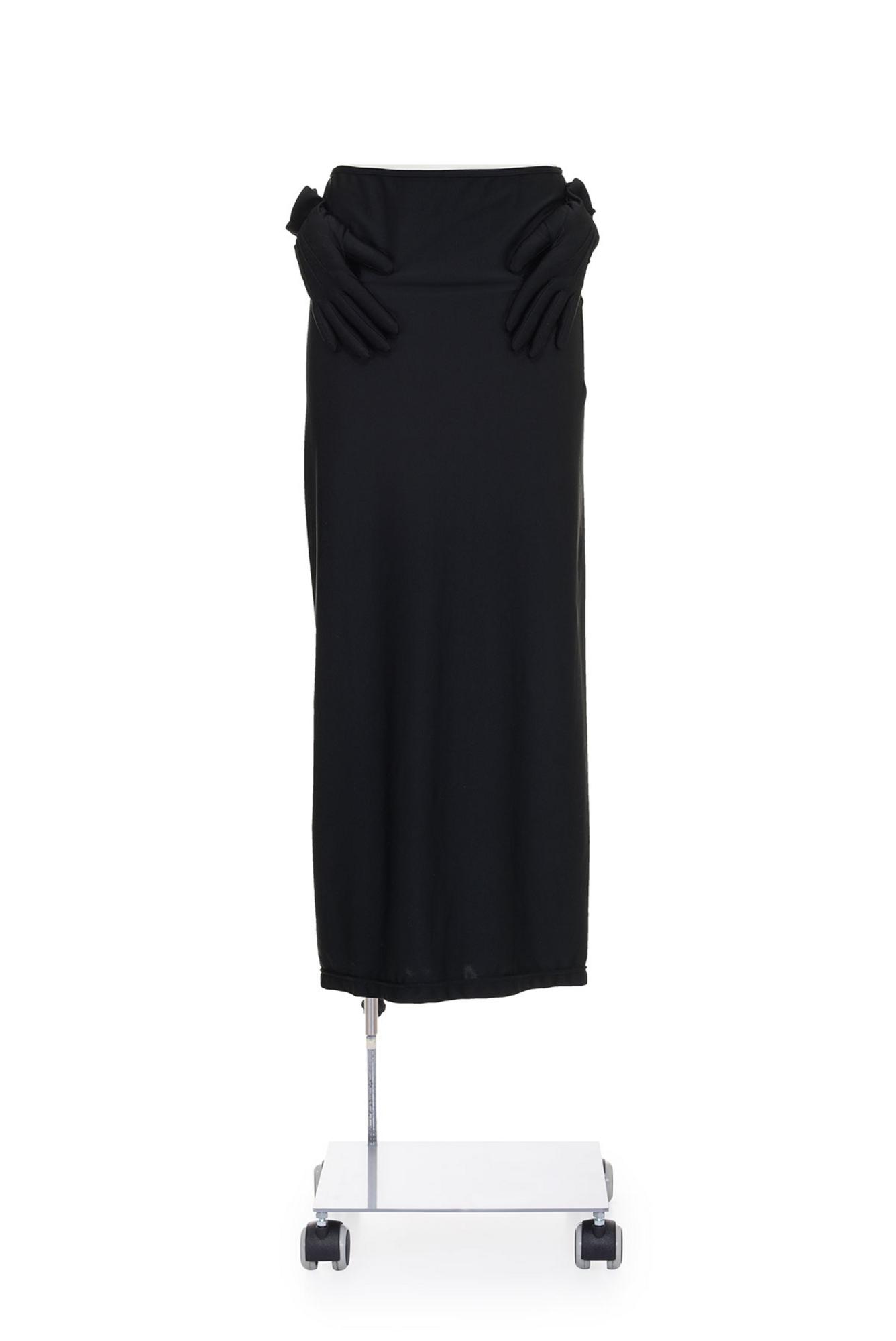 Iconica gonna lunga nera elasticizzata con dettaglio di mani imbottite sui fianchi della collezione AI 07