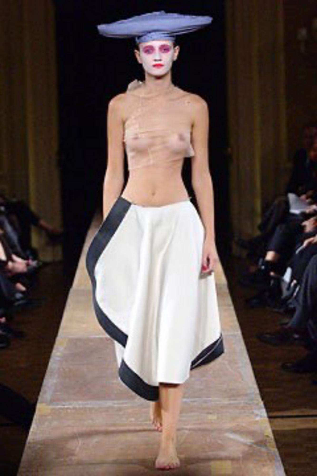 Circle beige skirt with contrast black sides and fringed hems from SS 04 collection