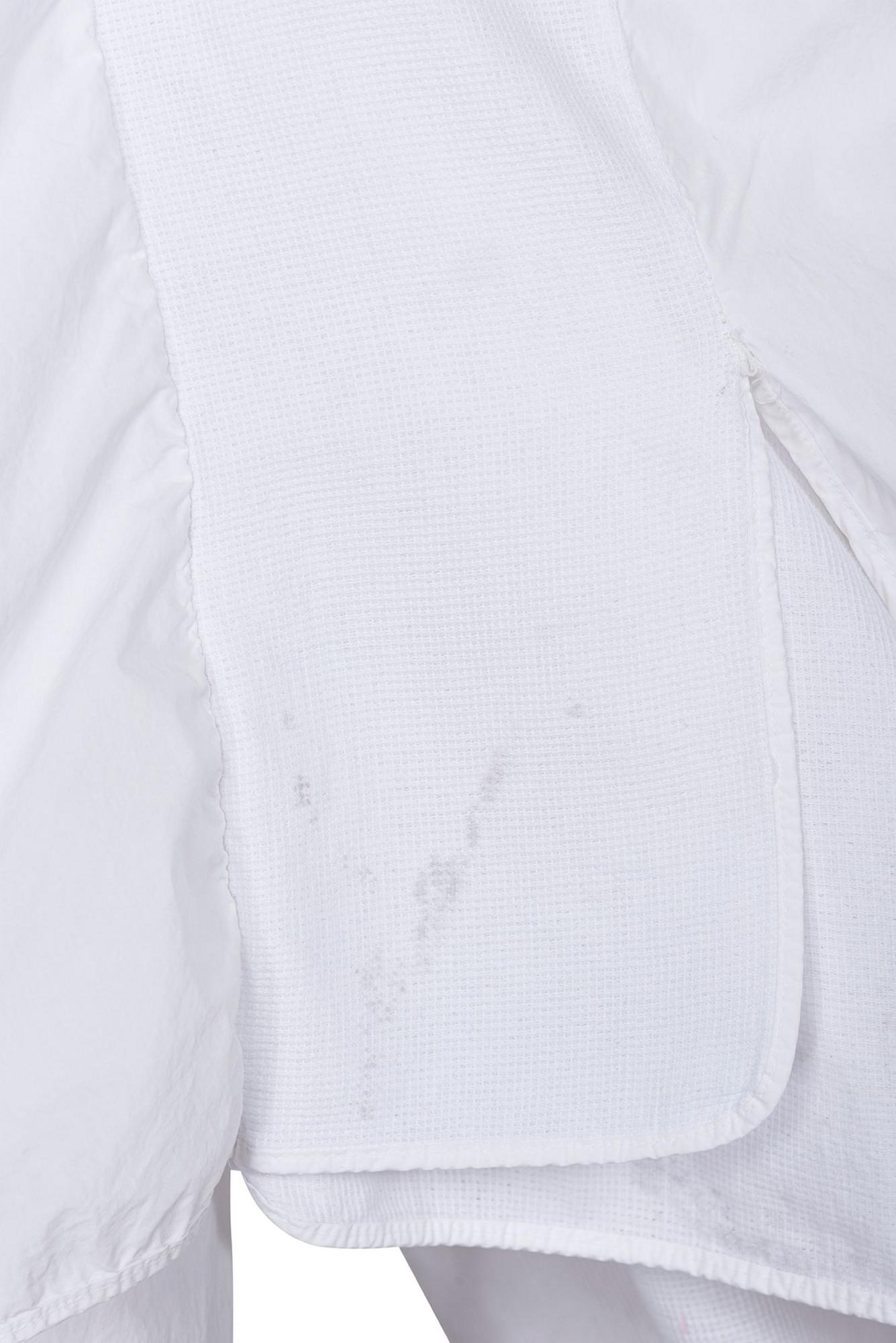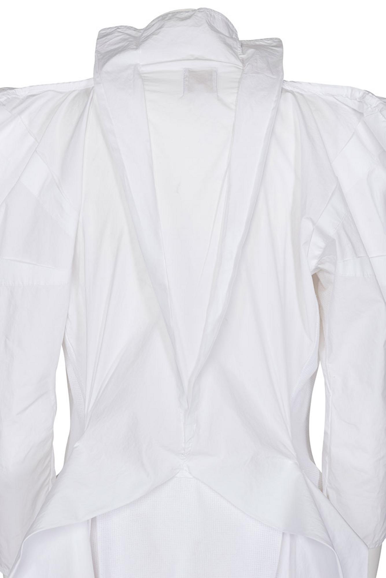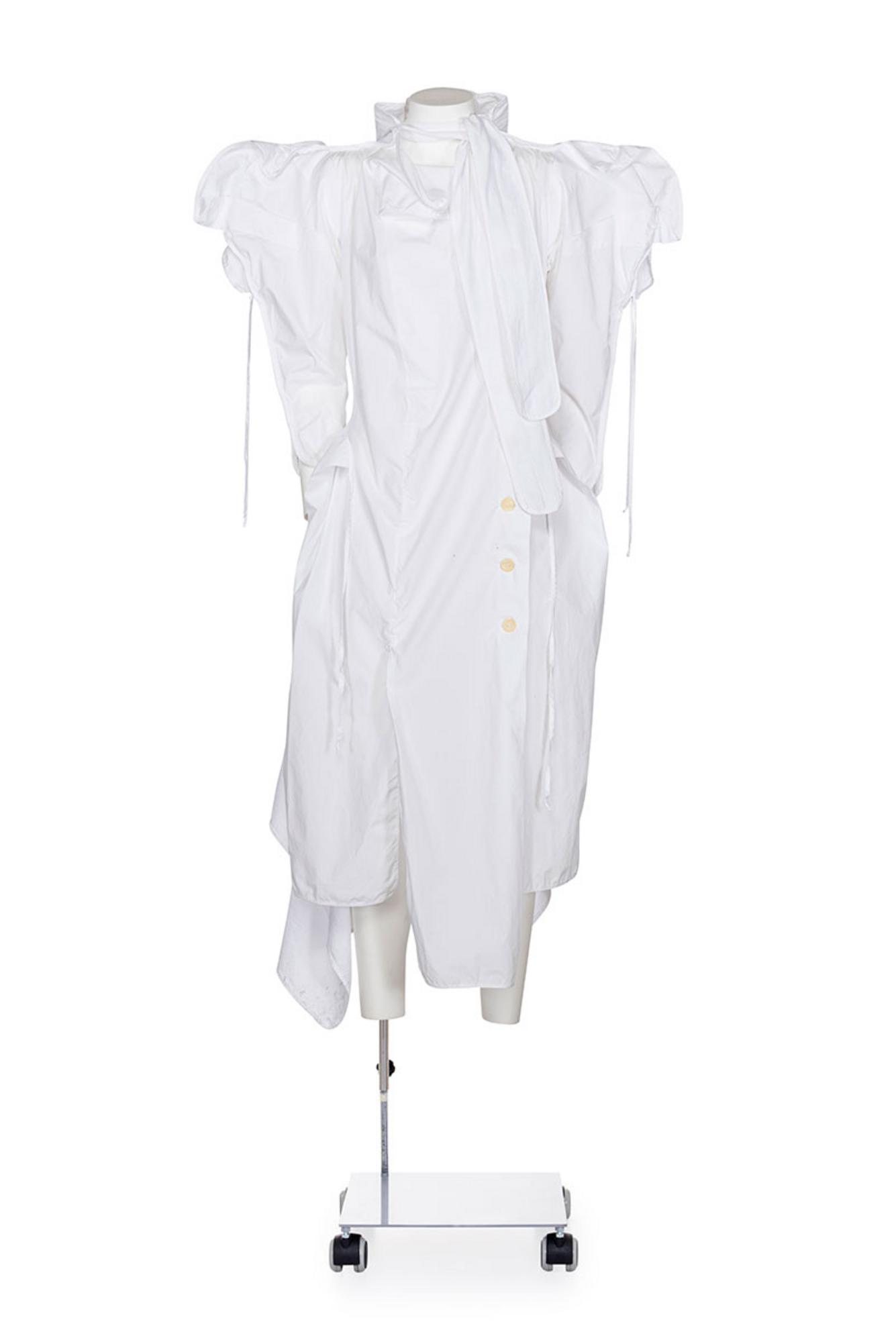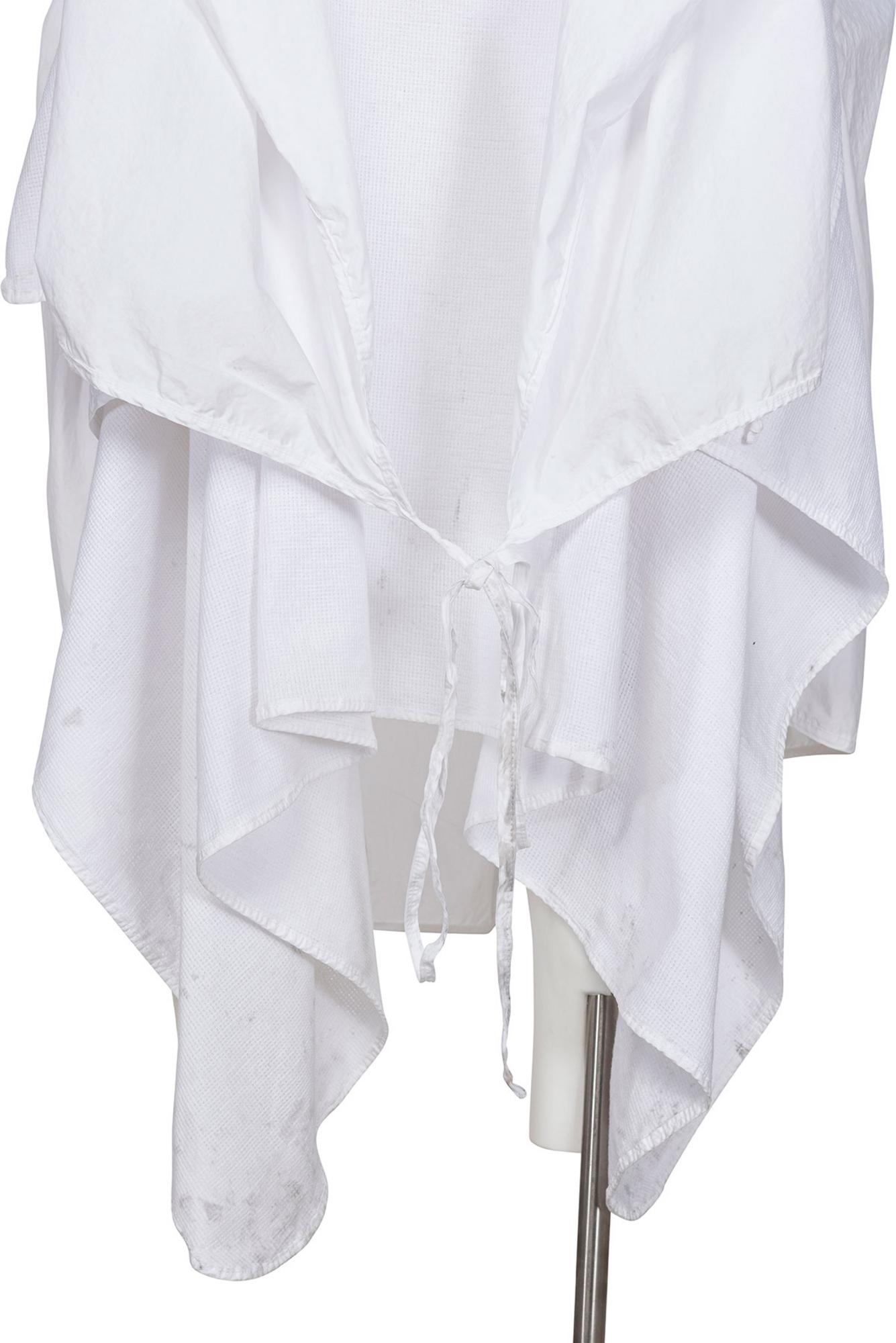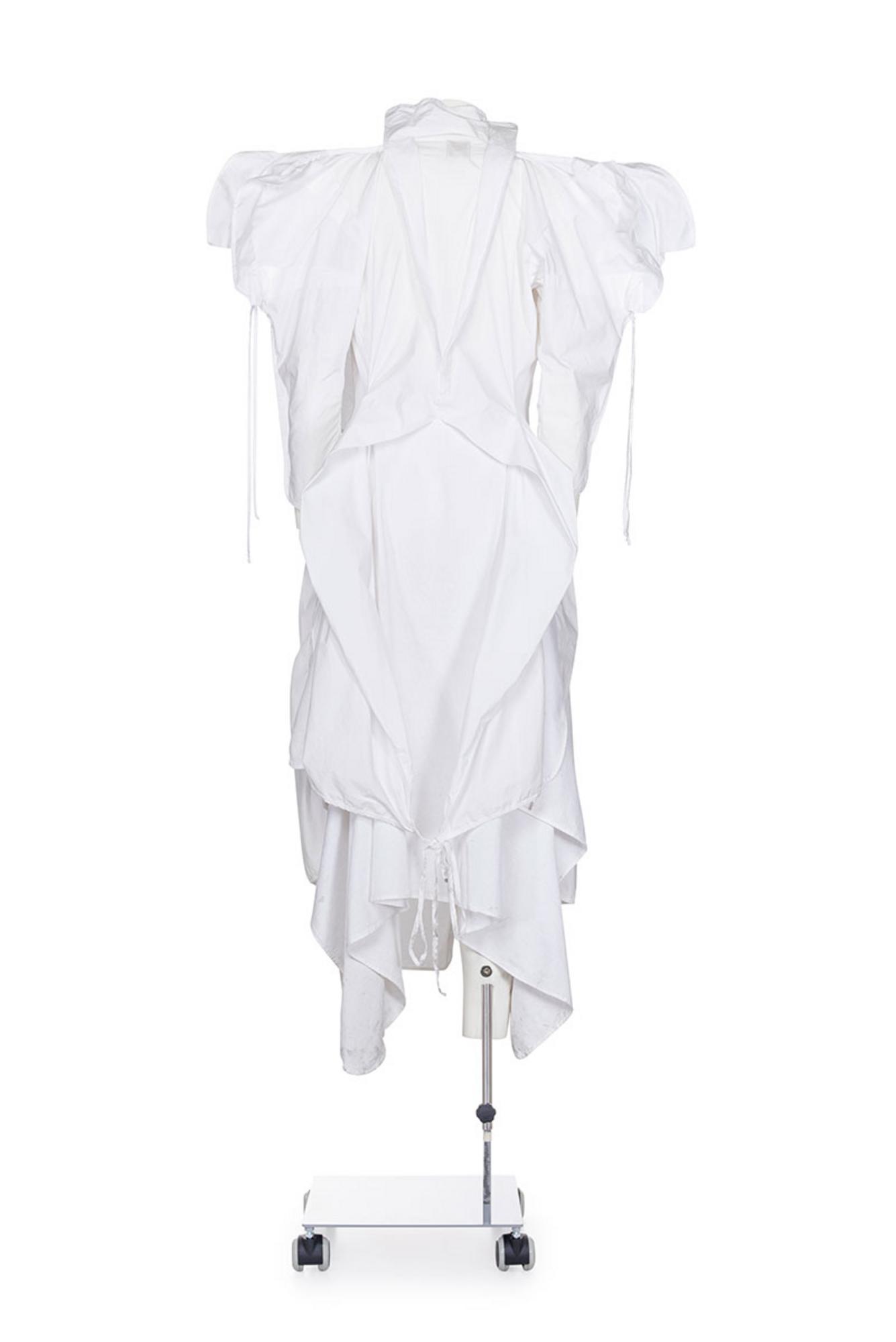 Rare draped white poplin dress with wide ruffled balloon shoulders and diagonal button closure from SS 03 collection