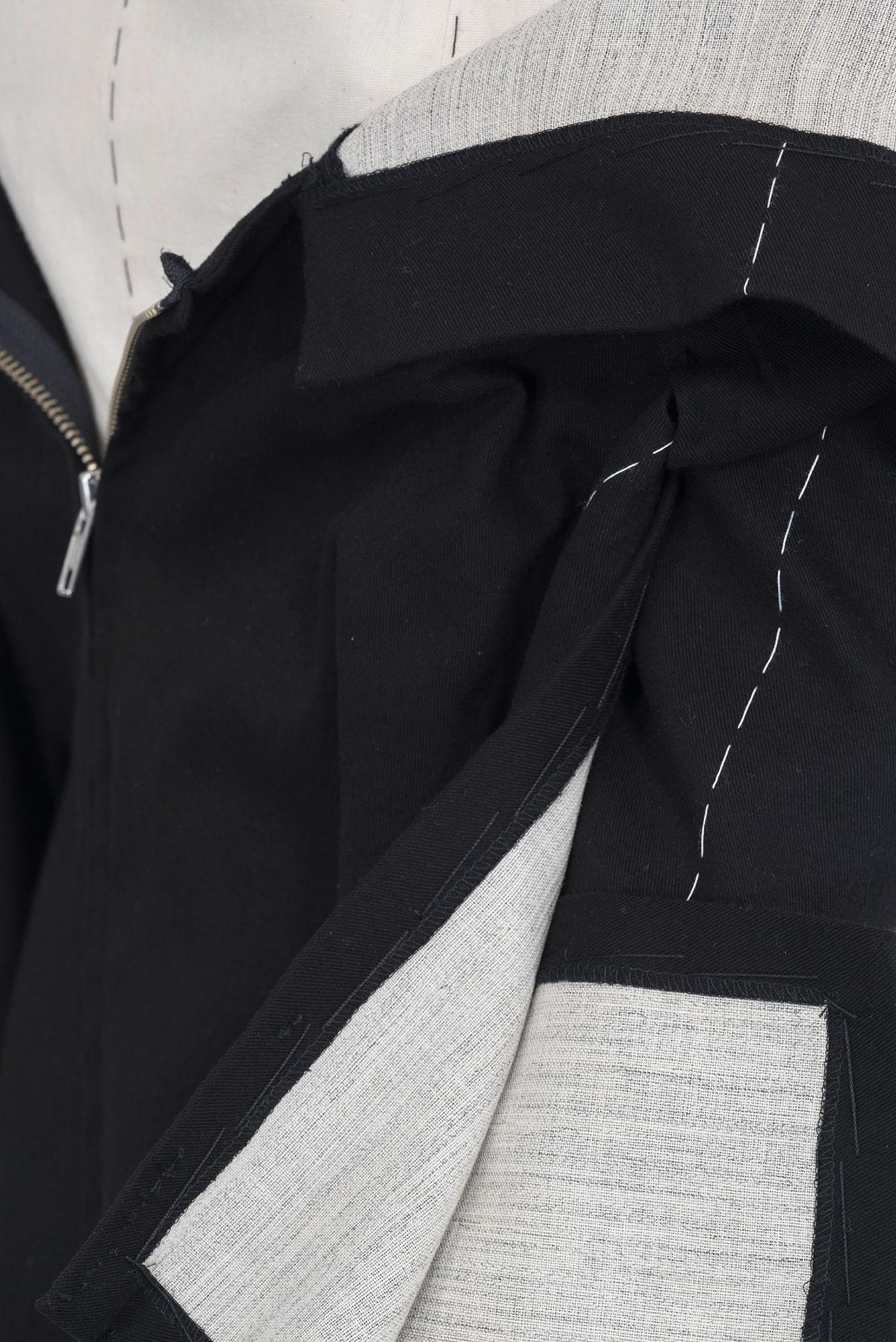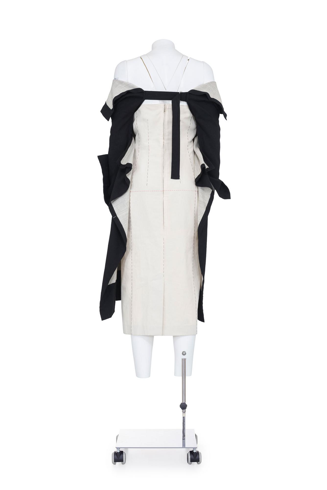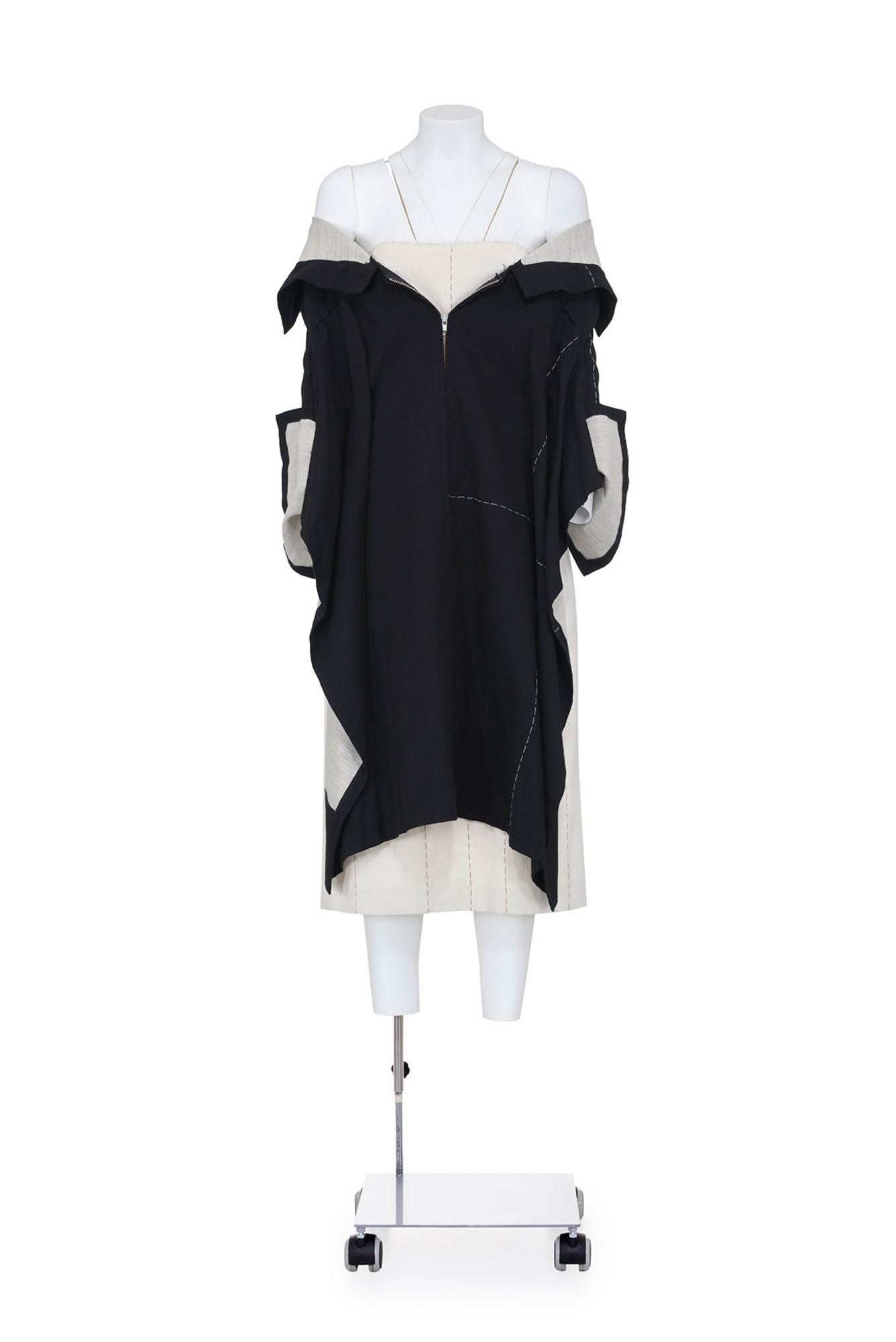 Abito doppiato strutturato con grembiule esterno nero a maniche lunghe con zip davanti e cintura regolabile dietro