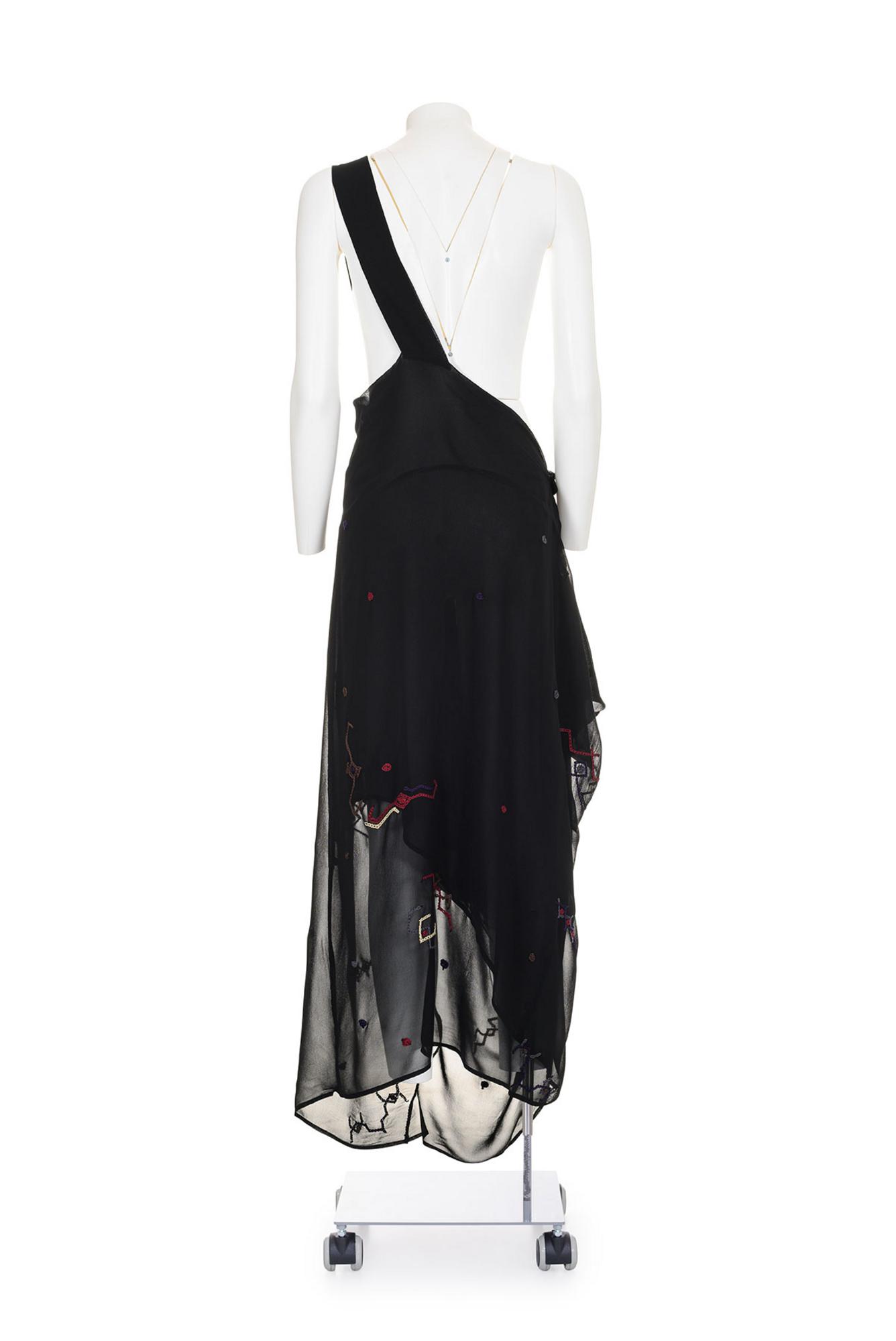 Gonna drappeggiata in georgette nera con ricami multicolor e bretella asimmetriche