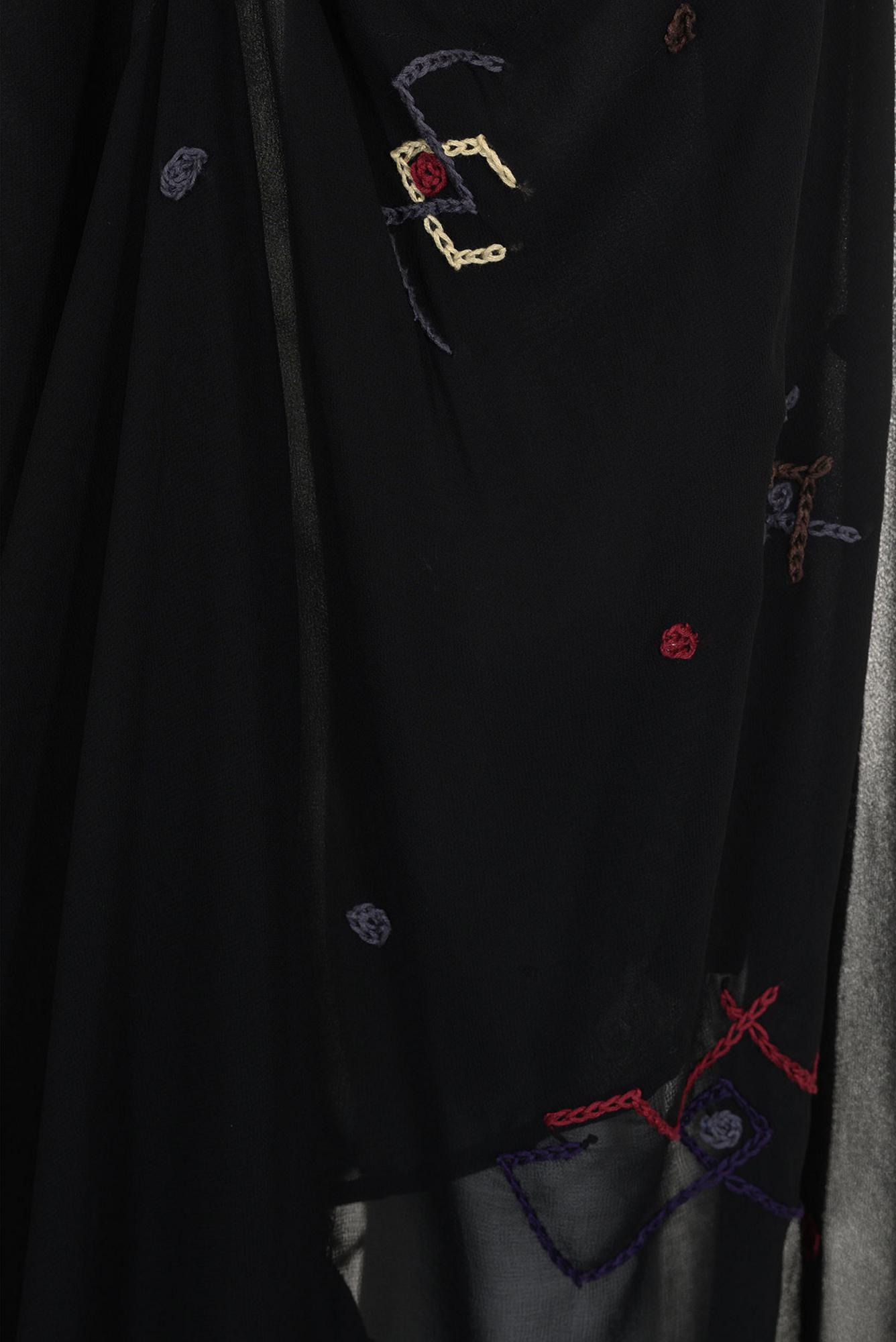 Draped black georgette skirt with multicolor embroideries and asymmetrical suspender