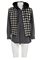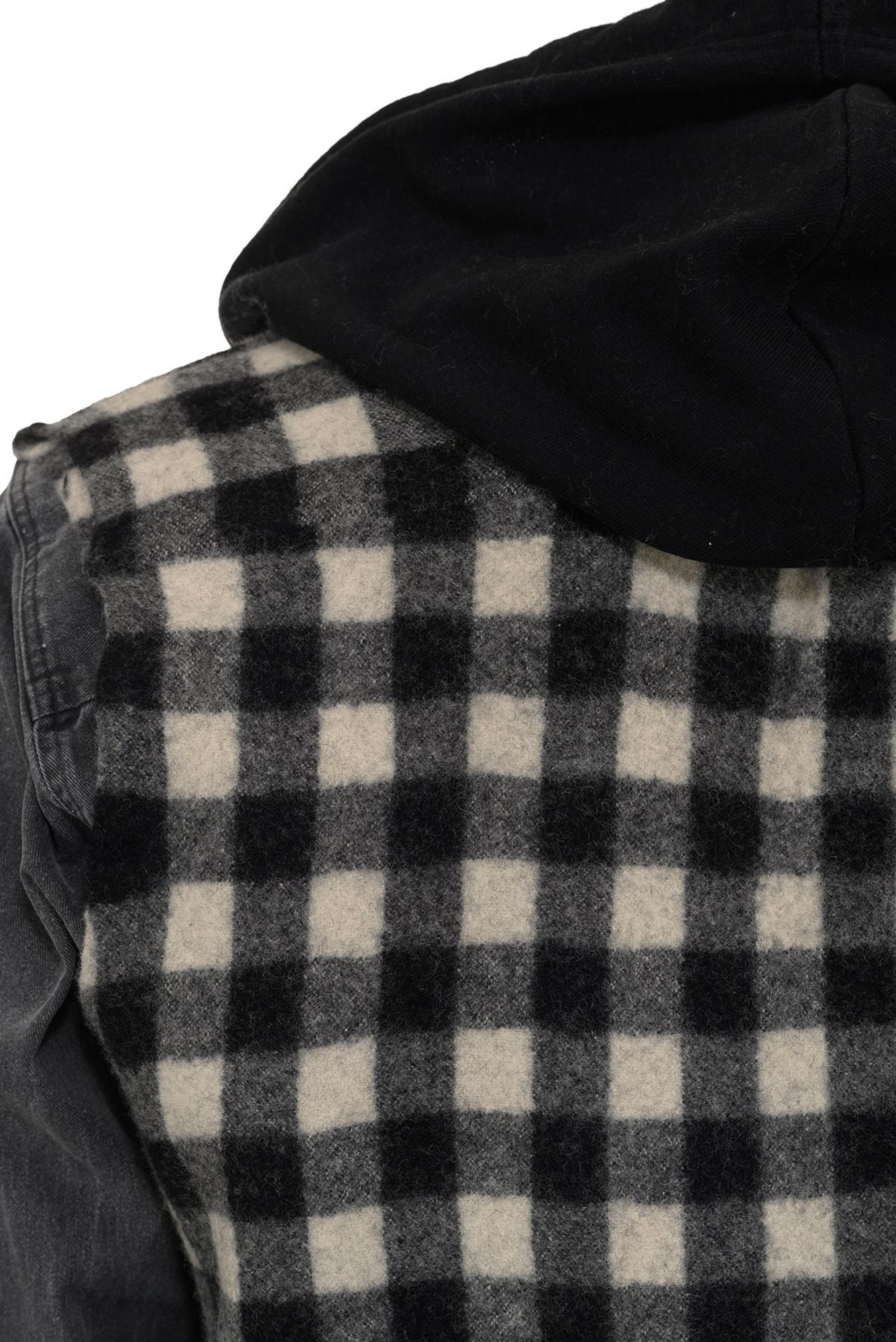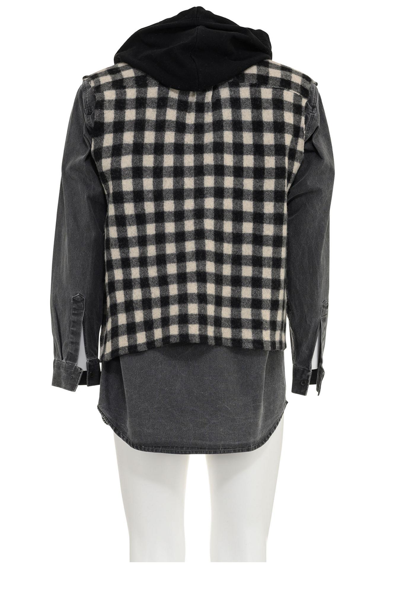 Camicia a strati color antracite con cappuccio in felpa nera e gilet in flanella a quadri bianchi e neri della collezione AI 05 "Waves"