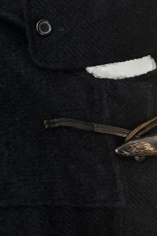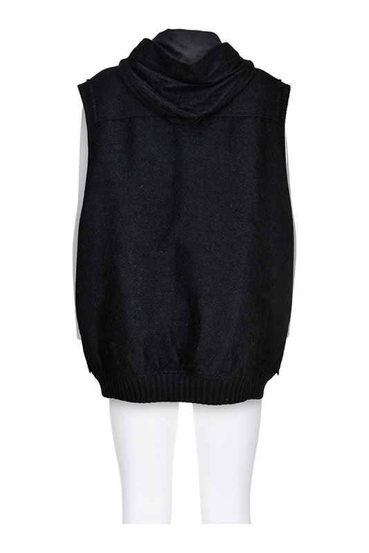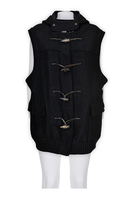 Rare oversize hooded Montgomery black vest with toggles closure at front