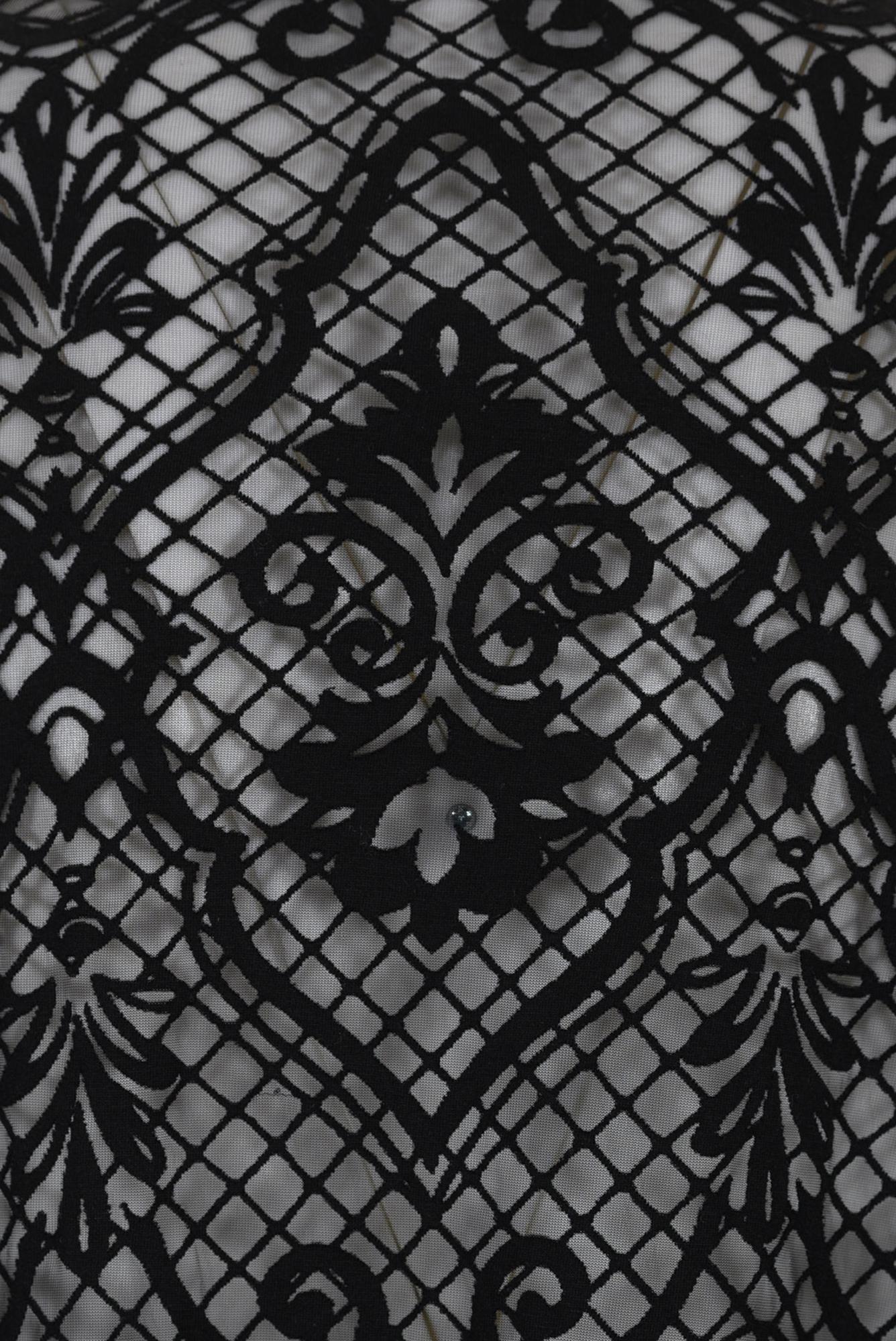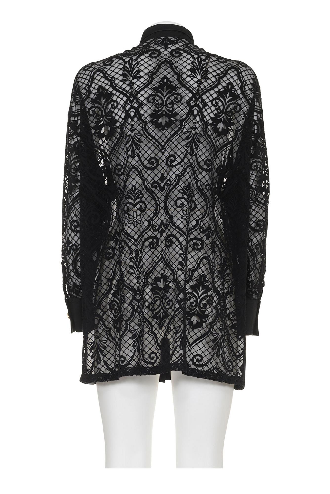 Camicia nera in seta a pois bianchi con maniche e schiena in jersey de'vore' effetto pizzo della collezione PE 94