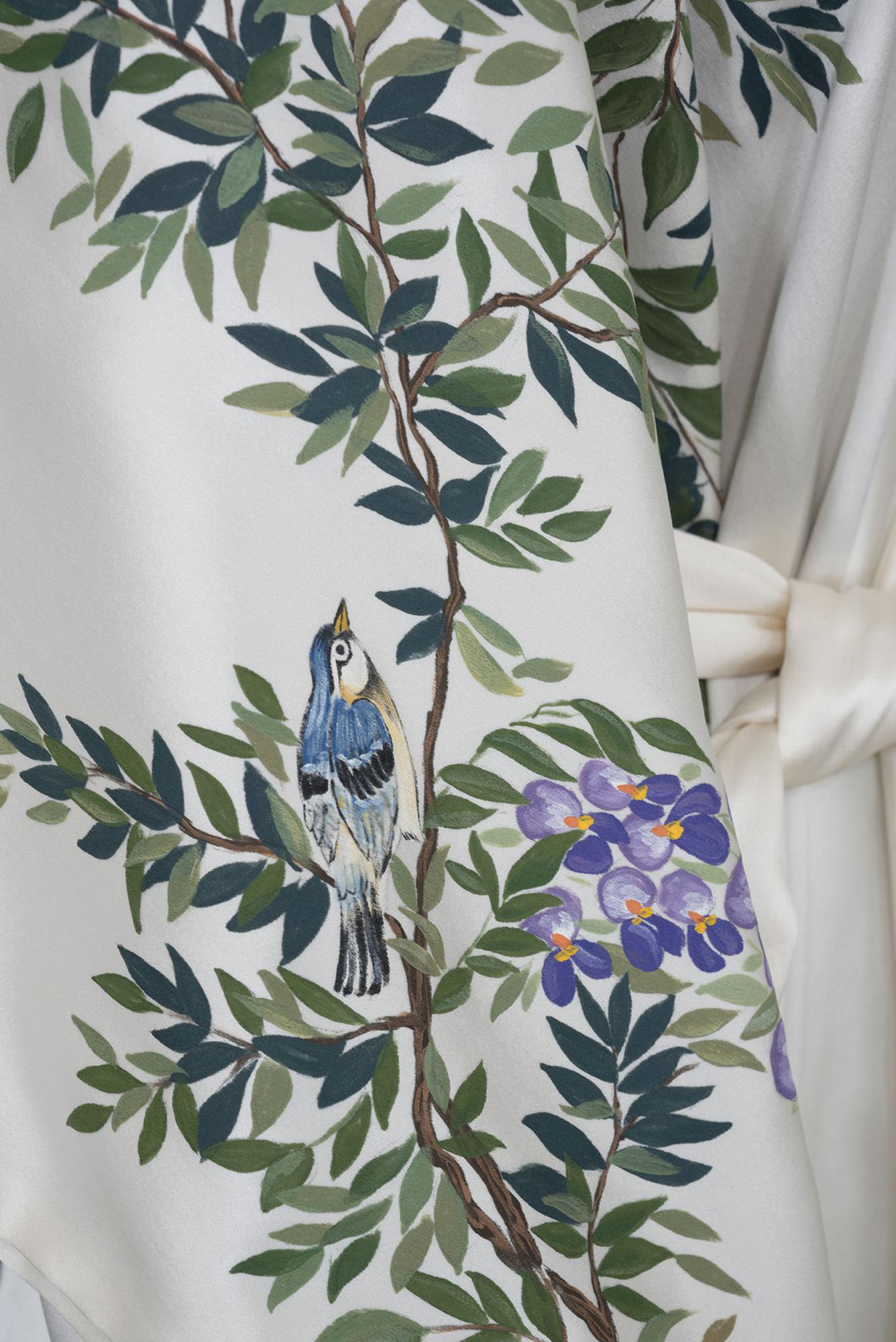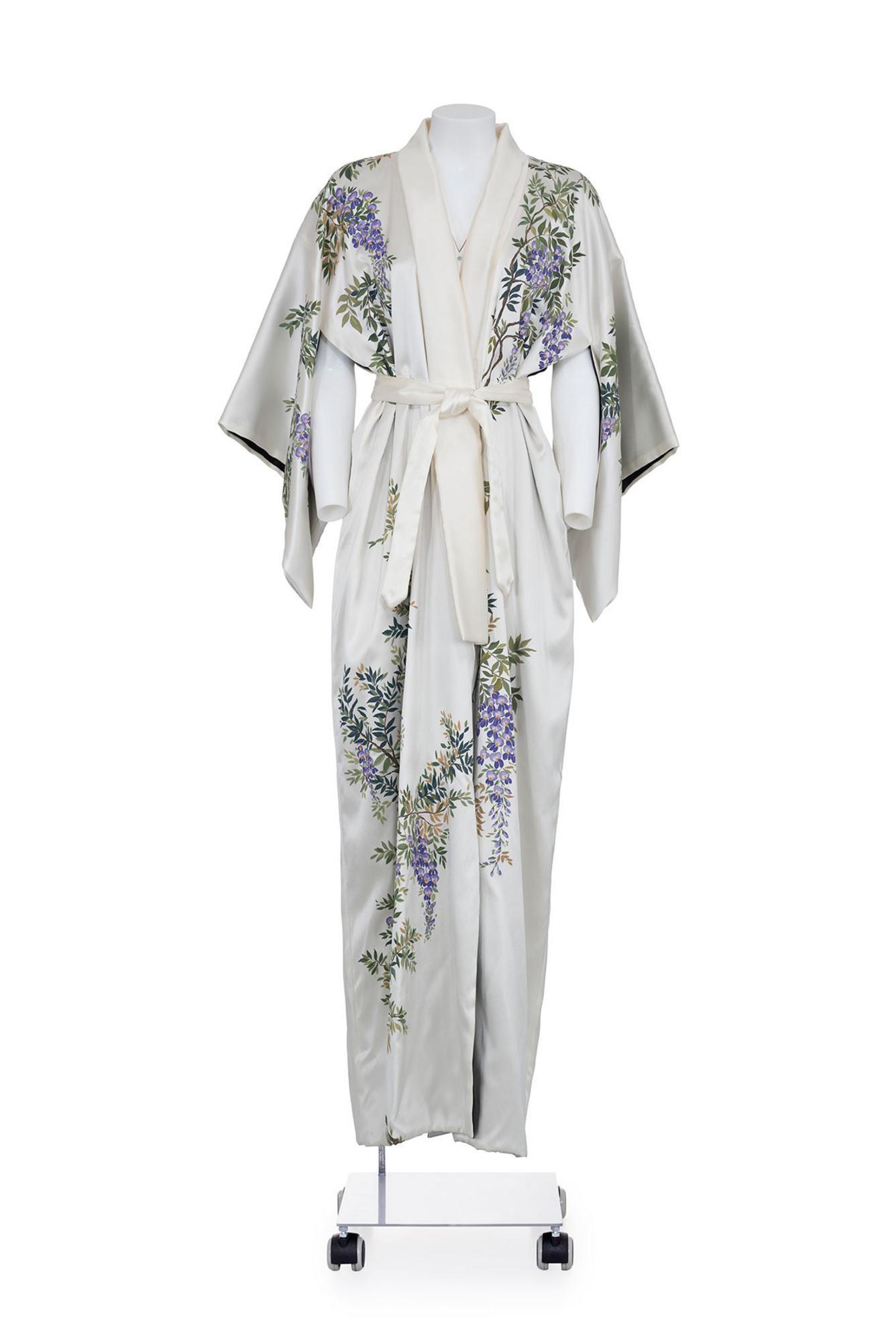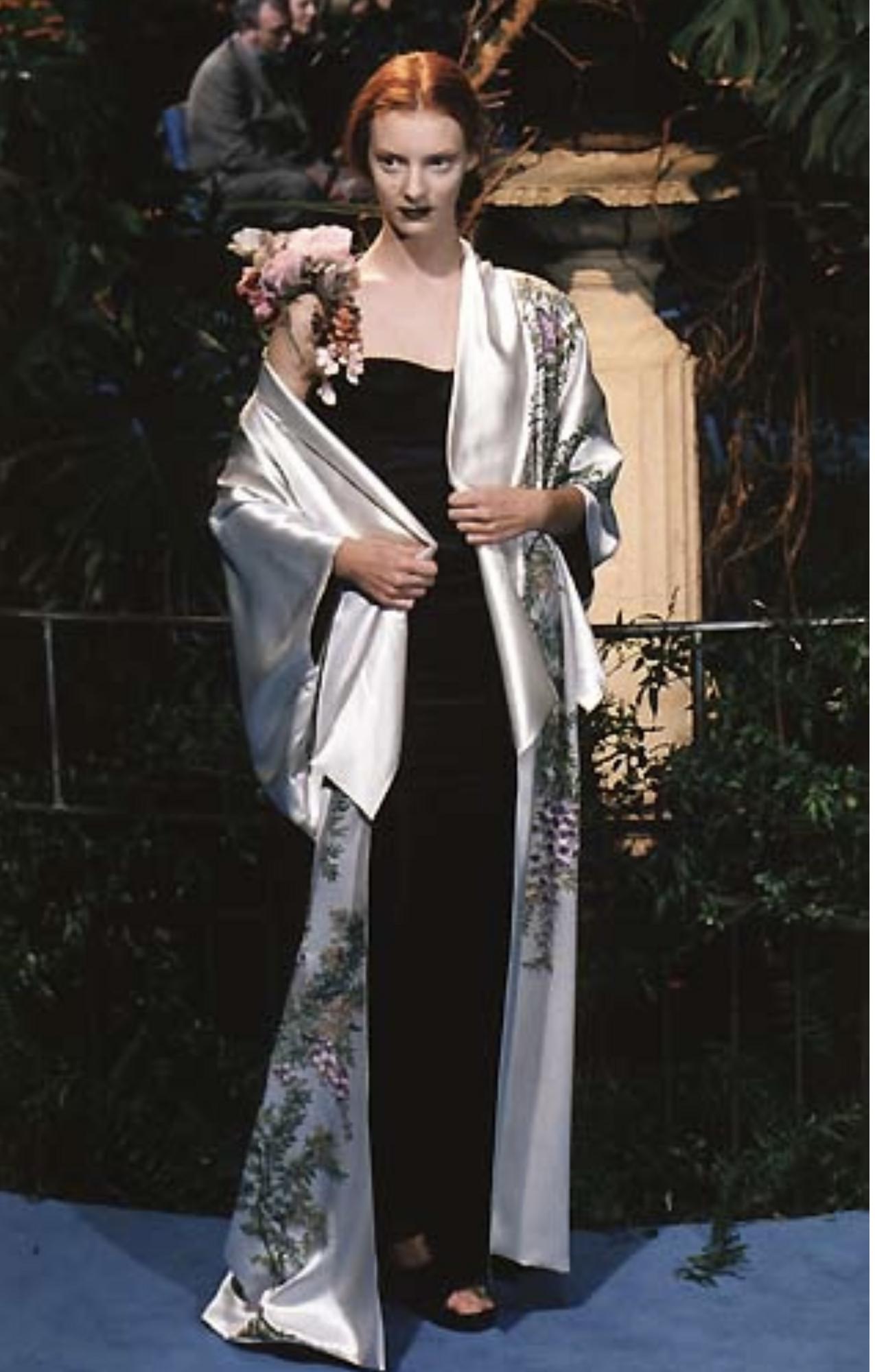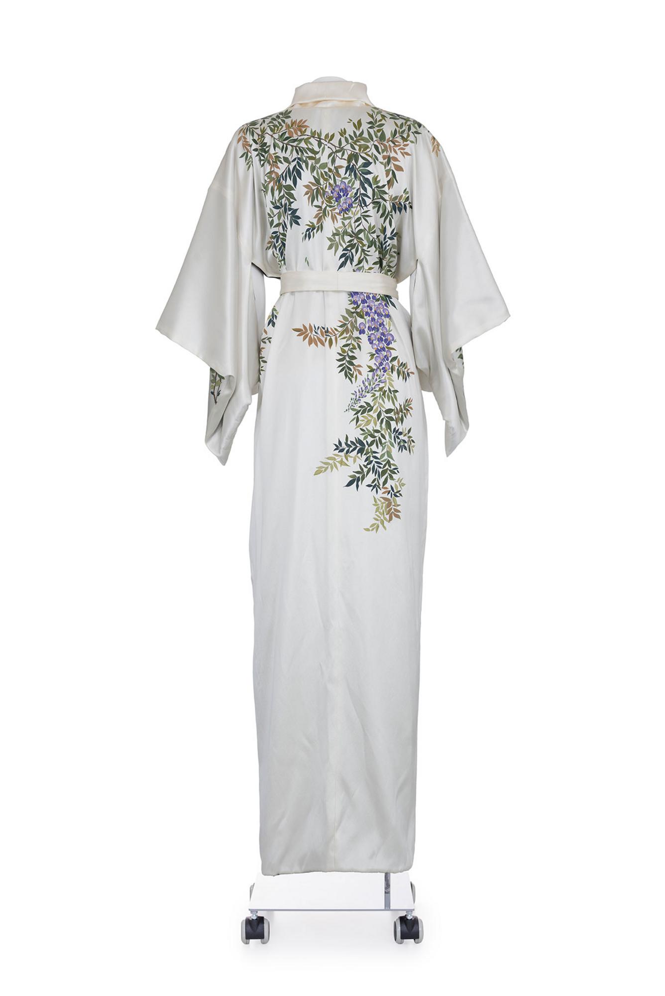 Rare ivory silk long kimono with green and lilac hand painting from FW 98 collection