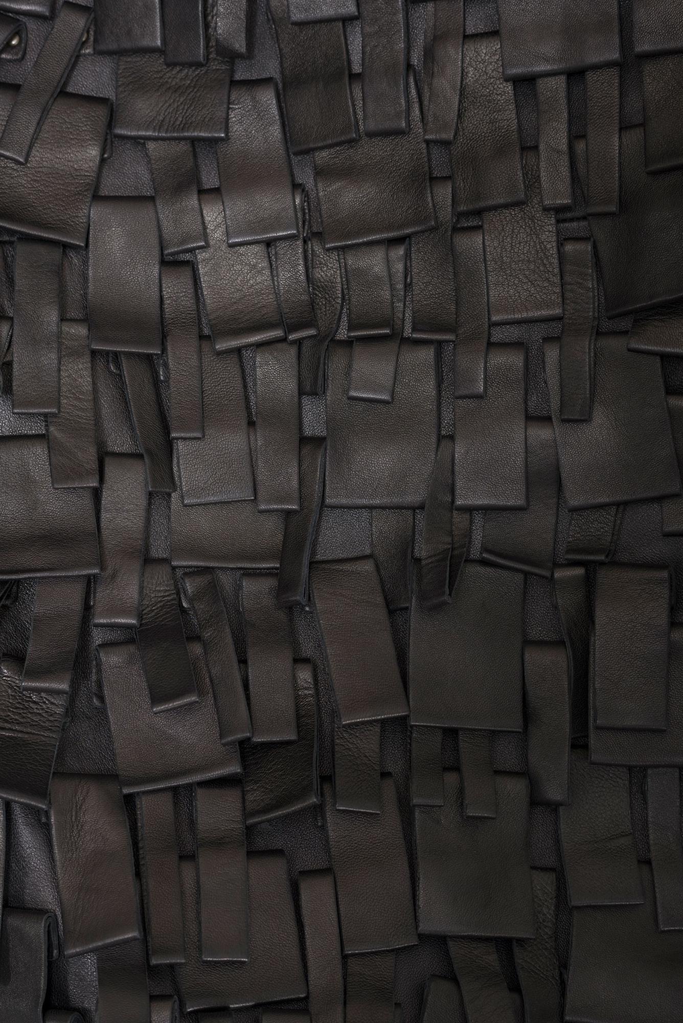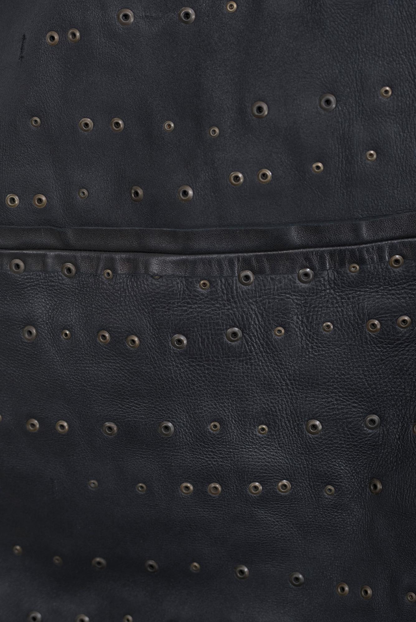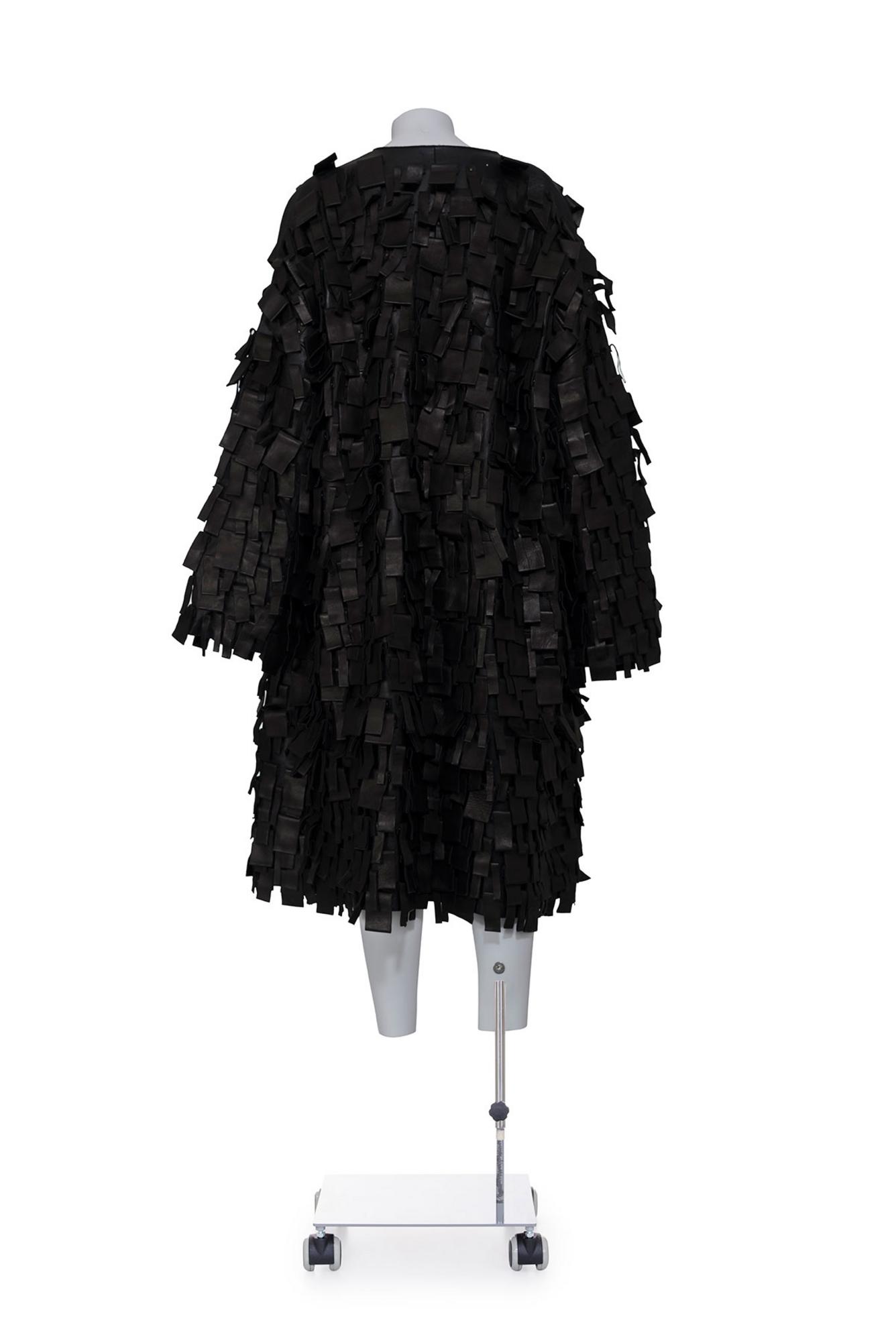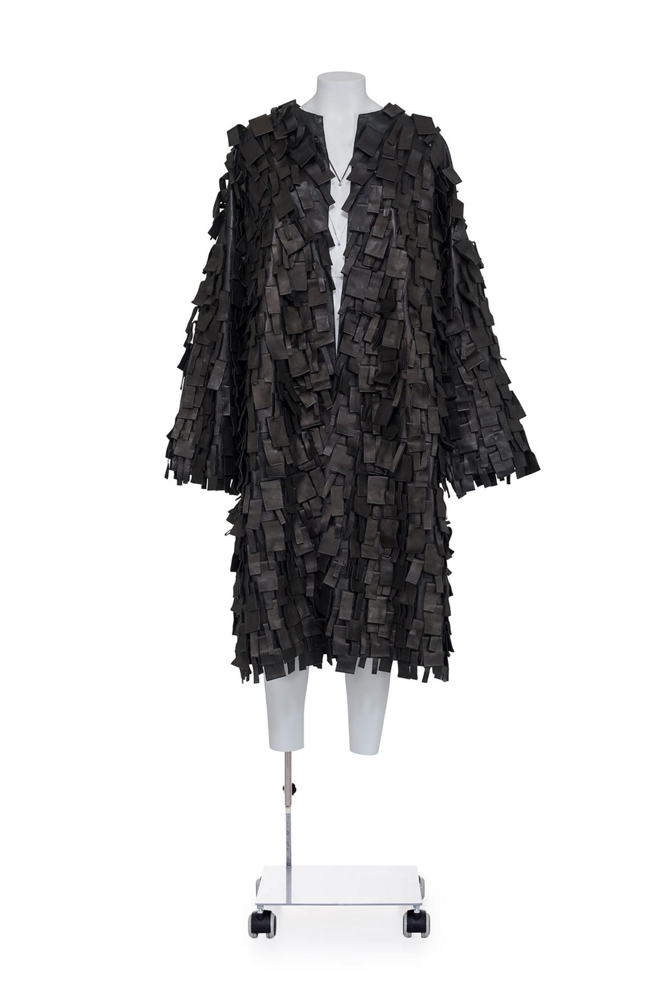 Iconico e raro cappotto in pelle nera con frange ripiegate oversize e borchie della collezione AI 02