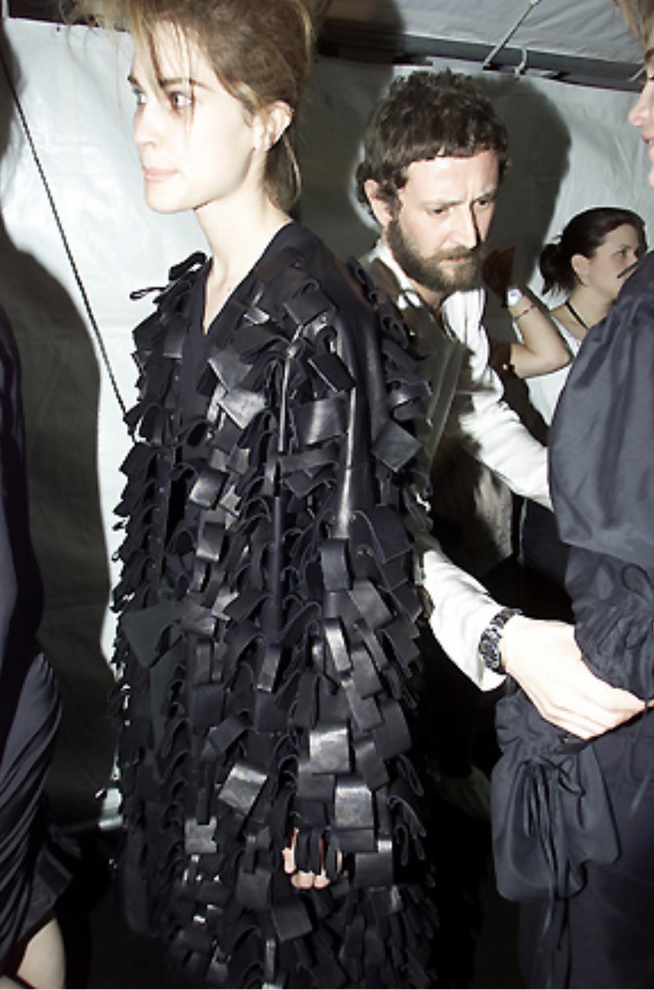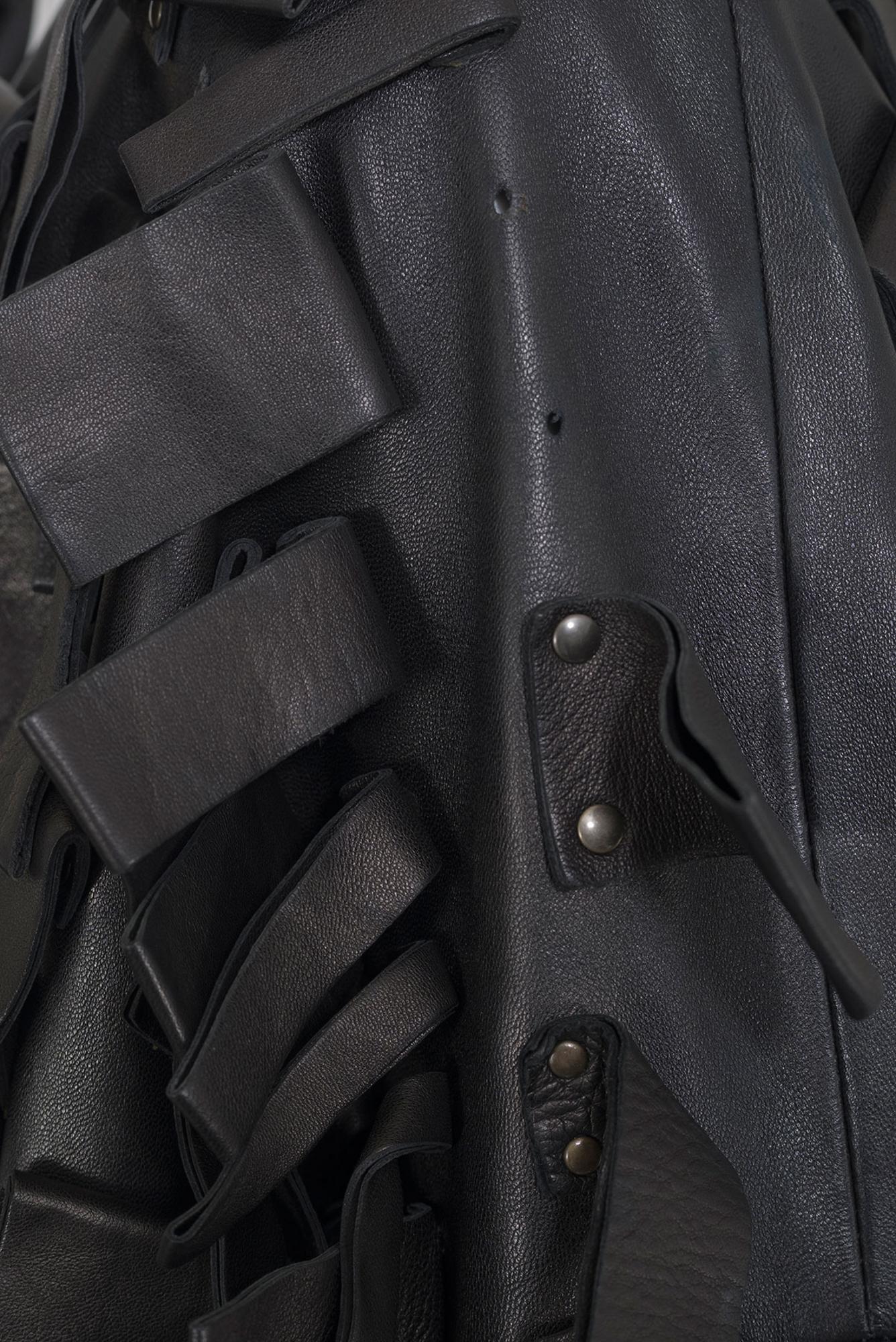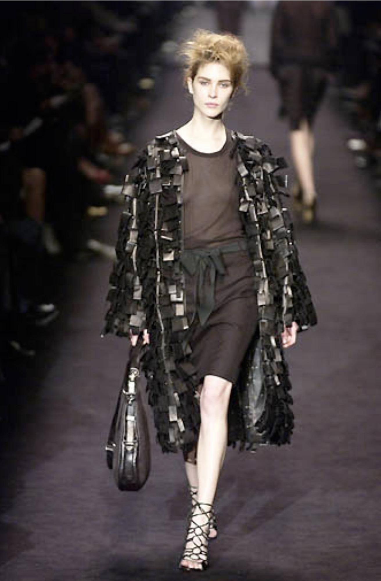 Iconic and rare black leather coat with oversize folded fringes and studs from FW 02 collection