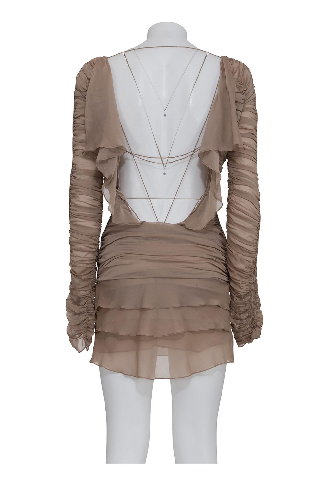 Rare pale pink draped long sleeve dress with wide neckline and open back with ruches from SS 03 collection