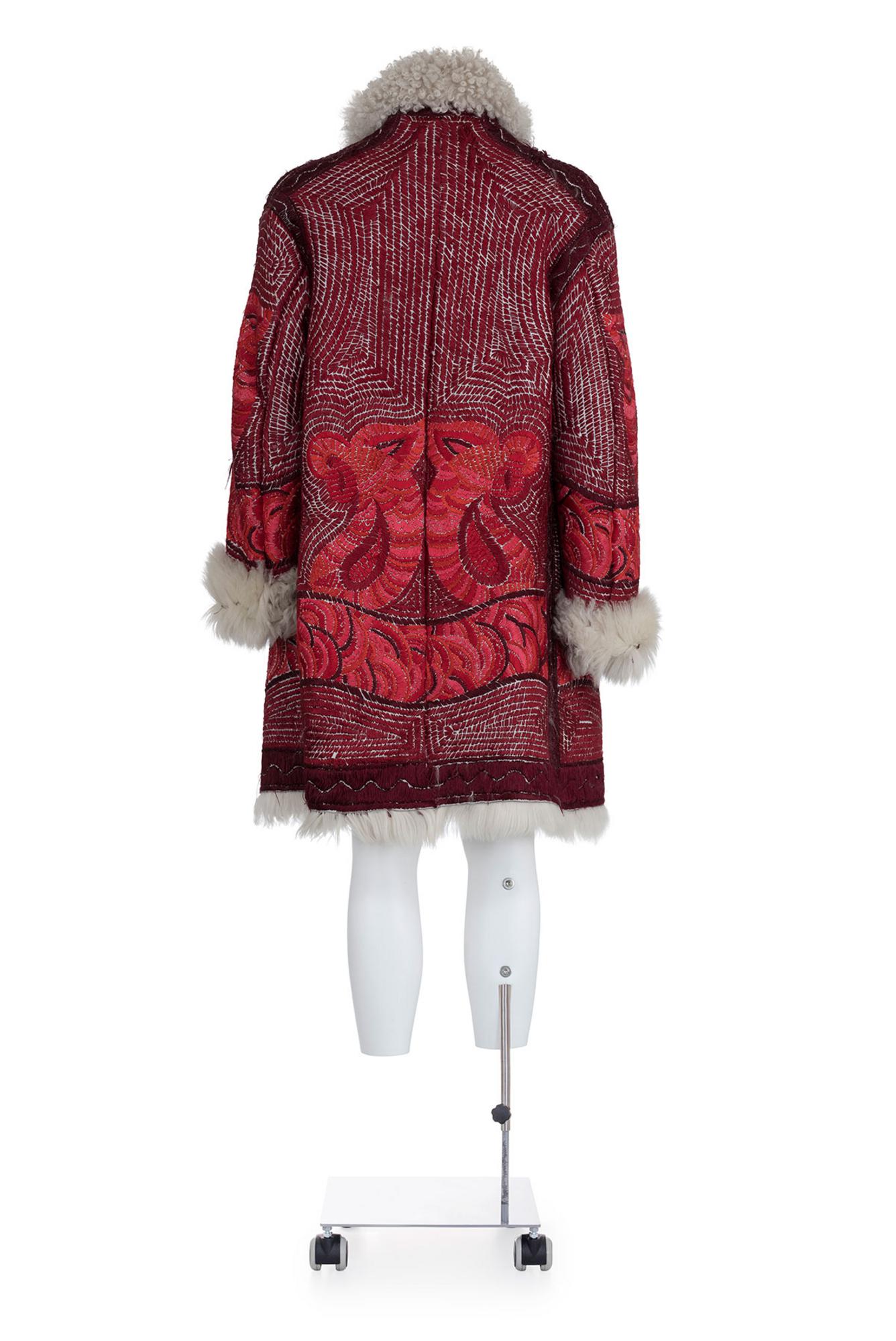 Rare prototype white shearling coat with red and burgundy handmade embroideries from FW 01 collection