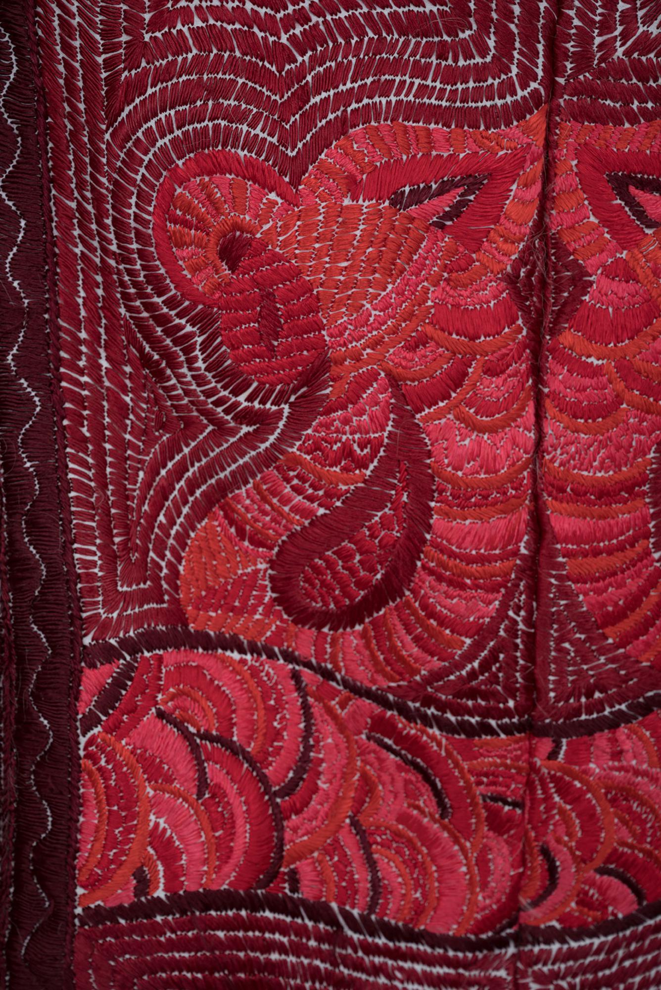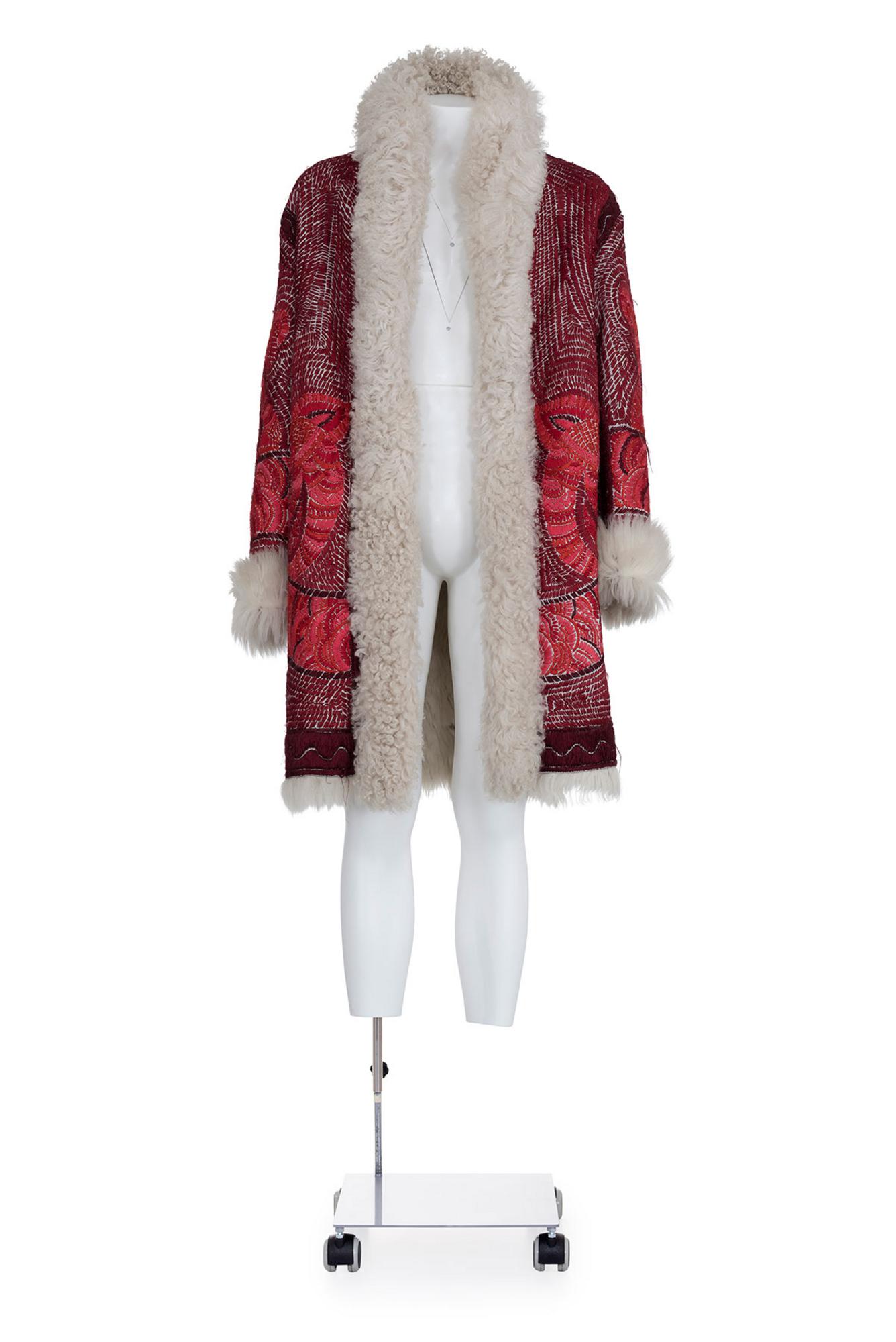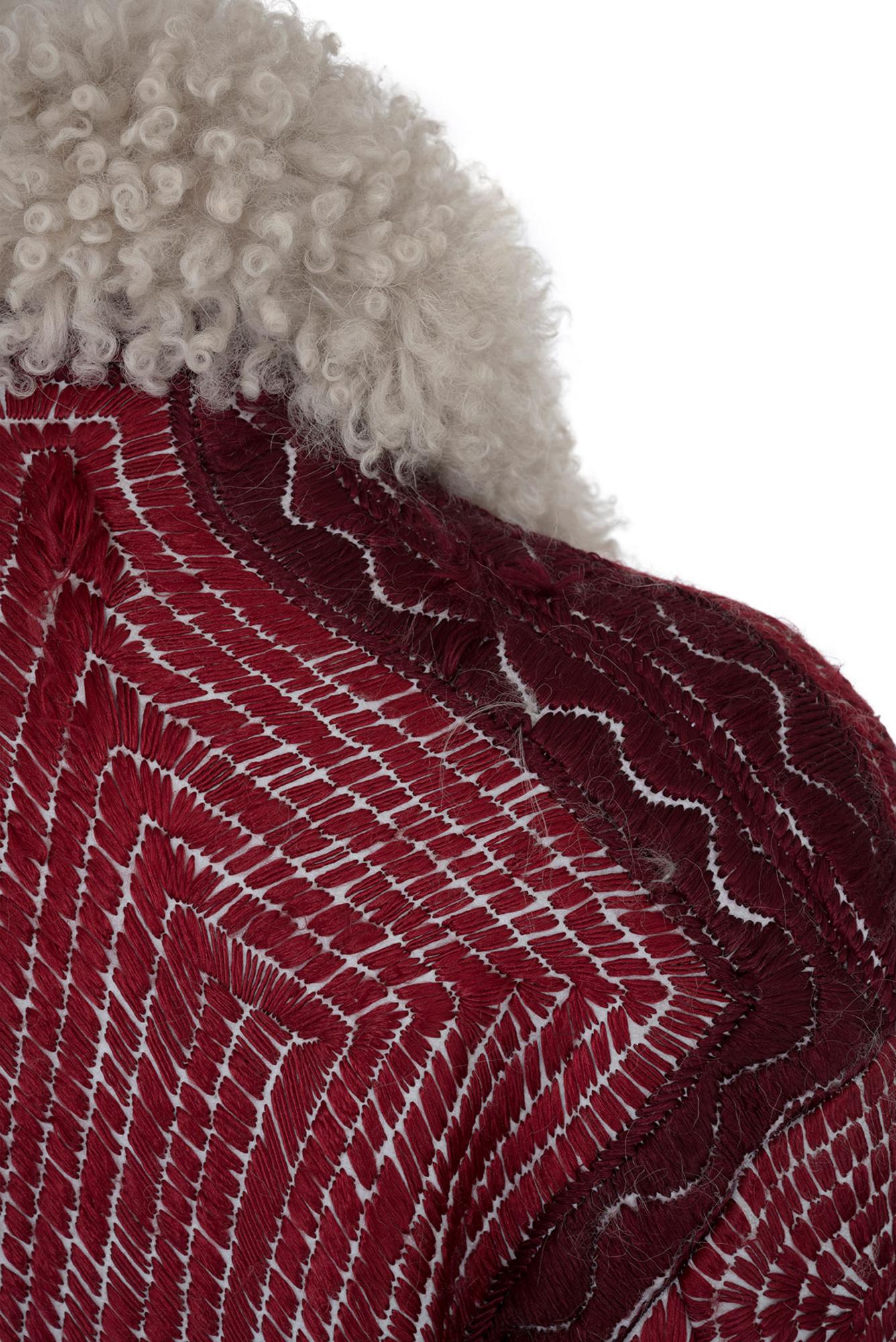 Raro prototipo di cappotto in shearling bianco con ricami fatti a mano rossi e bordeaux della collezione AI 01