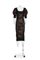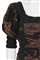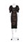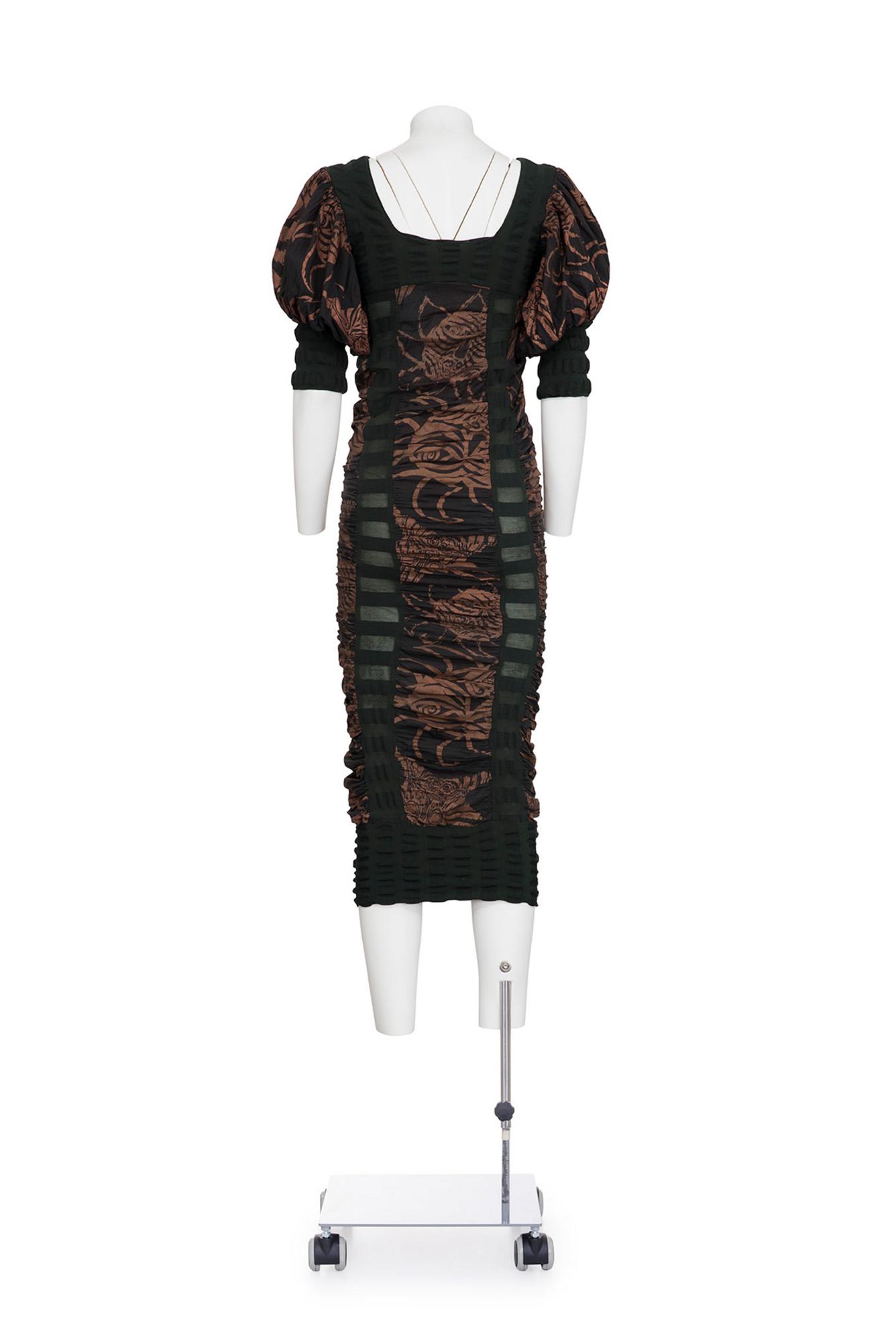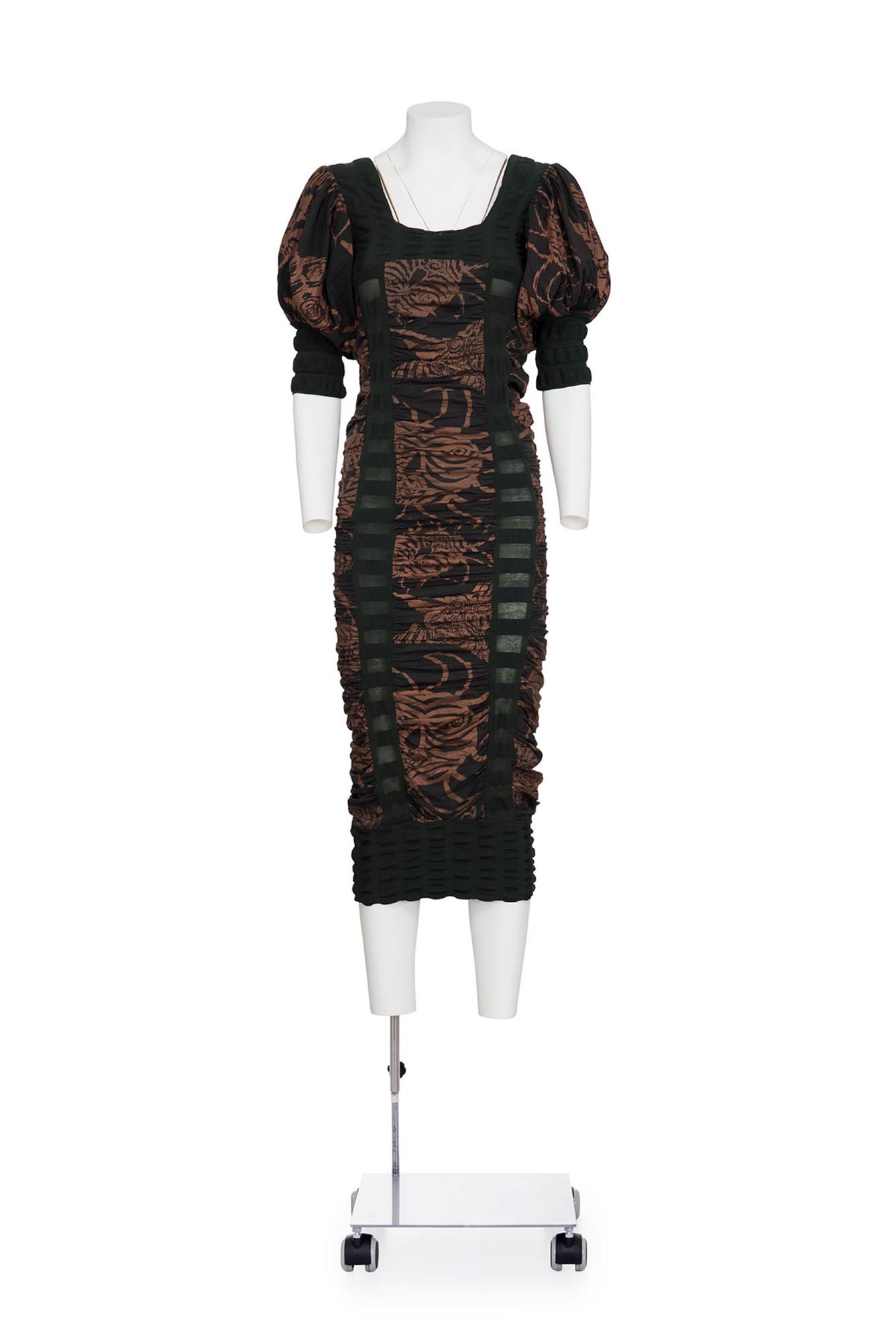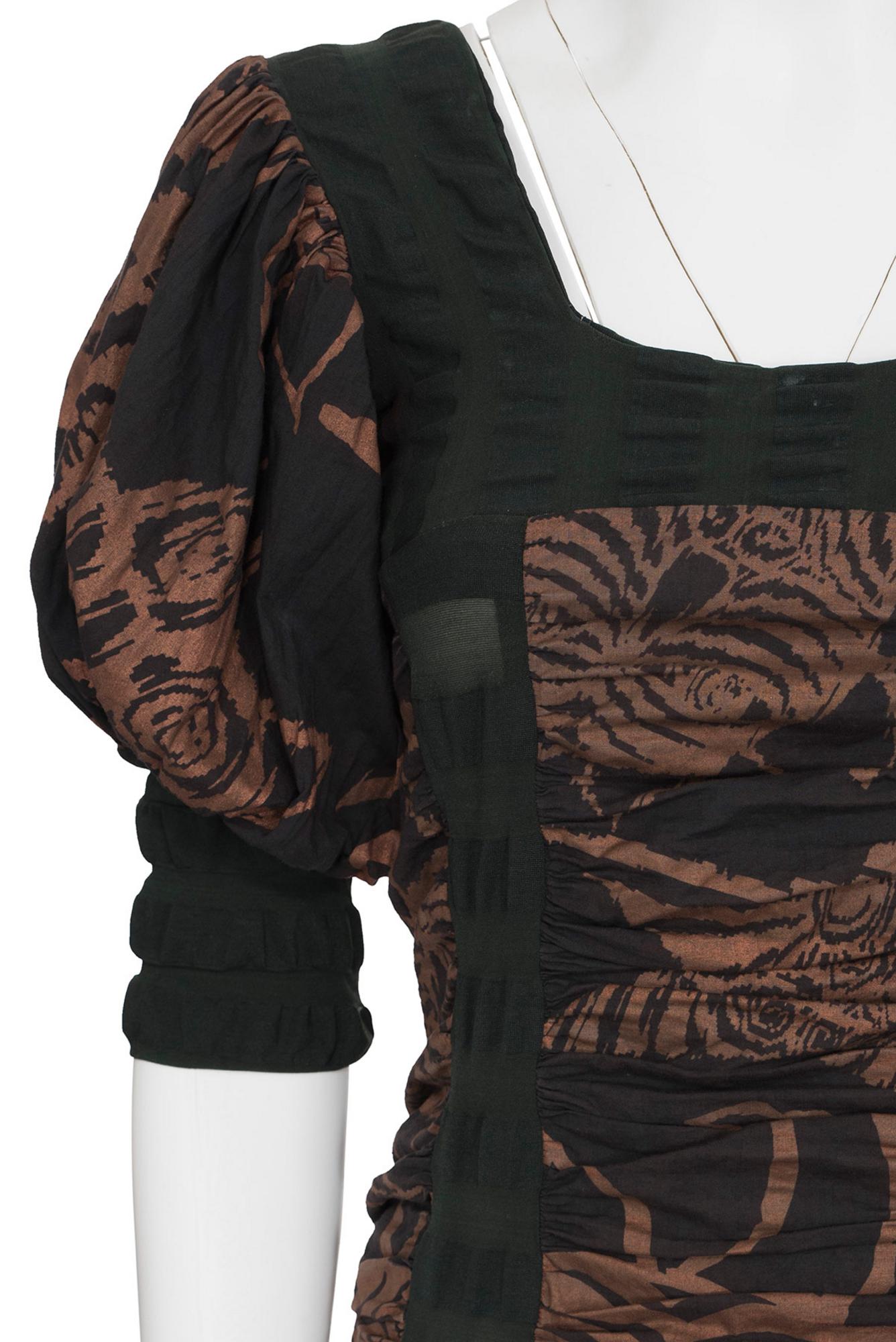 Rare and iconic rust and black printed and ruffled stretched dress with sheer striped panels and balloon sleeves from the 80's