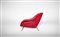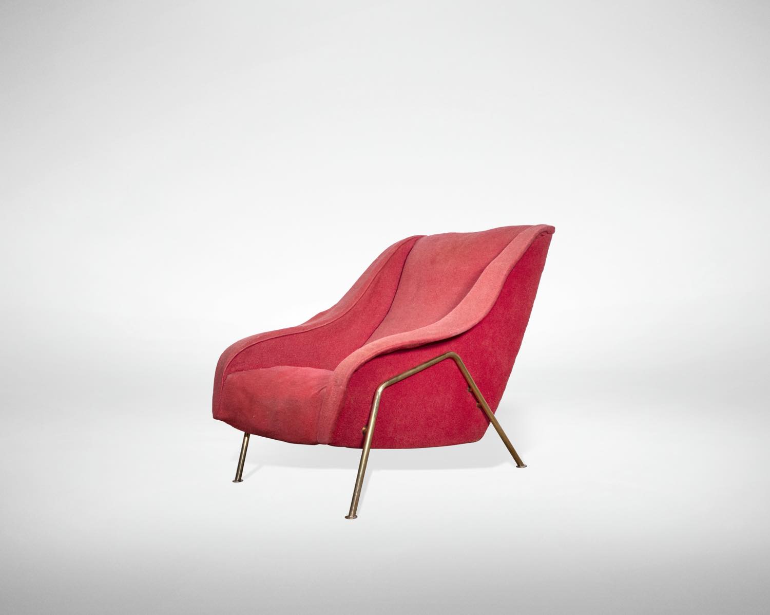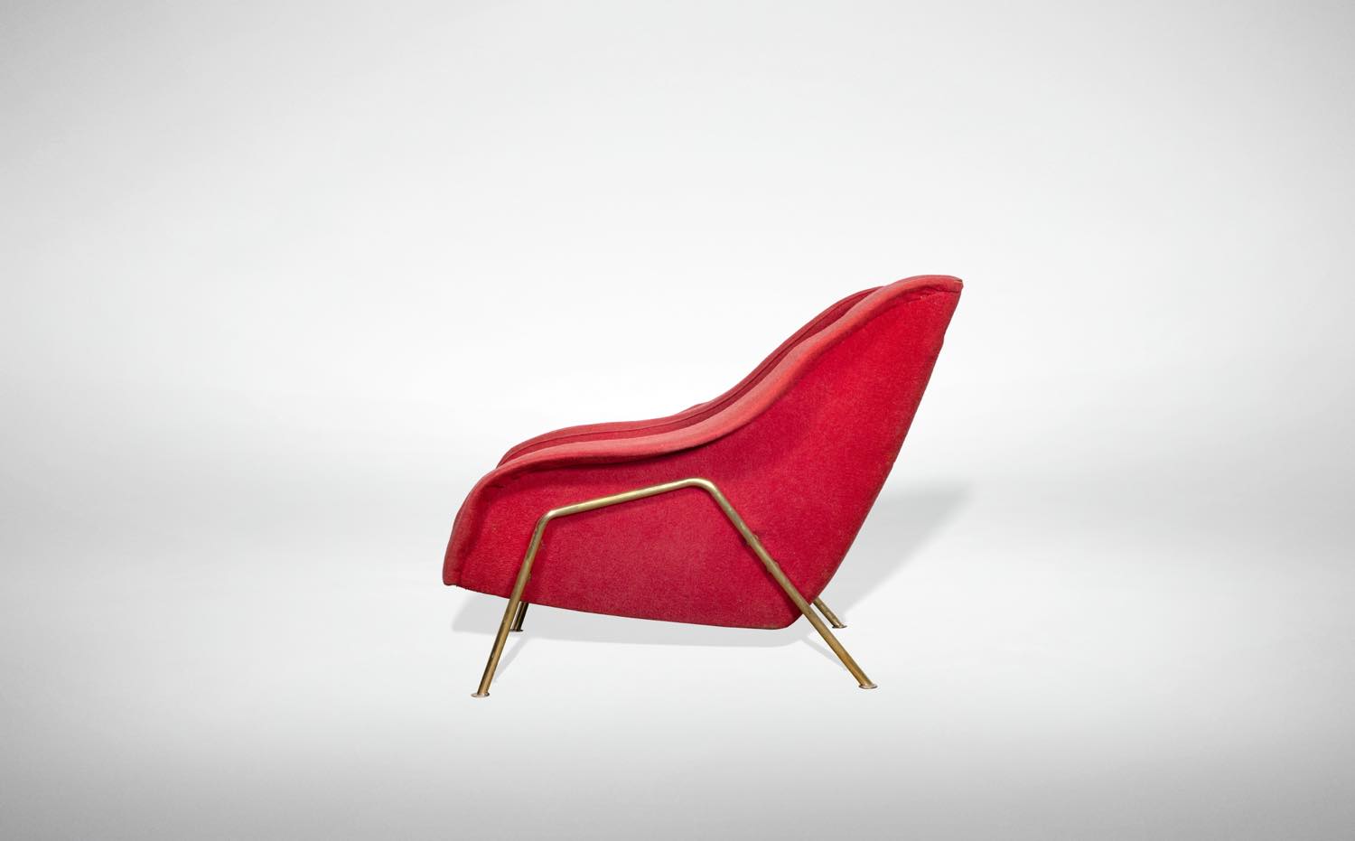 Poltrona rossa vintage con struttura in legno imbottita; base con tubolare in ottone.