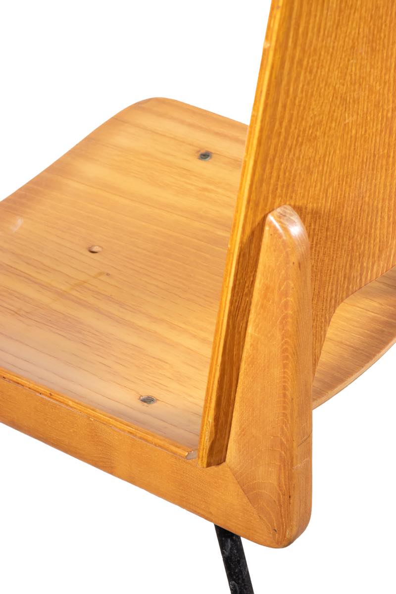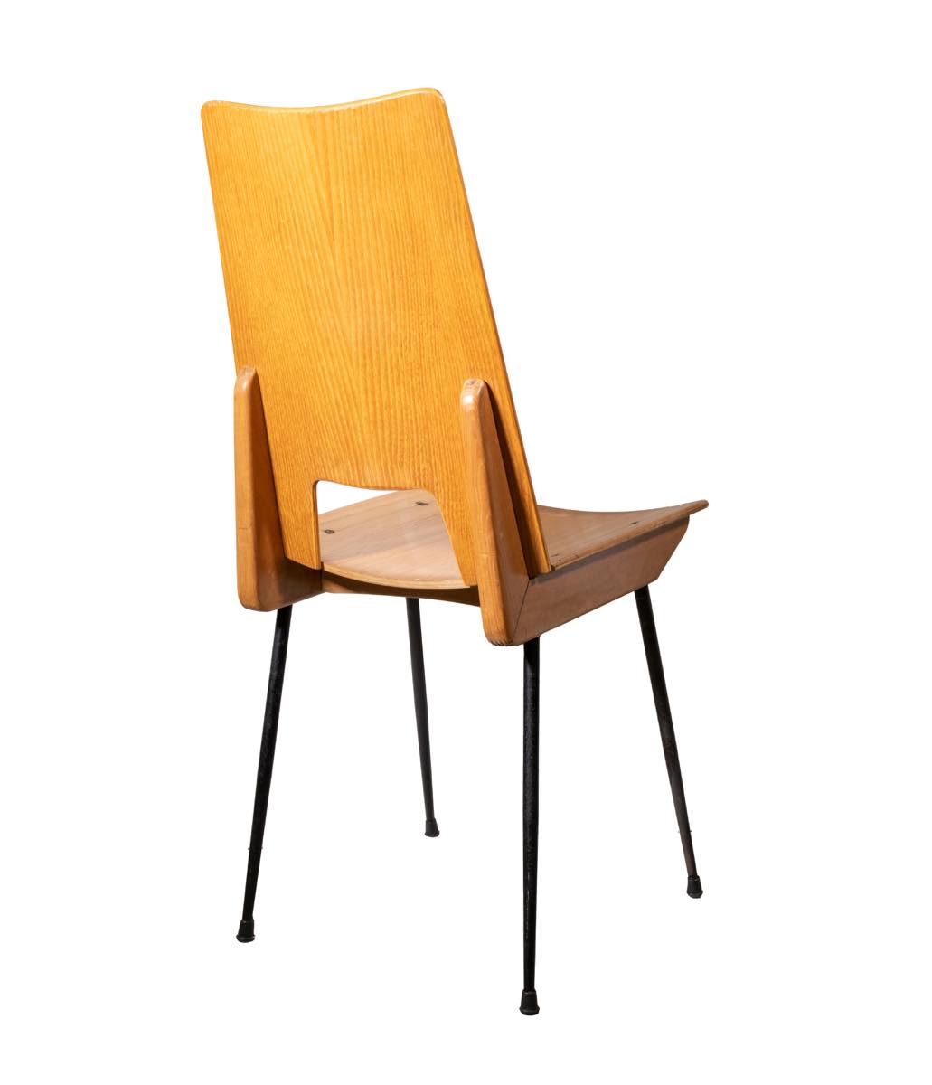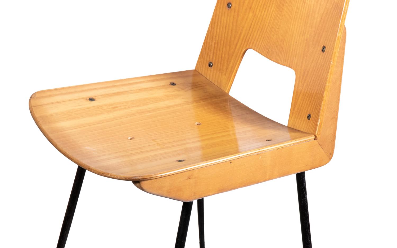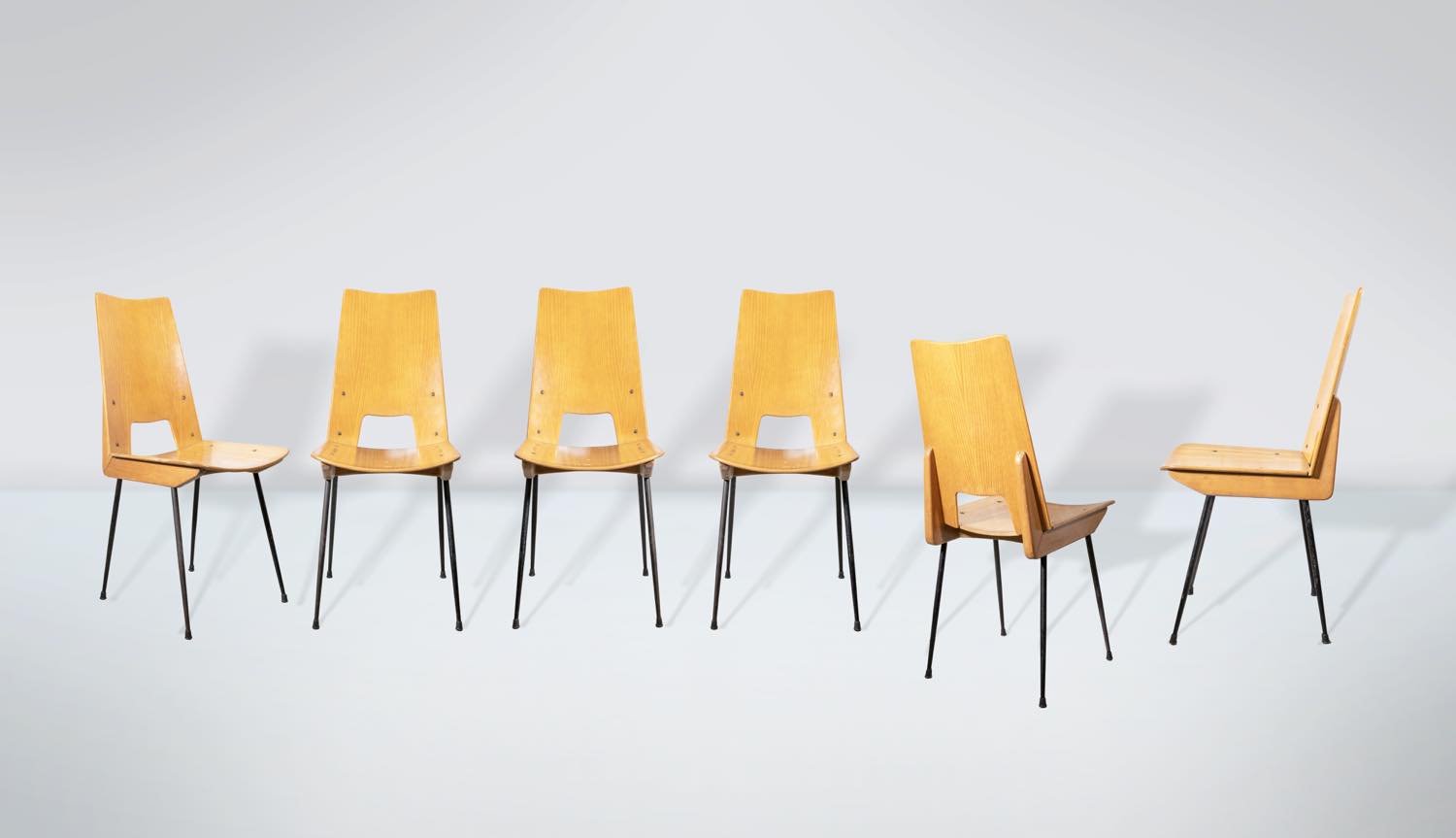 Un set di sei sedie per Legni Curvati realizzate in compensato di betulla e metallo nero.