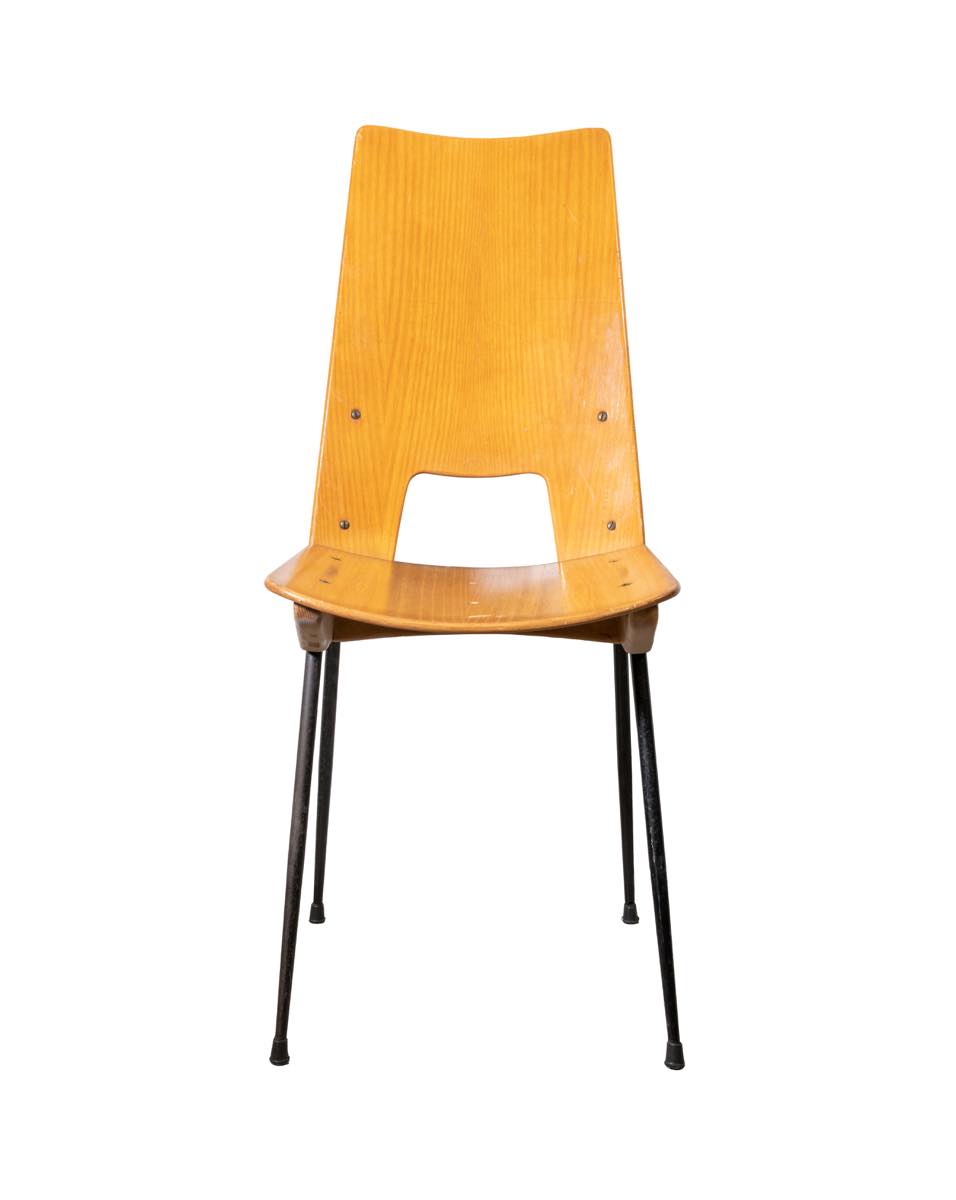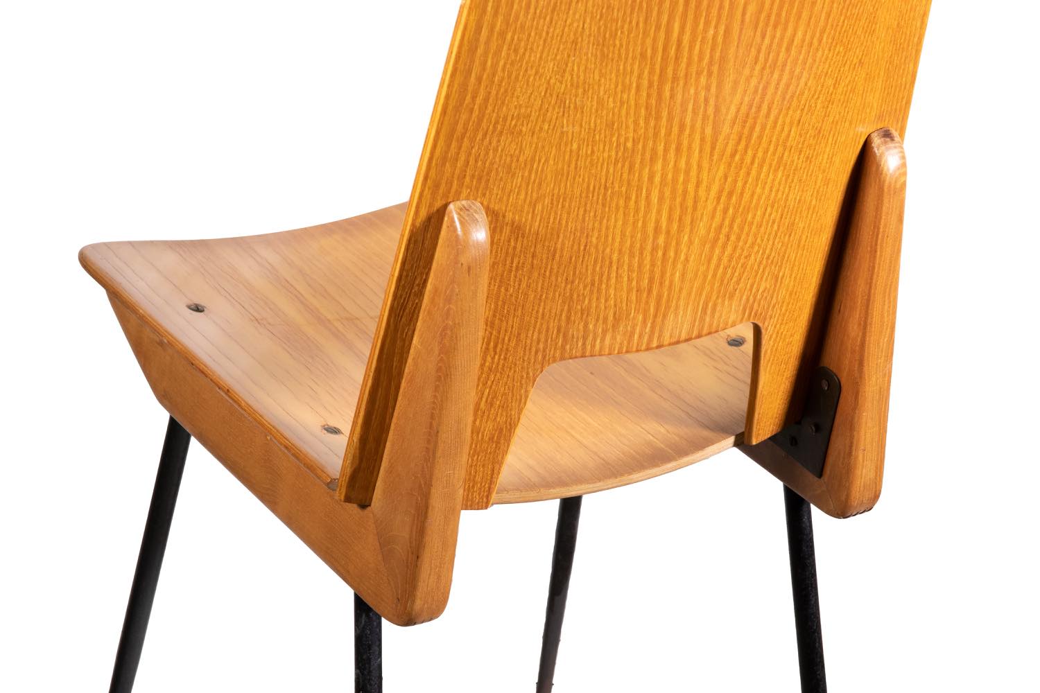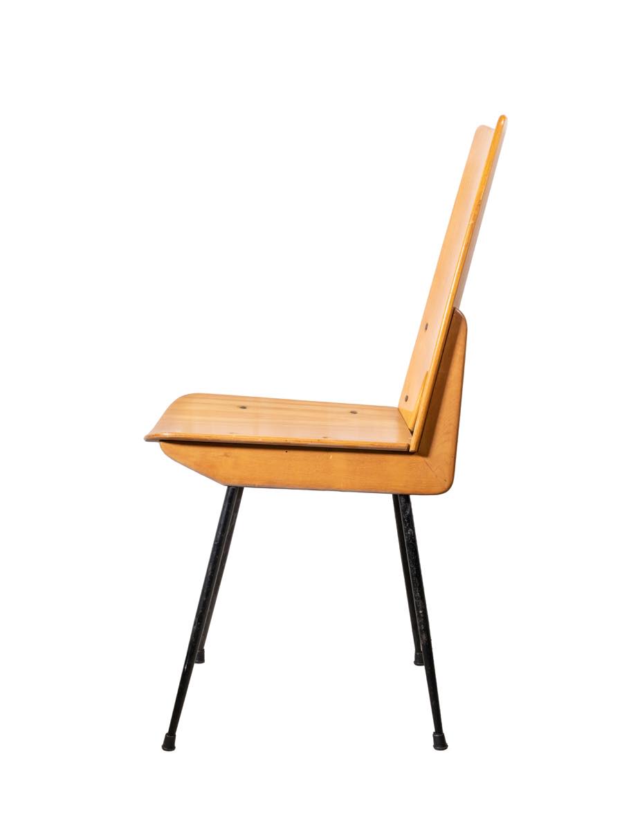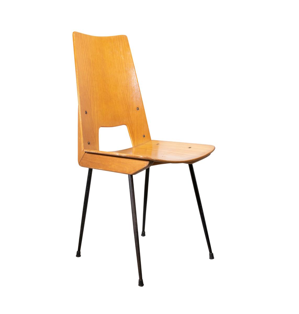 Un set di sei sedie per Legni Curvati realizzate in compensato di betulla e metallo nero.