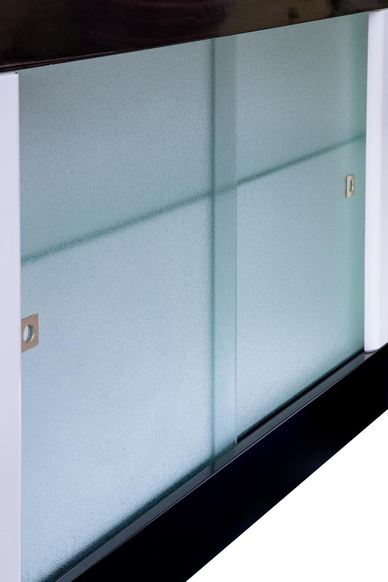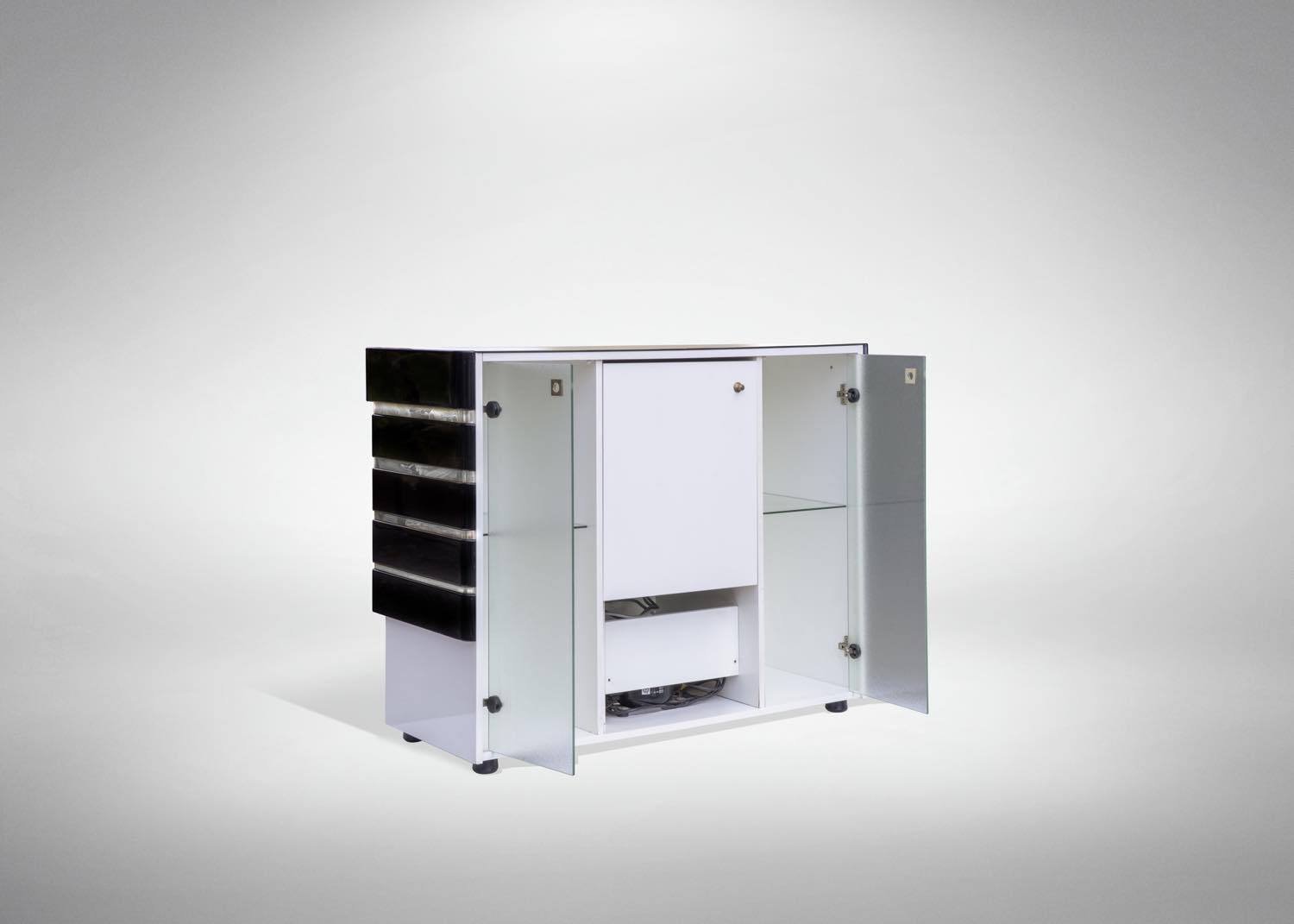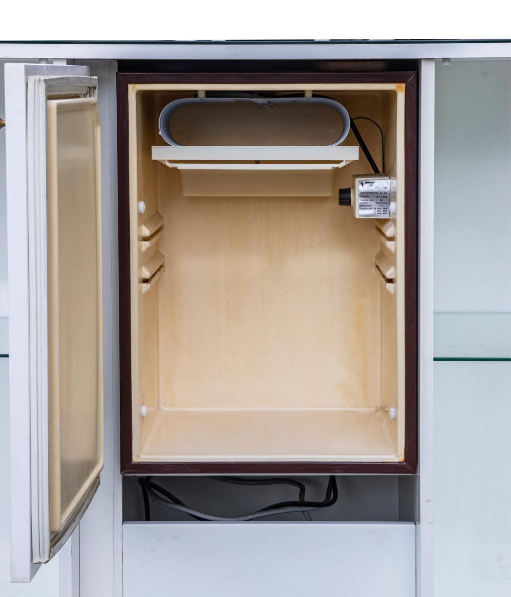 Mobile bar vintage con dettagli in ottone, frigorifero funzionante.