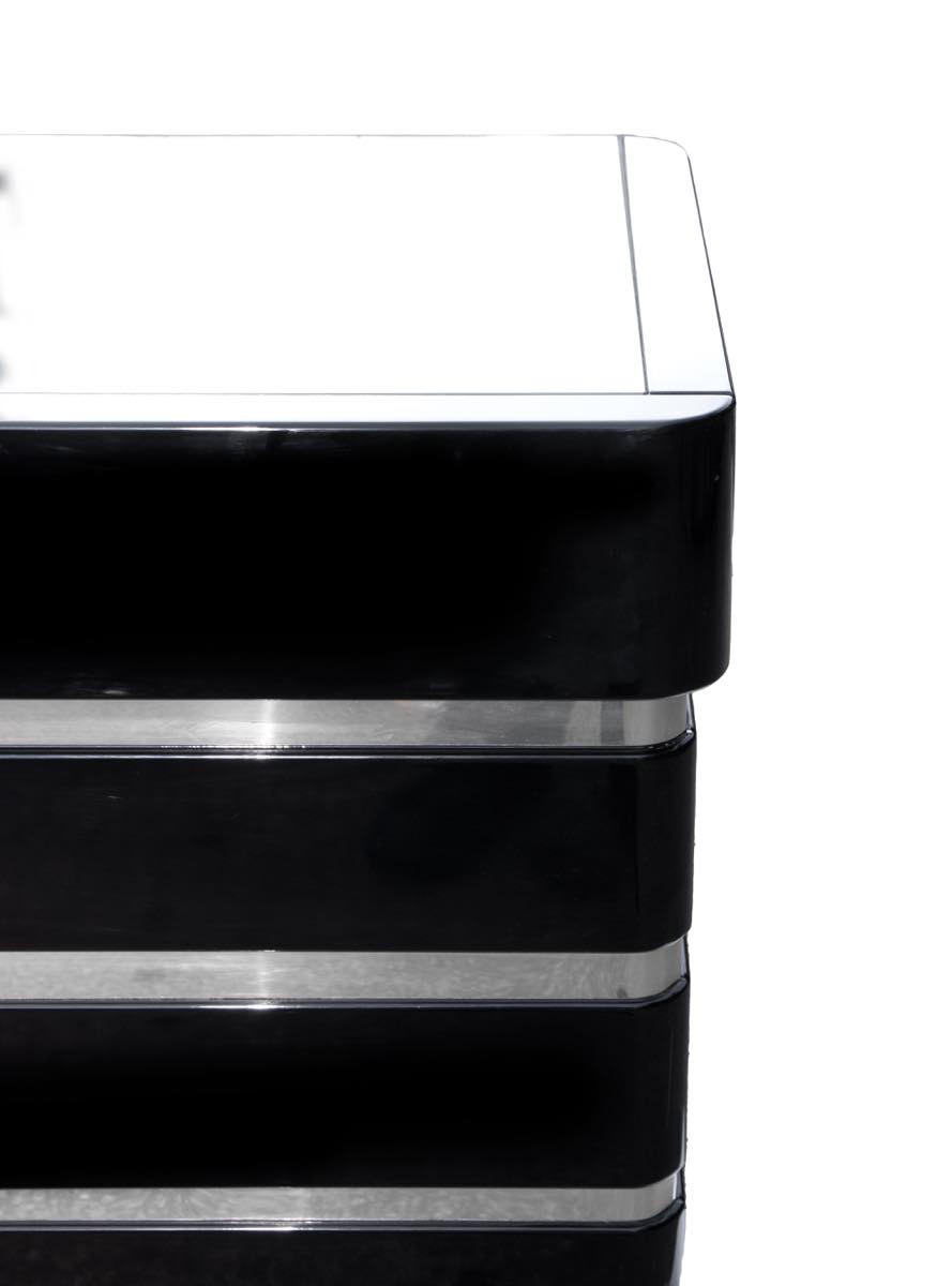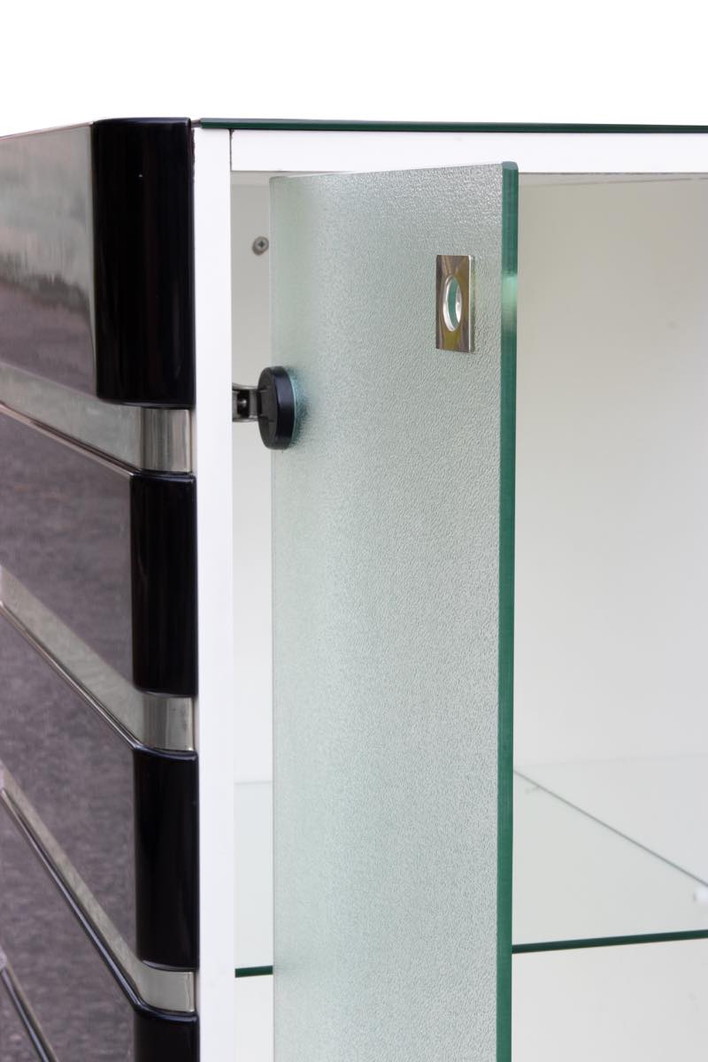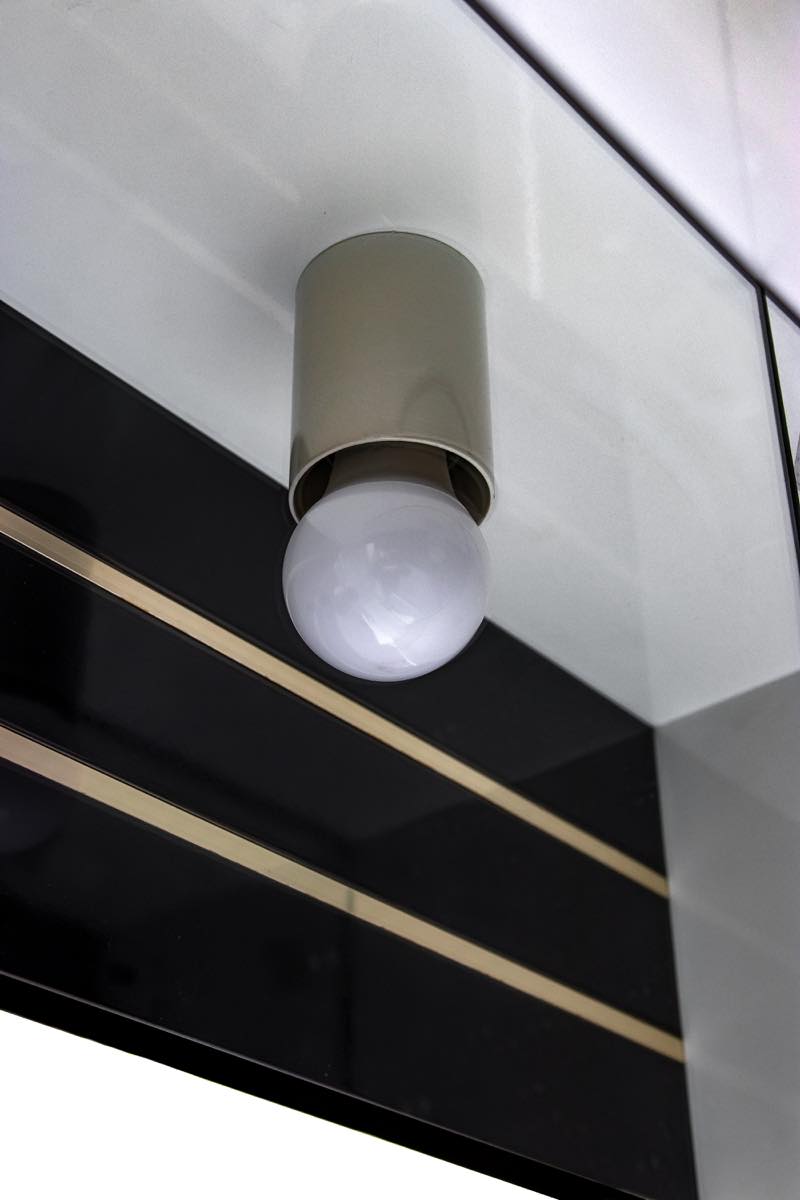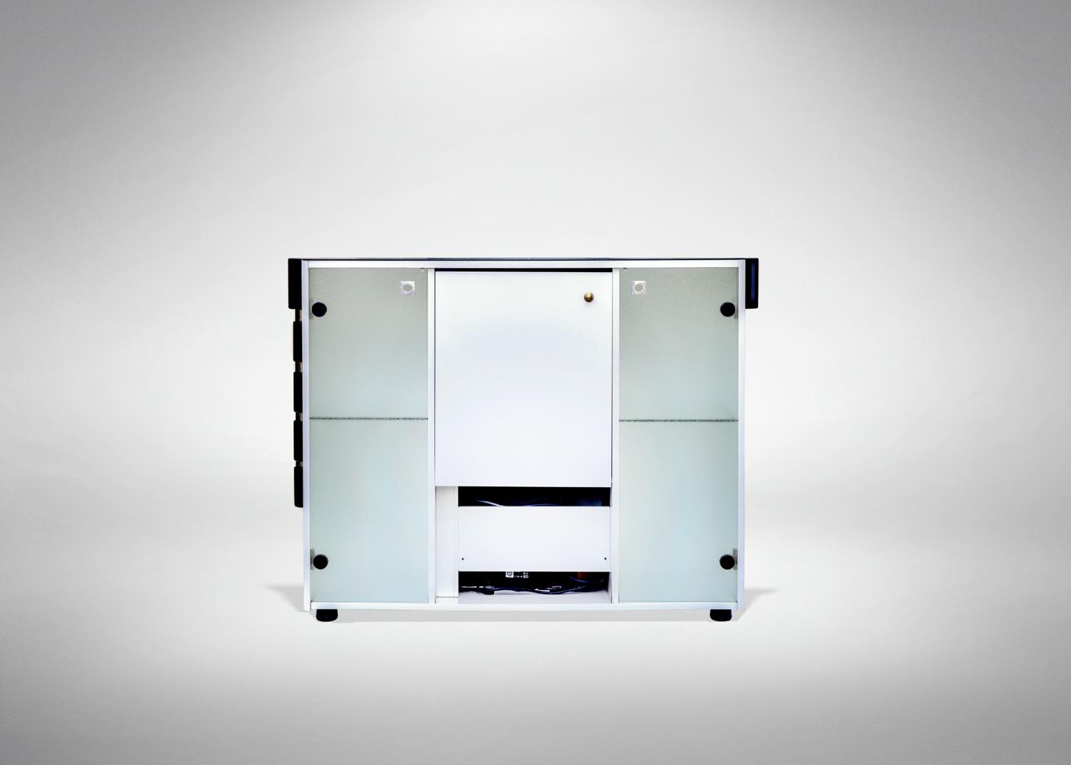 Mobile bar vintage con dettagli in ottone, frigorifero funzionante.