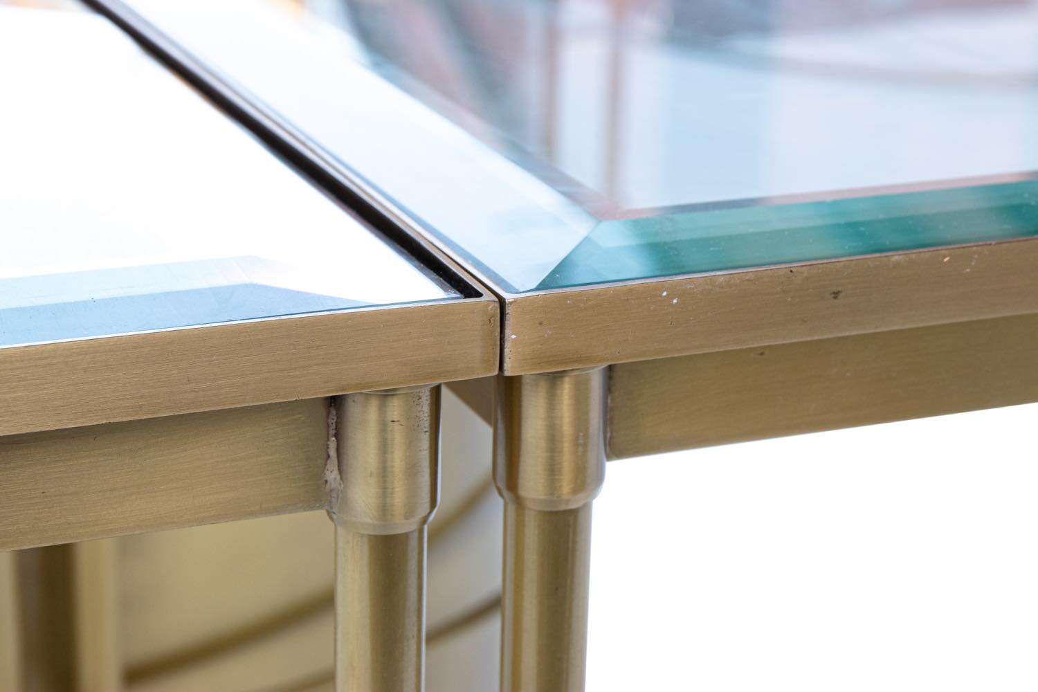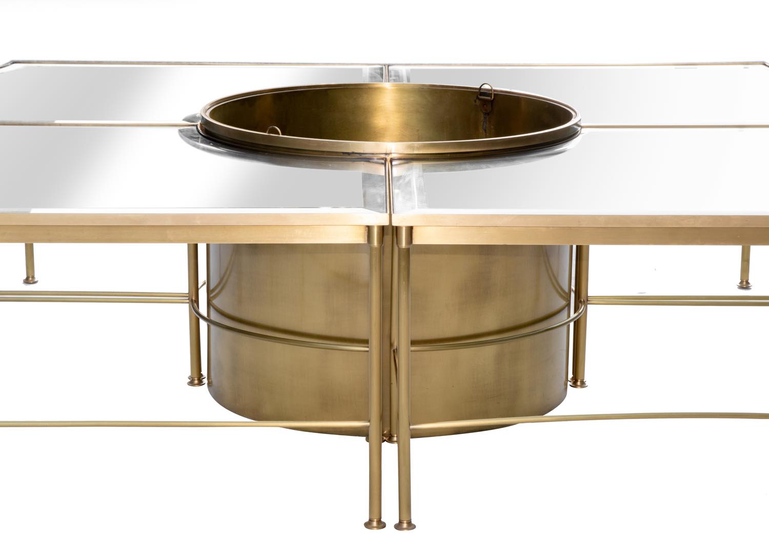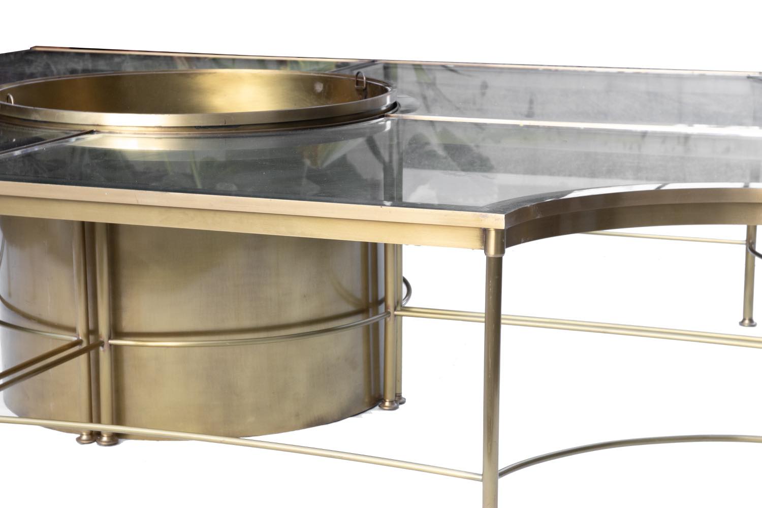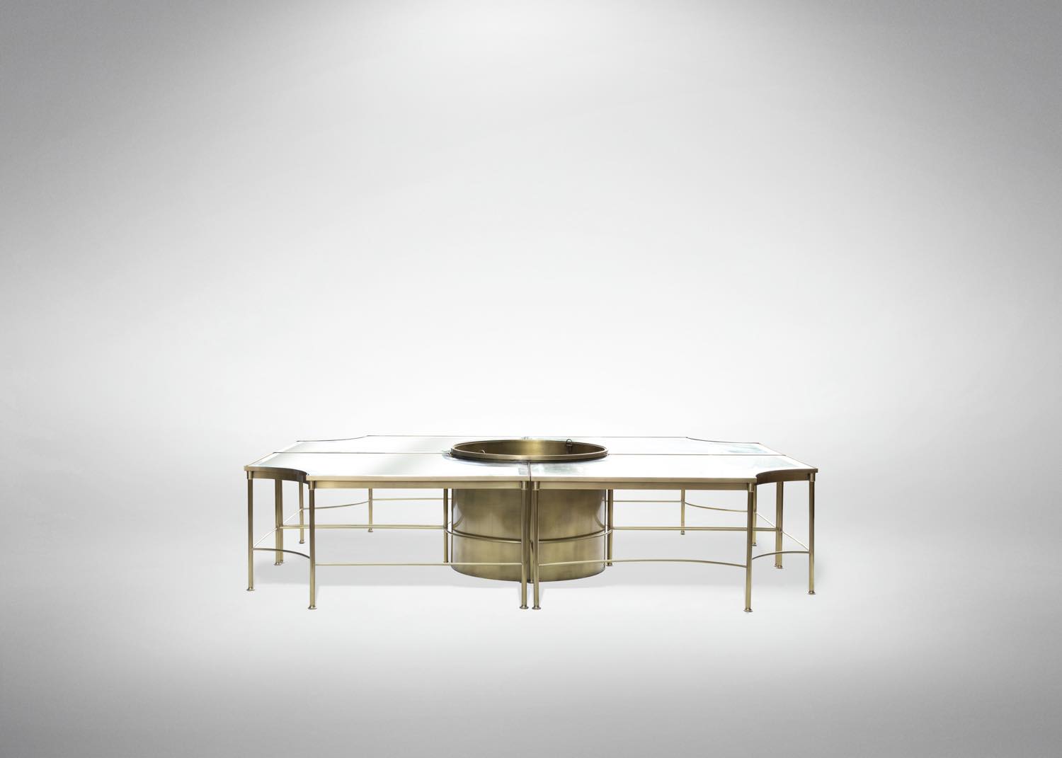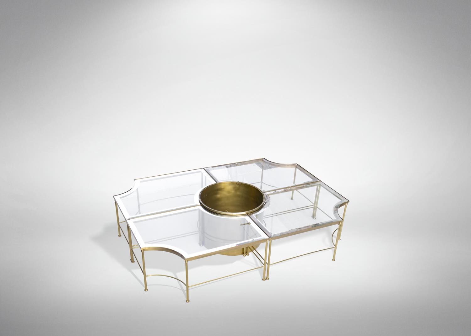 Tavolo in ottone e cristallo con 4 tavolini componibili con centrotavola per vaso di fiori attr. alla Maison Jansen.