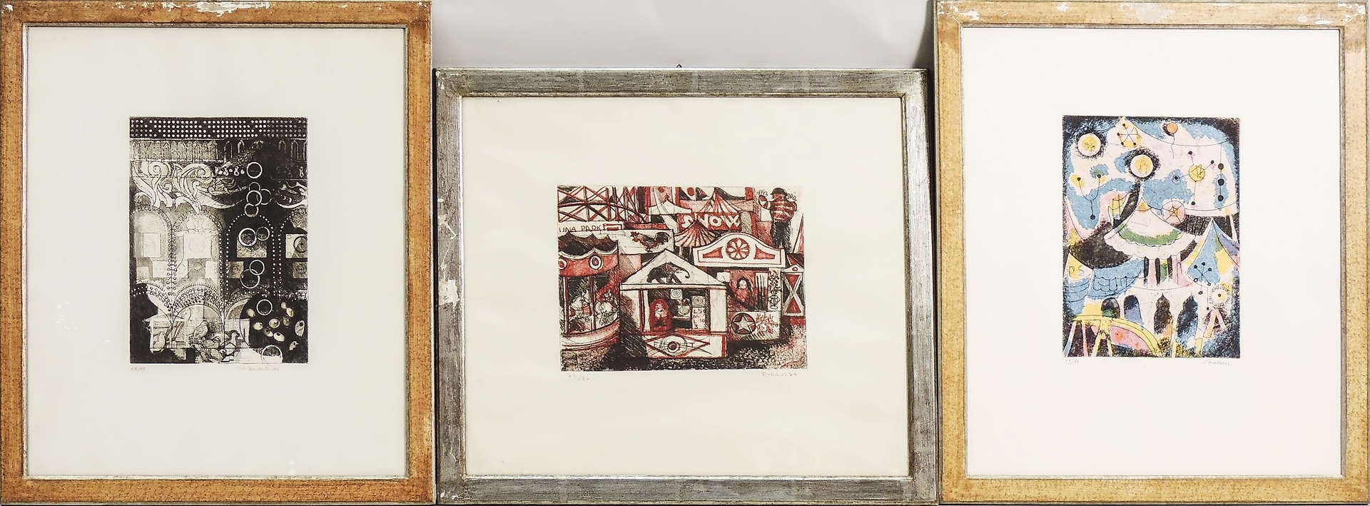 TRE INCISIONI - THREE ENGRAVINGS Enrico Paulucci, Francesco Tabusso e Giacomo Soffiantino, firmate e numerate, tratte dalla cartella Luna Park, in cornice (3) cm 33x25