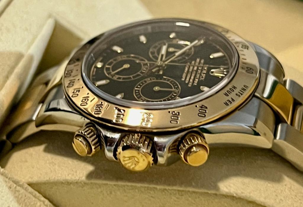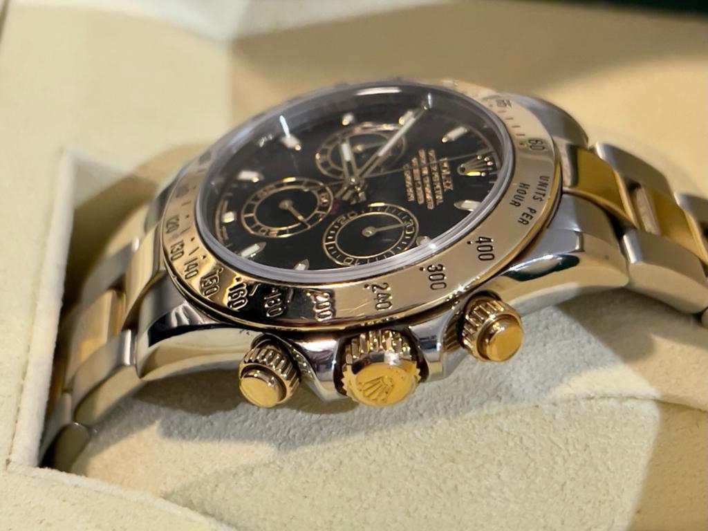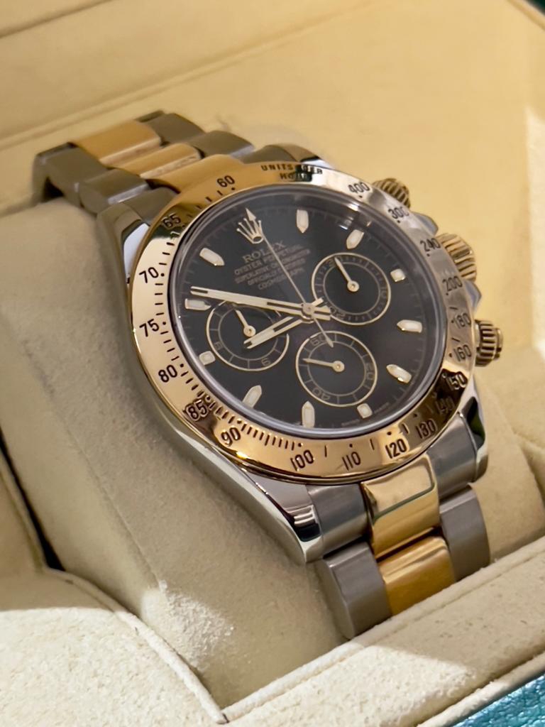 Marca Rolex Modello (Orologio) Daytona Numero di referenza 116523 Carica Automatico Materiale della cassa Oro/Acciaio Materiale cinturino Oro/acciaio Anno di produzione 2008/2012 Condizione Ottimo Corredo Con scatola di fornitura e documenti originali Carica Automatico Cassa Materiale della cassa Oro/Acciaio Diametro 40 mm Impermeabile 10 ATM Materiale lunetta Oro giallo Vetro Vetro zaffiro Quadrante Nero Numeri sul quadrante Senza numeri Cinturino Materiale cinturino Oro/acciaio Colore cinturino Oro/acciaio Chiusura Déployante Materiale chiusura Oro/Acciaio Funzioni Cronografo Altro Piccoli secondi