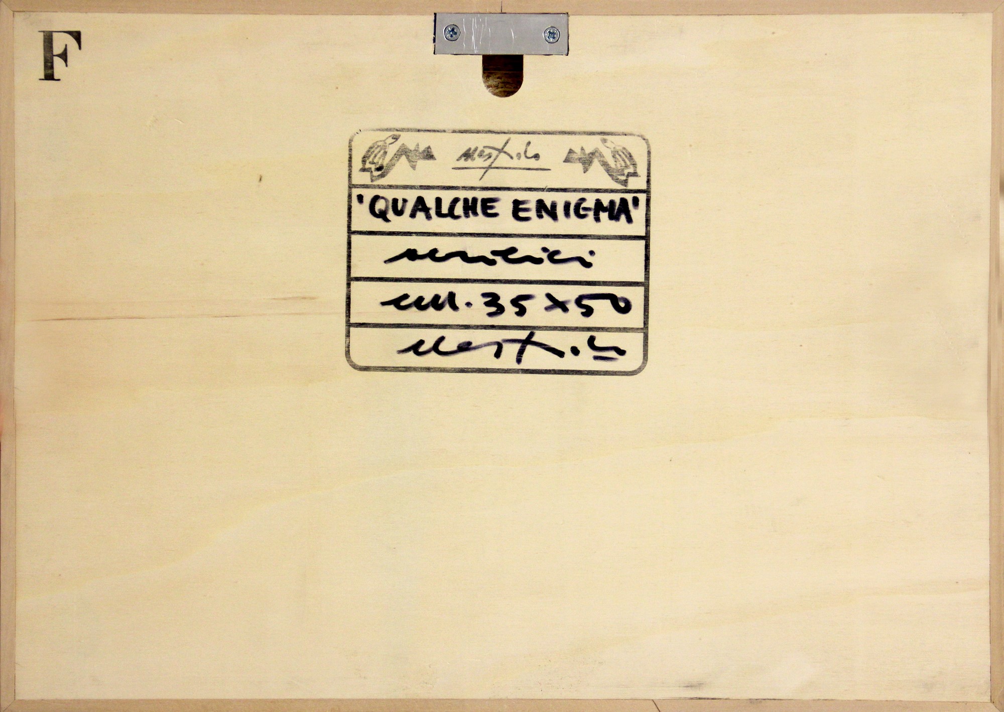 Titolo, tecnica, misure, firma "Qualche enigma, acrilici, cm. 35x50, Nespolo";