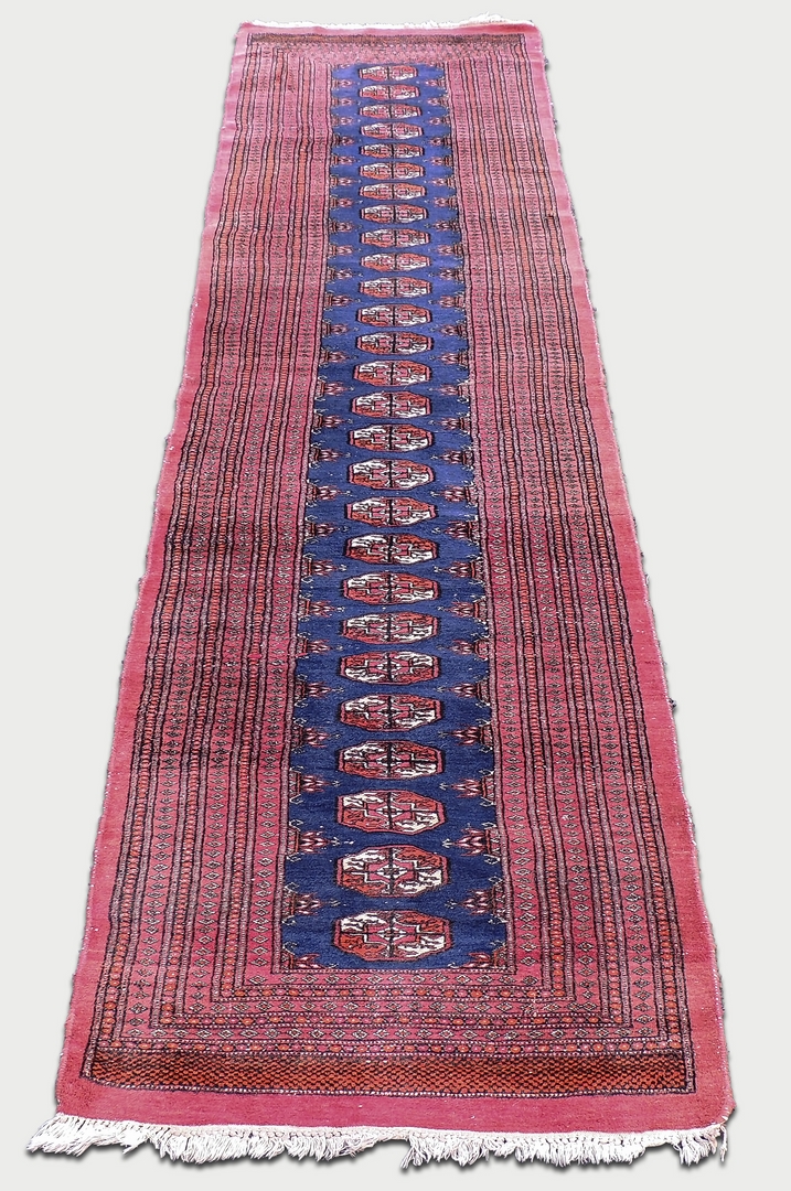 GALLERIA BUKARA - LONG BUKARA RUG fondo blu, campo con motivo a zampa di elefante, alta bordura nei toni del marrone e del ruggine cm 334x76,5