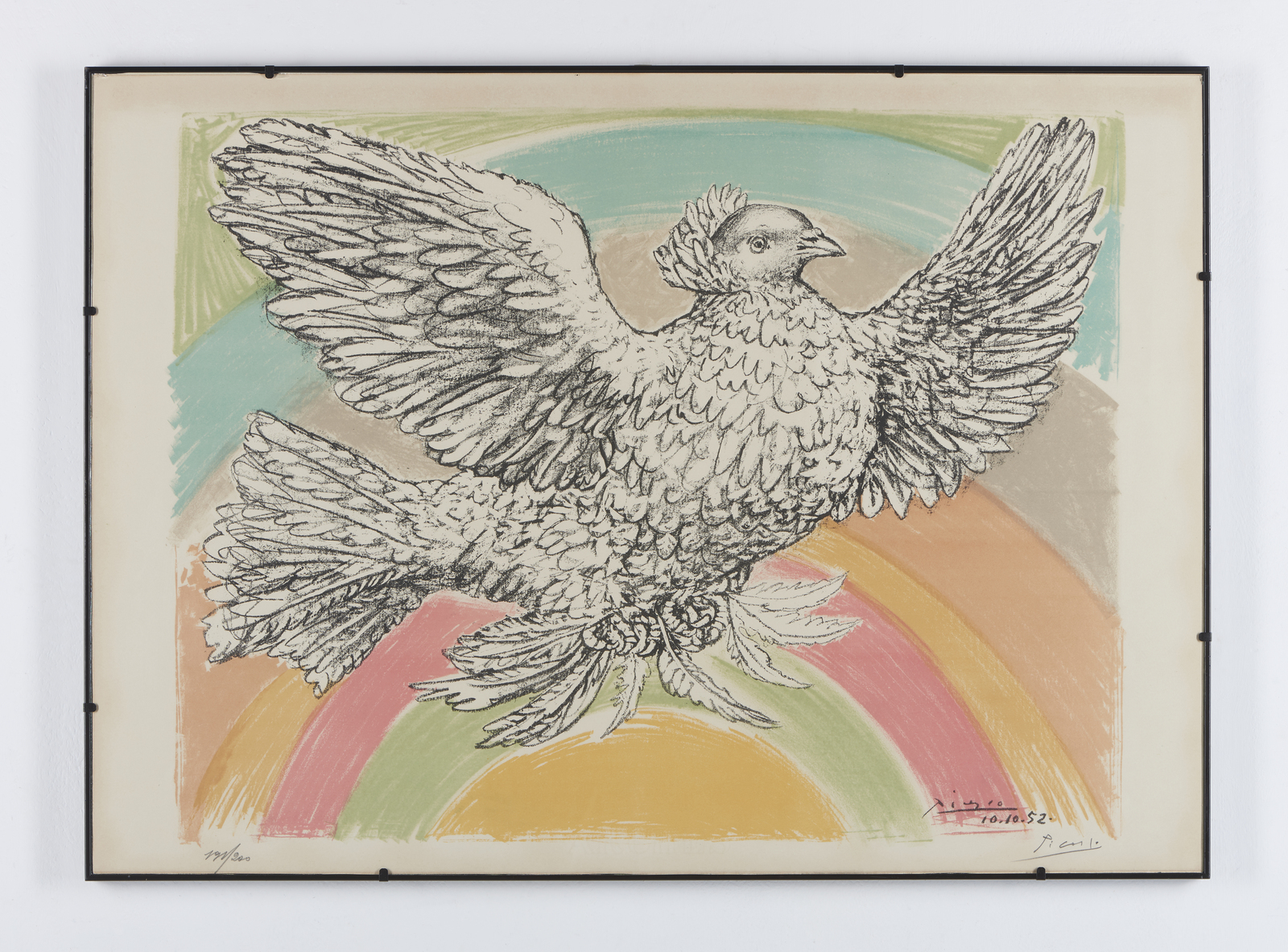 PICASSO PABLO (1881 - 1973) Colombe volant (à l'arc-en-ciel). 1952. Litografia. Cm 76,20 x 55,00. 191/200. Tiratura e firma in basso a destra a matita. Firma e anno in basso a destra a stampa. Filigrana Arches. Edizione totale: 200 esemplari. Pubblicazioni: Picasso, catalogue de l'oeuvre gravé et lithographié, 1904-1967, a cura di G. Bloch, edizioni Kornfeld et Klipstein, Berna, 1968, n°712; Picasso lithographe. Catalogue raisonné, a cura di Fernand Mourlot, n. 214. Provenienza: Collezione Lana, Milano. Cornice presente