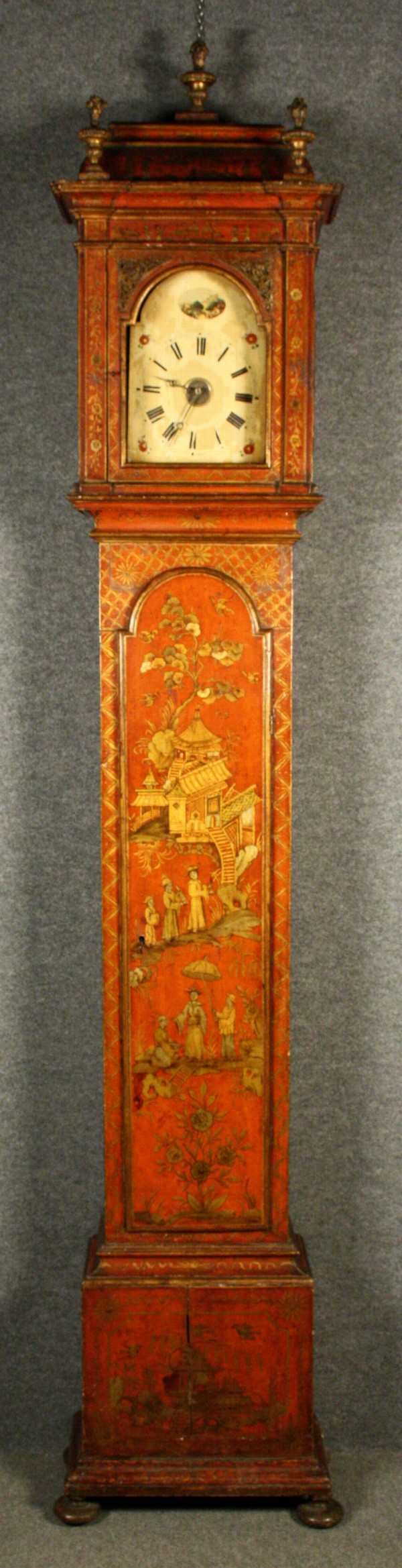 Firmato, datato. Orologio a torre in legno laccato rosso a motivi chinoiserie e floreali. XVIII secolo. Meccanica da revisionare. Mis. Lung. cm. 45 Alt. cm. 245 Prof. cm. 25 ca.