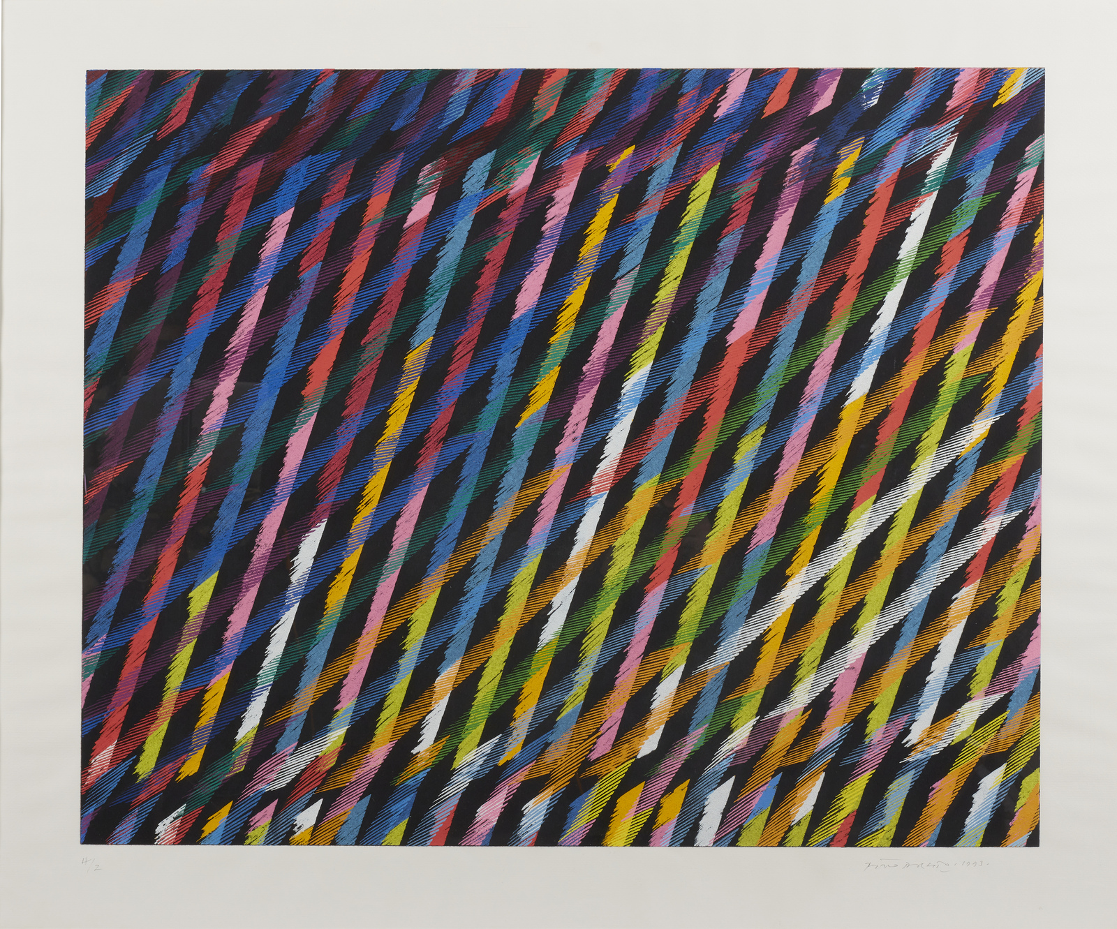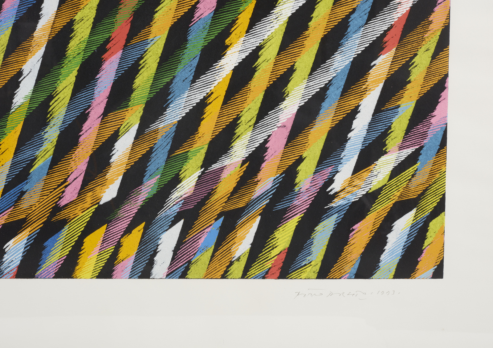 DORAZIO PIERO (1927 - 2005) Blueo Monn. 1993. Serigrafia e fibre sintetiche su carta. Cm 120,00 x 100,00. H/Z. Tiratura, firma e anno in basso a matita. Edizione totale: 200 esemplari, di cui 100 esemplari numerati da 1/100 a 100/100; 50 esemplari numerati da I/L a L/L; n° 25 lettere dell'alfabeto dalla a alla z; n° 20 p.d.a. Pubblicazione: Piero Dorazio. 10 serigrafie 1968-1992, a cura di Claudio Spadoni, Studio Idola, Forlì, tav. n°6. Cornice presente