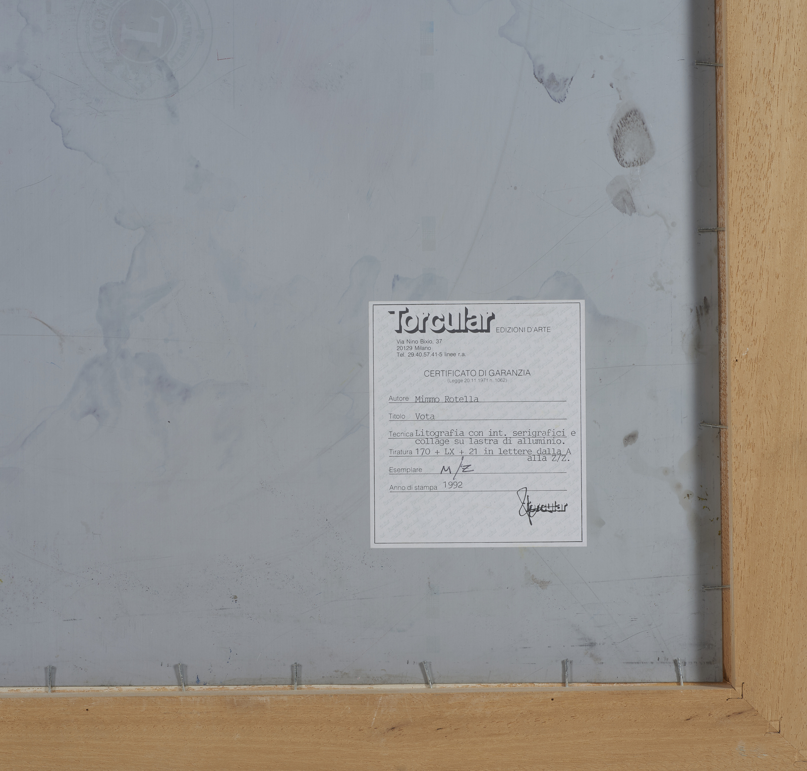 ROTELLA MIMMO (1918 - 2006) Vota. 1992. Litografia e collage. Cm 50,00 x 100,00. M/Z. Tiratura e firma in basso a pennarello. Al retro cartiglio descrittivo Torcular Edizioni d'Arte. Editore:Torcular Edizioni d'Arte, Milano. Edizione totale: 170 esemplari numerati da 1/170 a 170/170+LX esemplari numerati da I/LX a LX/LX +21 esemplari numerati da A/Z a Z/Z. Certificato di provenienza Galleria Picma, Verona. Esposizioni: Pop Show. I grandi maestri della Pop Art, Galleria Picma, Verona, 1-18 novembre 2007. Anni '90. Cornice presente