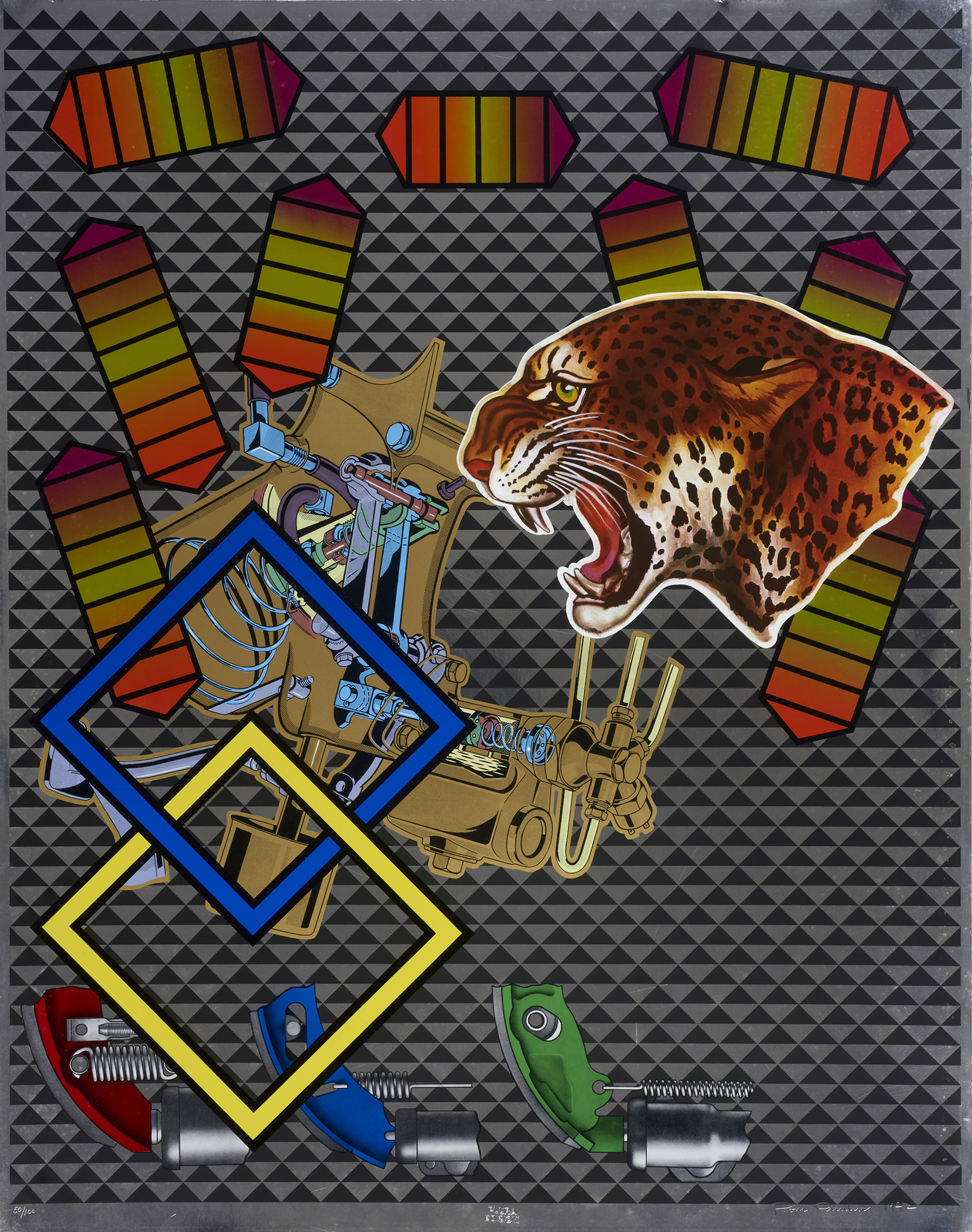 PHILLIPS PETER (n. 1939) Impeller (Gray). 1972. Serigrafia su carta argentata. Cm 69,00 x 87,00. 50/100. Tiratura, firma e anno in basso.Timbro a secco Plura Edizioni, Milano, in basso al centro. Edizione totale: 100 esemplari + a.p. Opera pubblicata sul sito Peter Phillips nella sezione - Prints. Lievi difetti.