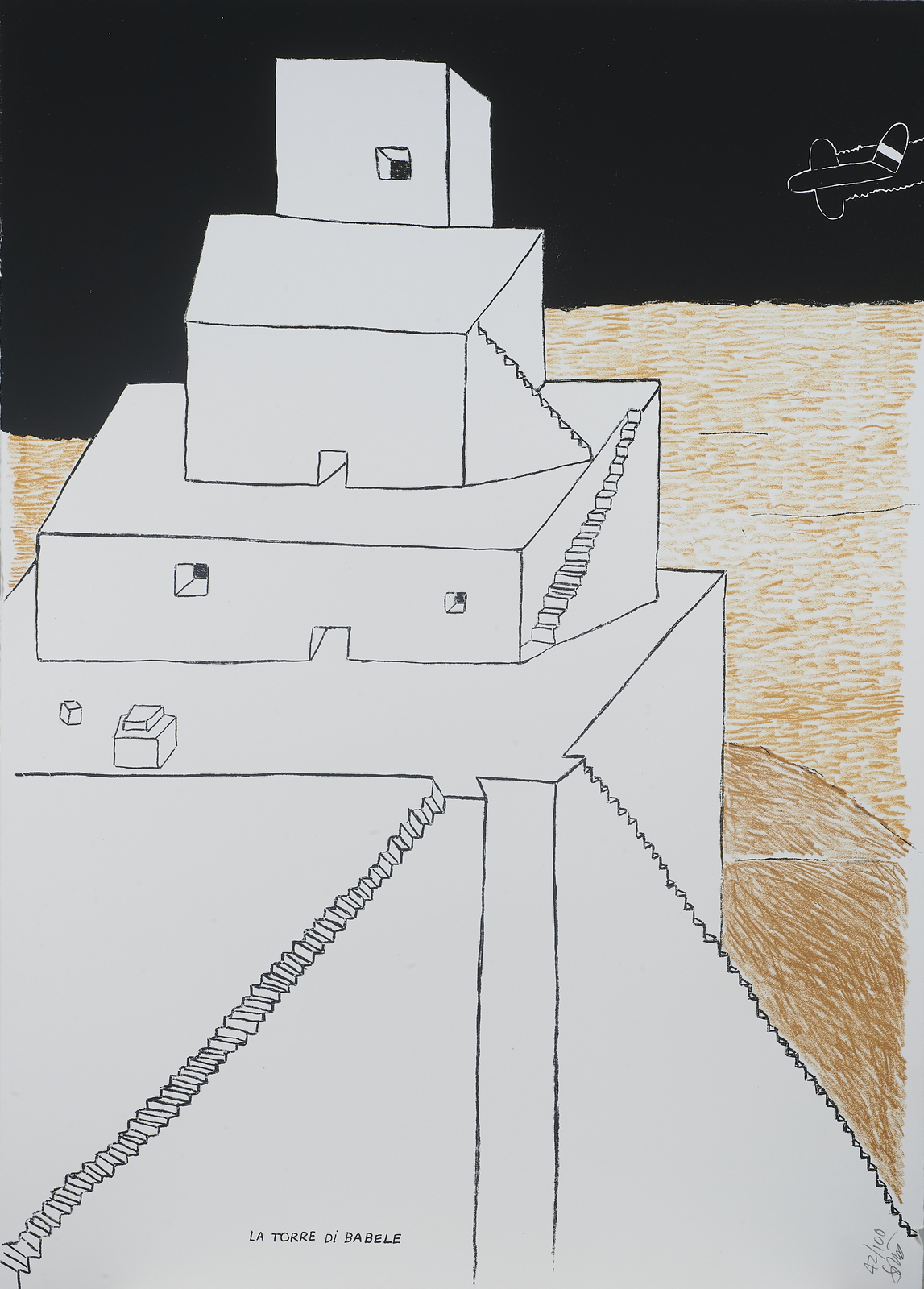 SOTTSASS ETTORE (1917 - 2007) La torre di Babele. Serigrafia. Cm 50,00 x 70,00. 42/100. Tiratura e firma a matita in basso a destra. Titolo in basso al centro. Edizione totale: 100 esemplari +3 p.d.a.