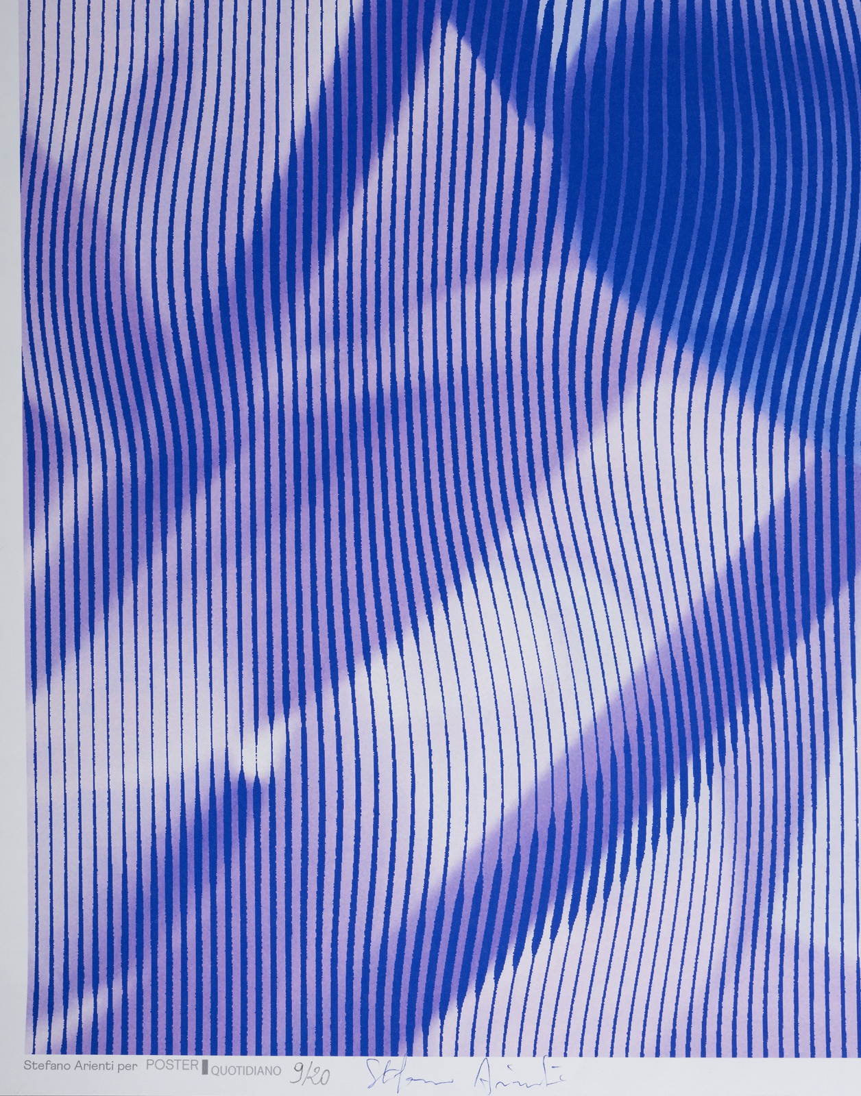 ARIENTI STEFANO (n. 1961) Senza titolo. Poster. Cm 50,00 x 70,00. 9/20. Tiratura a matita e firma a penna biro in basso a sinistra.Stefano Arienti per Poster Quotidiano. Lievi difetti. L’opera è stata realizzata in occasione dell’iniziativa milanese del 4 maggio 2020, “Poster Quotidiano”, organizzata dagli artisti Iva Lulashi, Adrian Paci e Fabio Roncato, insieme ai curatori Giuseppe Frangi e Rischa Paterlini, in collaborazione con l’associazione culturale Casa Testori e il collezionista Giuseppe Iannacone. I 26 artisti coinvolti, tra cui Emilio Isgrò, Marinella Senatore e Stefano Arienti, hanno realizzato opere in formato poster, il cui ricavato è andato a sostegno dell’Onlus Fondazione Progetto Arca. Tutti i poster sono stampati in edizioni limitate di 20 esemplari.