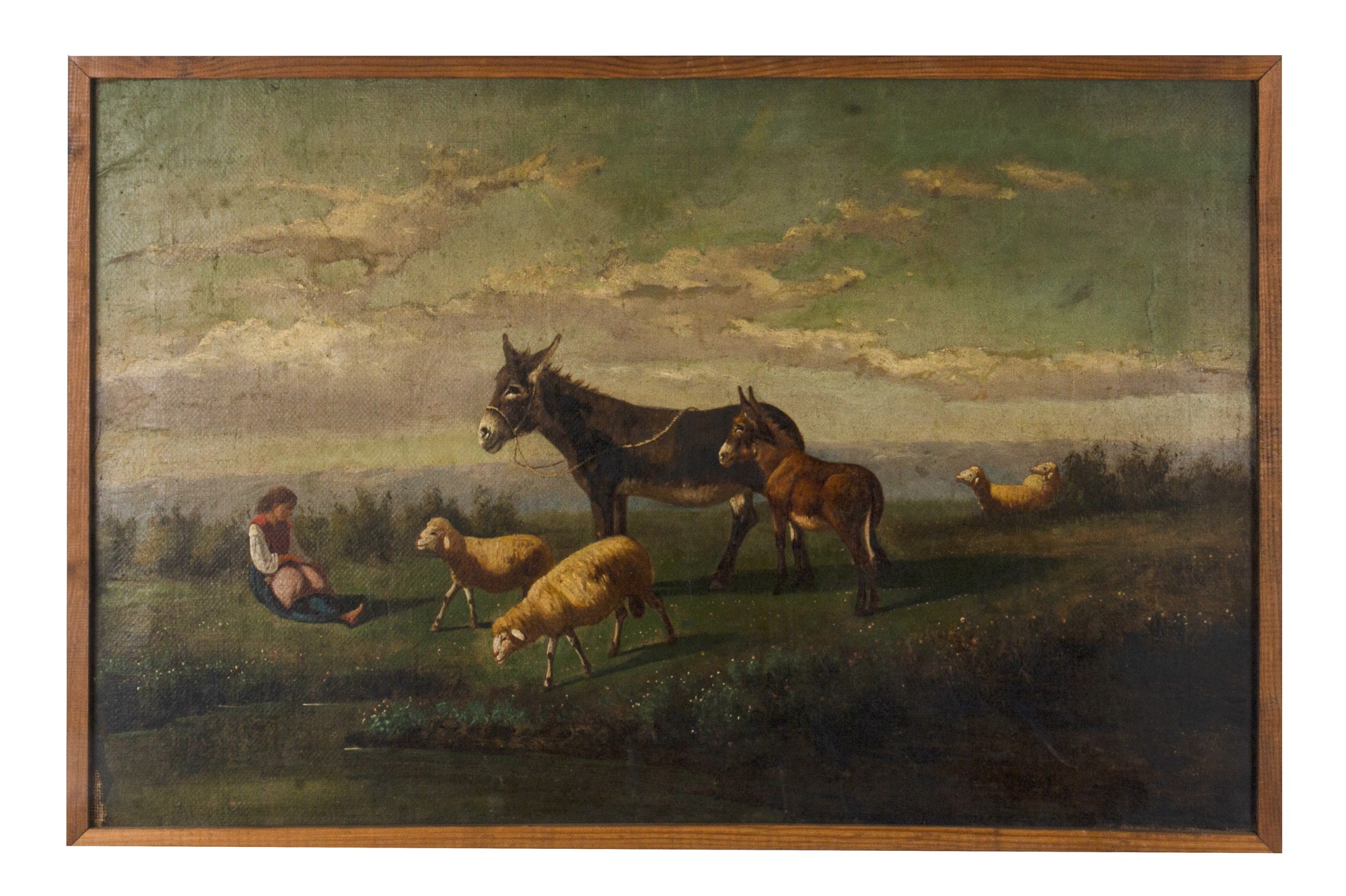 Dipinto raffigurante paesaggio campestre con pastorella, pecore e asini