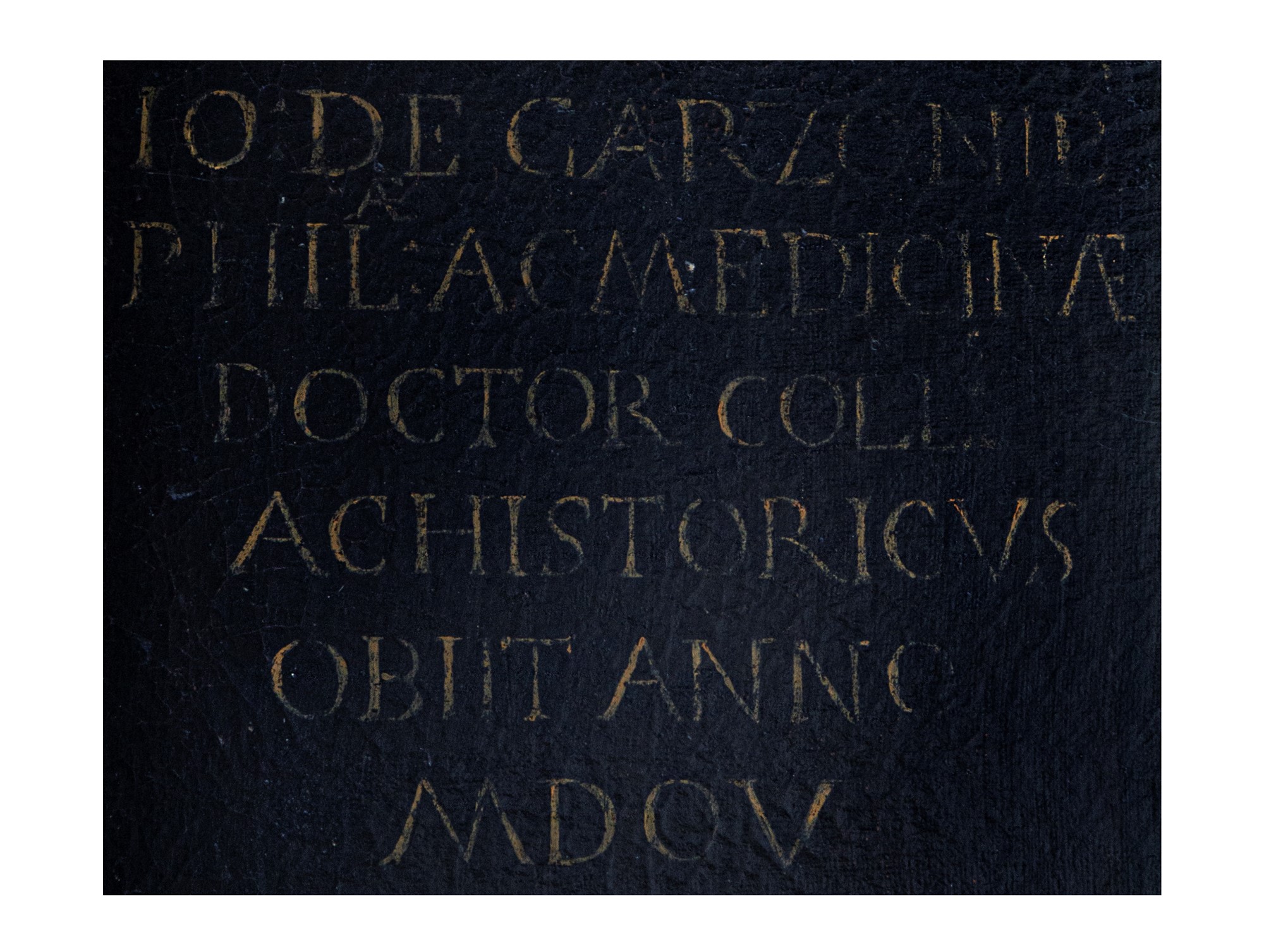 Il dipinto reca in alto a sinistra la scritta a lettere capitali "IO.DE.GARZONE.PHIL: AC MEDICINAE DOCTOR COLL. ACHISTORICUS OBIIT ANNO MDCV