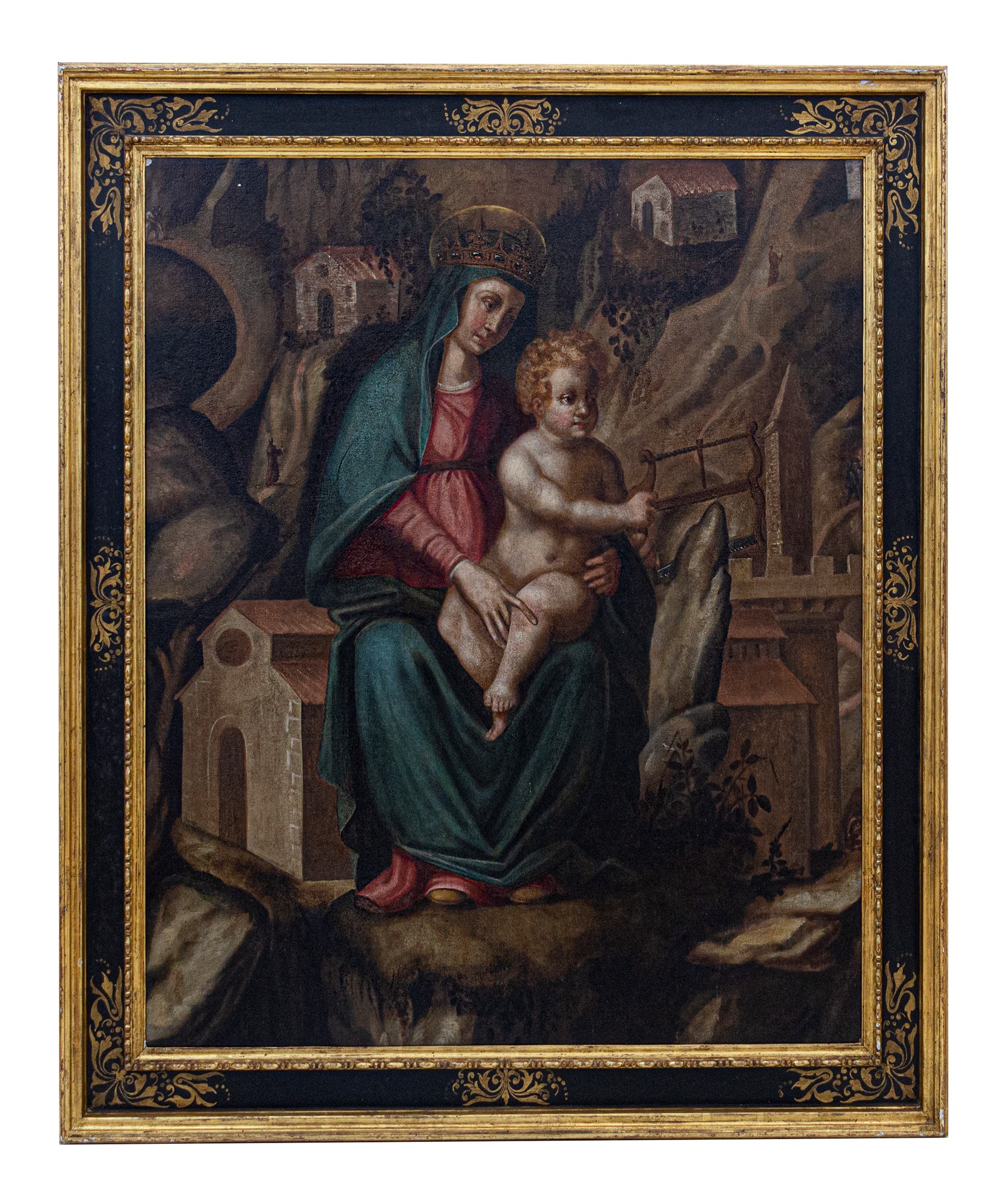Per l'iconografia mariana si confronti l'effigie sul portale della chiesa della nazione spagnola a Roma, in via di Monserrato, dove, come nel quadro esaminato, il Bambin Gesù è intento a tagliare una roccia con una sega da falegname